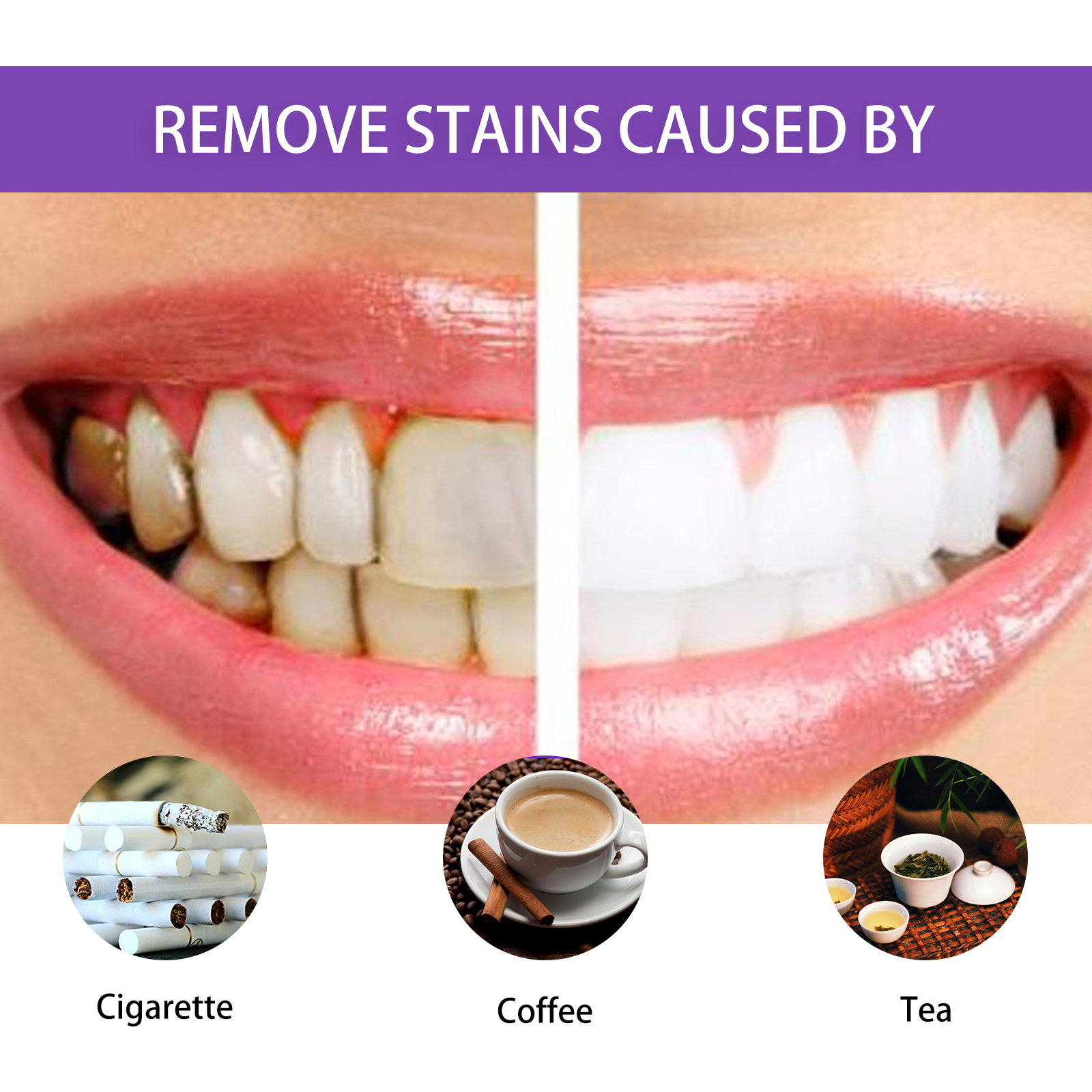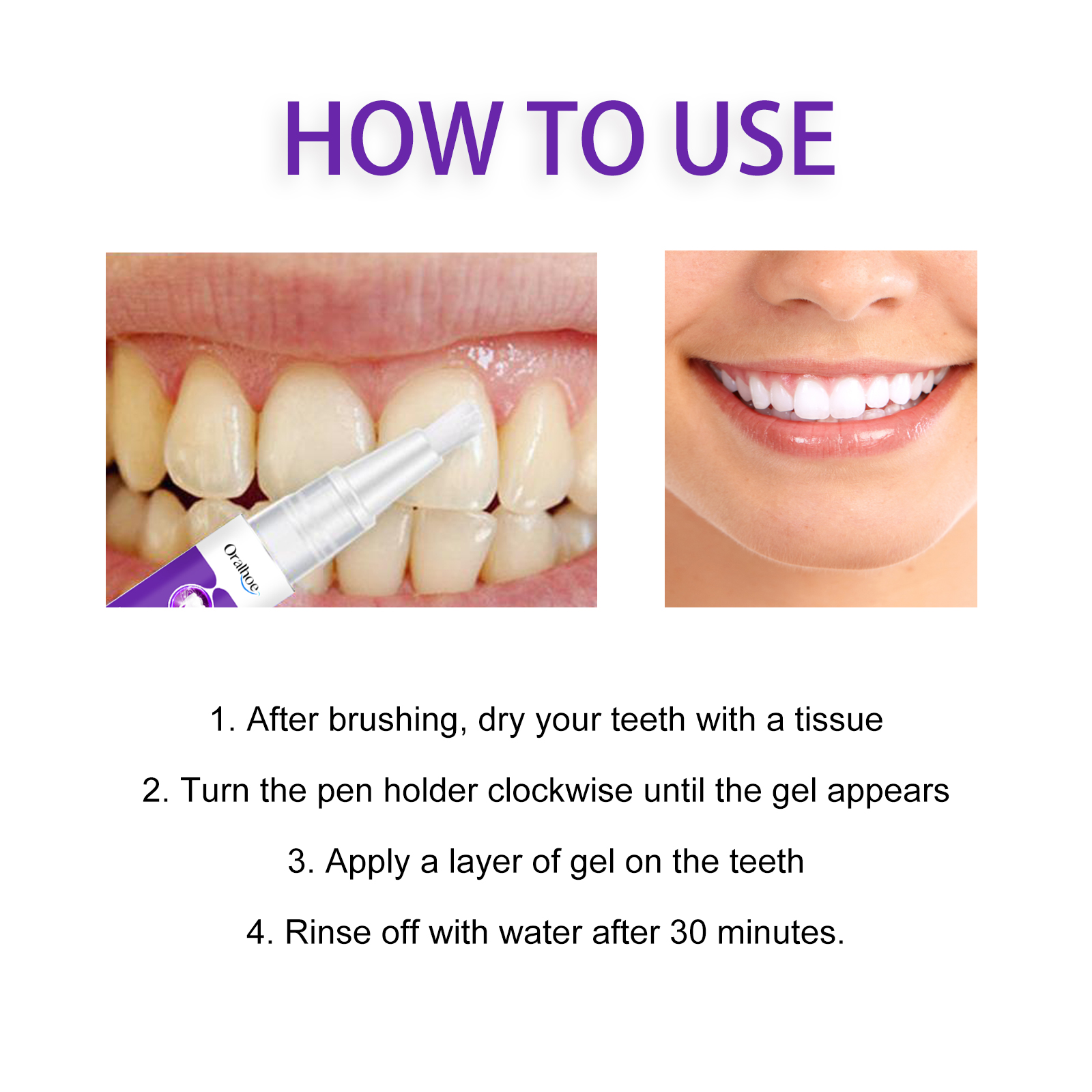 我们的紫色牙齿焕白笔含有薄荷叶提取物、金洋甘菊提取物、库拉索芦荟叶提取物。它可以增强牙龈和牙齿之间的附着力,帮助维护口腔健康,有效减少牙龈不适,并提供一个舒适口腔环境。它的使用方法很简单:刷完牙后,用纸巾擦干牙齿,顺时针旋转产品,直到凝胶出现,在牙齿上涂一层凝胶,30分钟后用清水冲洗干净即可。可以深入牙齿表面,有效去除牙渍及牙垢,令牙齿焕然一新。