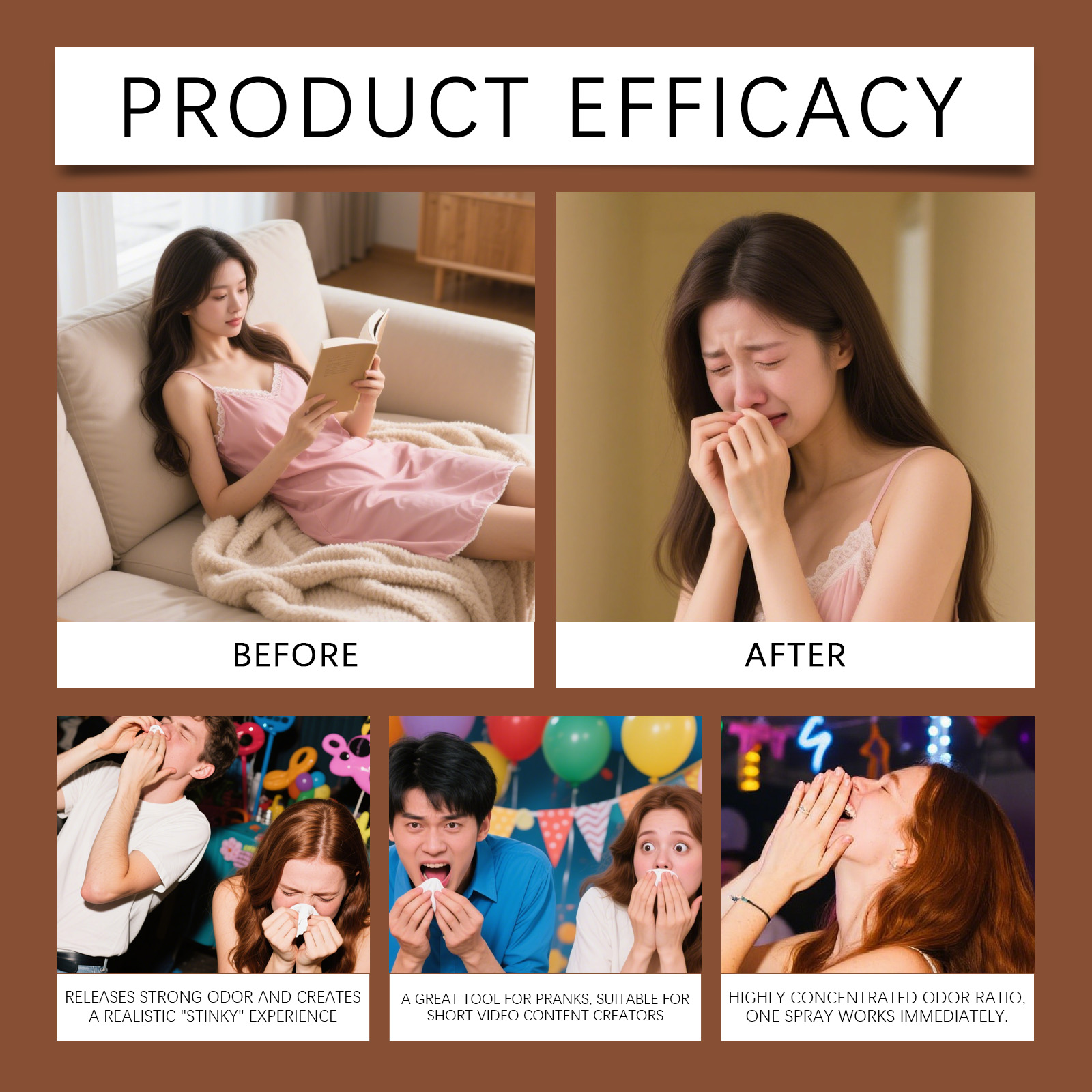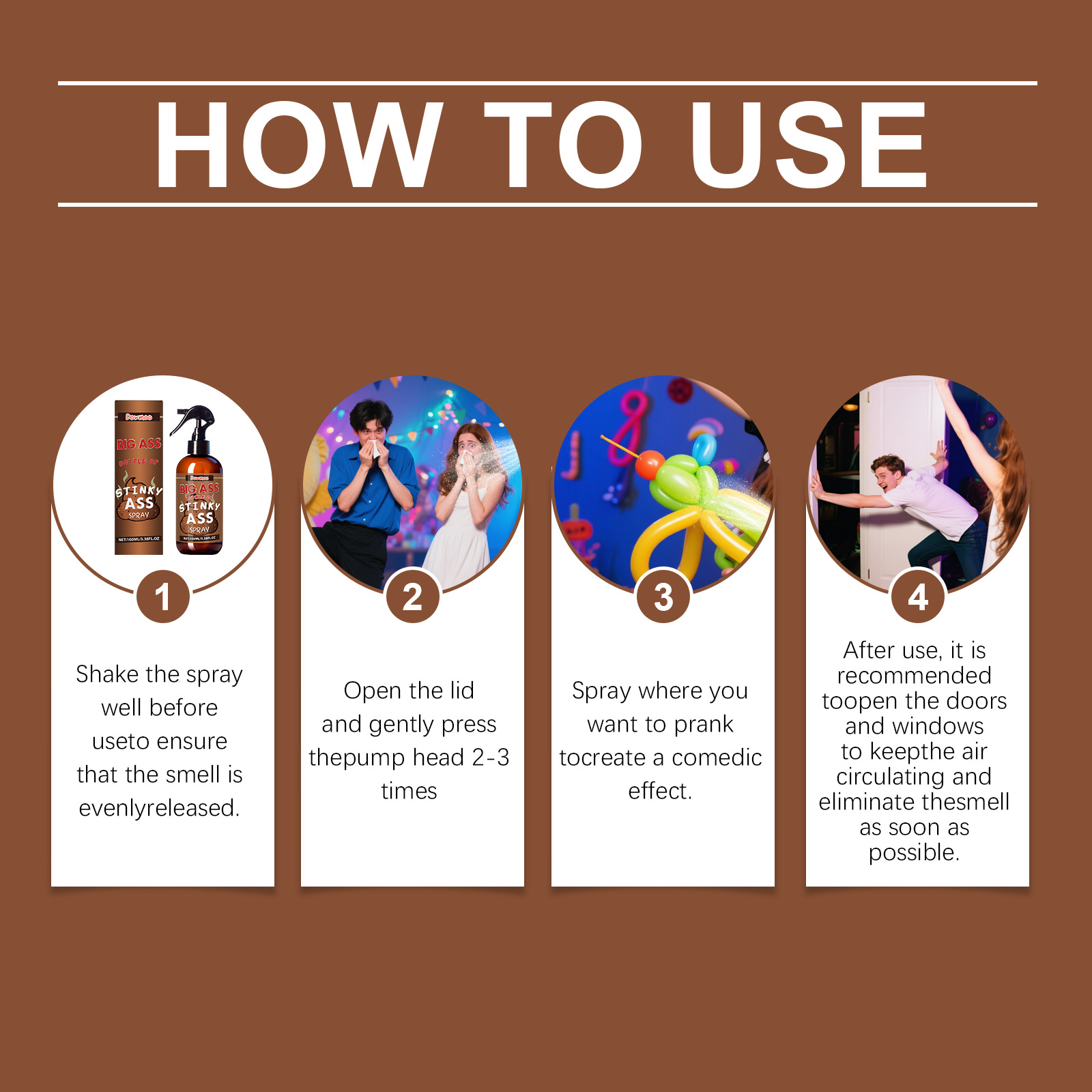 我们的臭屁喷雾,由1,2-己二醇、甲硫醇精心调配而成。专为高度模拟真实气味,轻松营造有趣氛围设计。使用方法极为便捷:使用前,请充分摇匀喷雾,以确保香味均匀释放。打开盖子轻轻按压泵头2-3次。在你想恶作剧的地方喷洒,以制造喜剧效果。使用后,建议打开门窗保持空气流通,并尽快消除异味。并且适用于各种场合,随时带来愉快的体验。