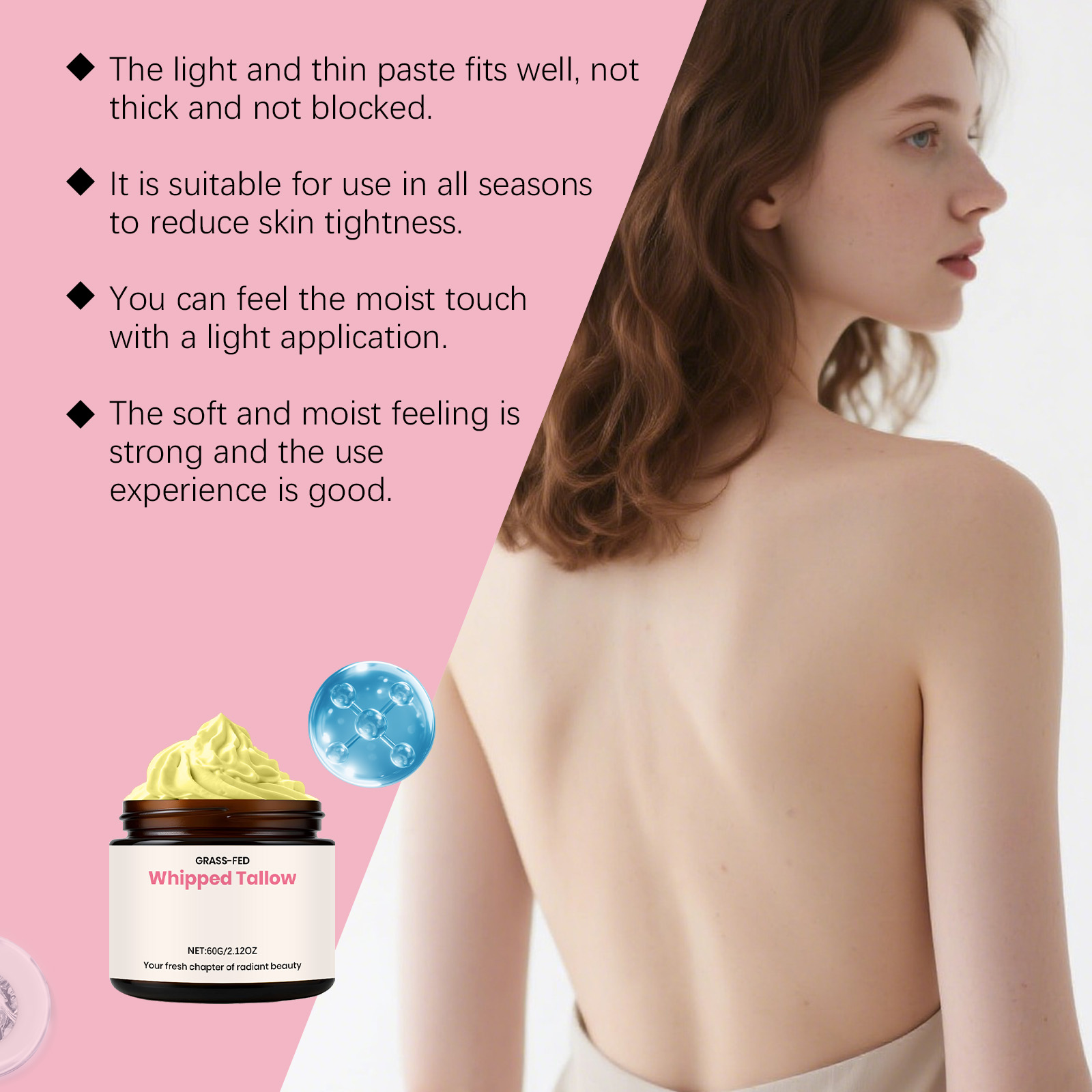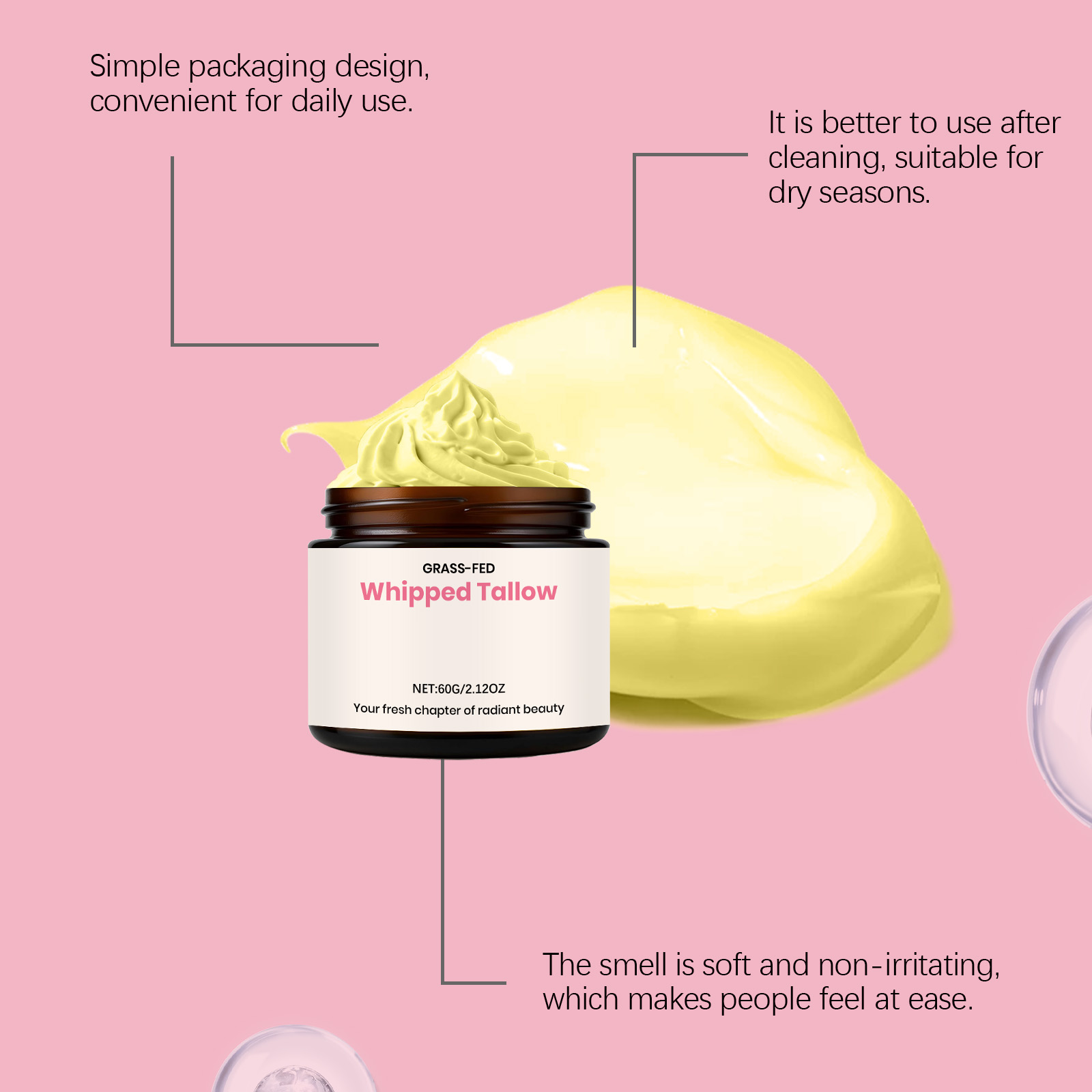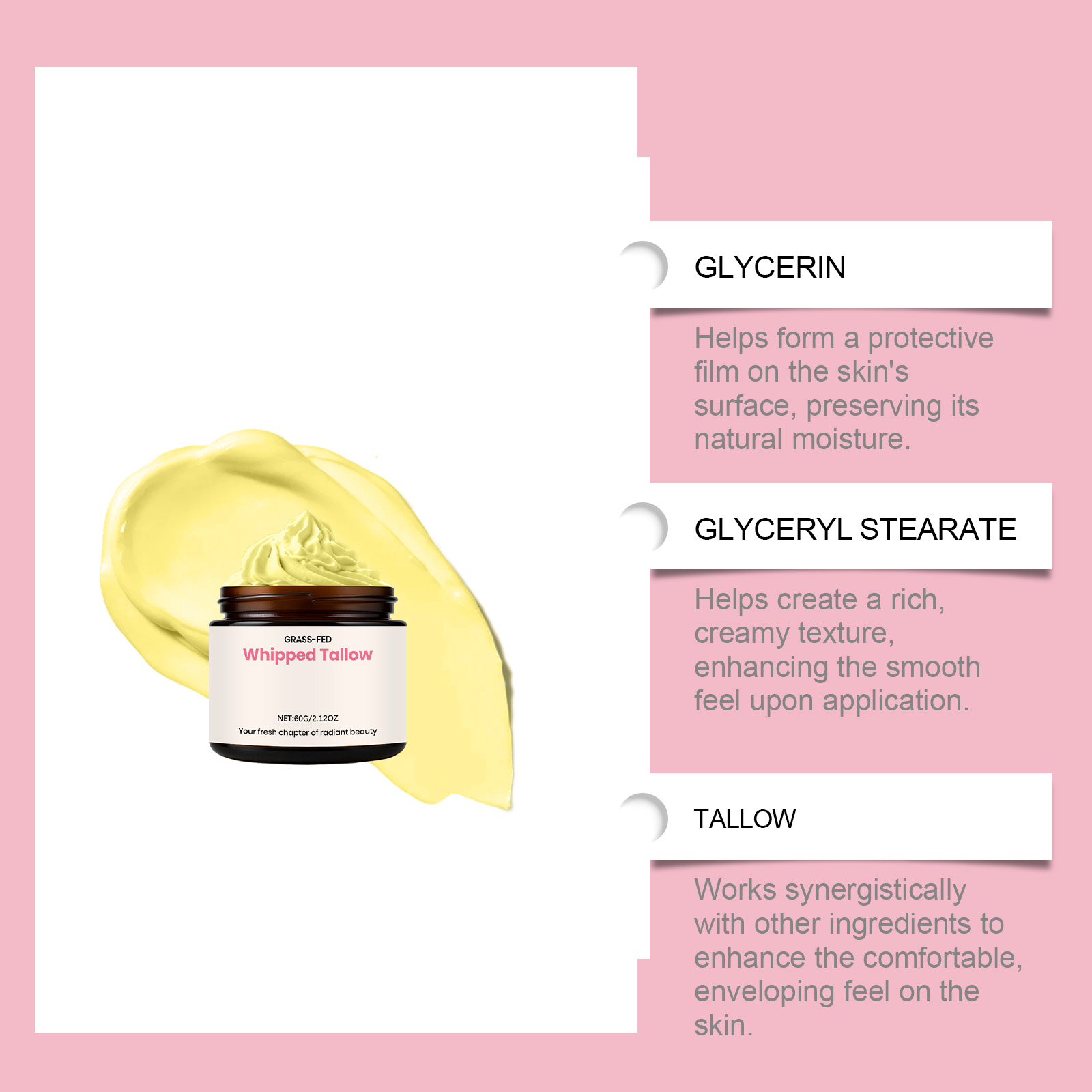 我们的牛脂保湿润肤霜,由甘油硬脂酸酯、1,2-己二醇精心调配而成。专为深层保湿,滋养肌肤设计。使用方法极为便捷:1.清洁并擦干身体。2.取适量本品均匀涂抹于身体,并轻轻按摩至吸收。并且可以修复干燥,改善肌肤。
