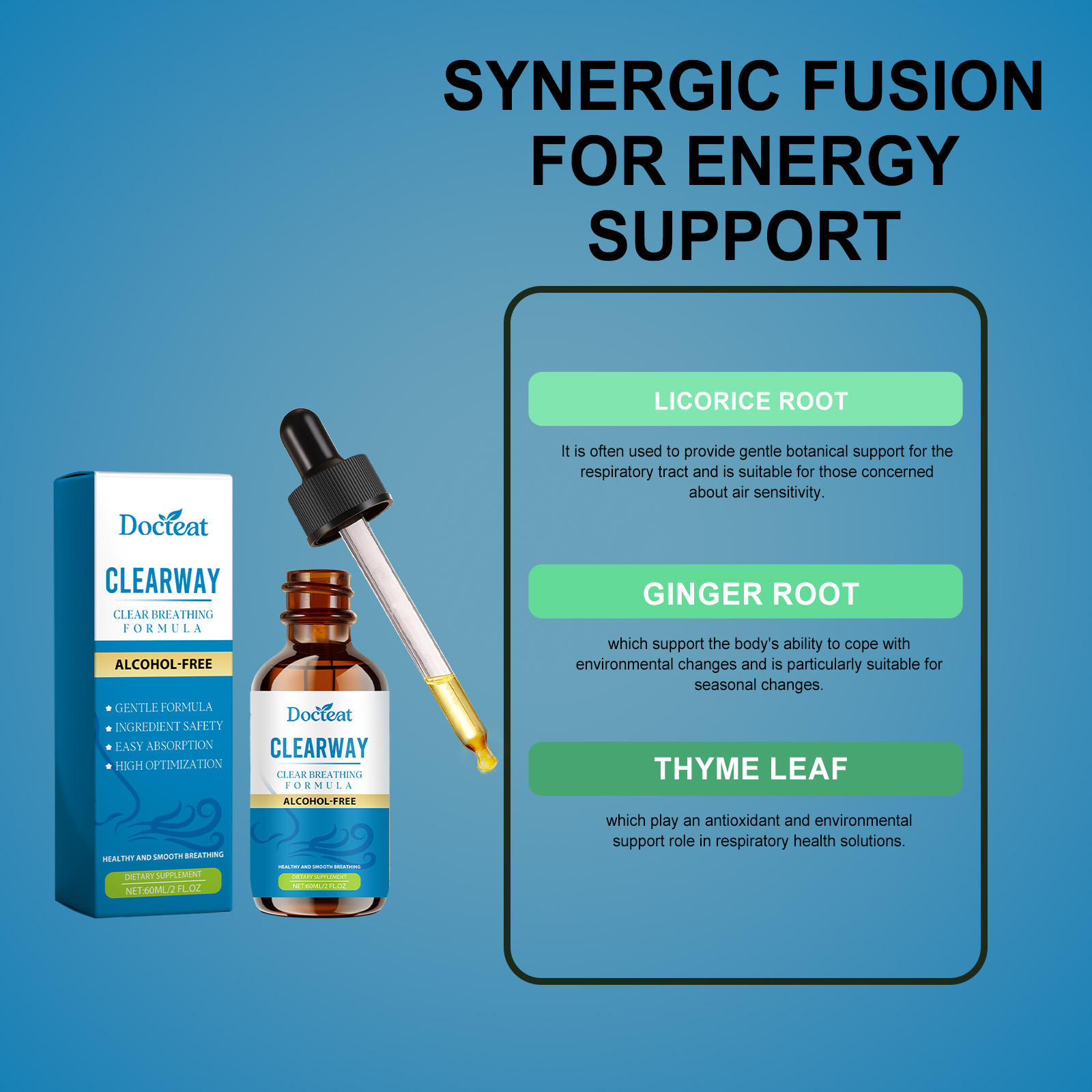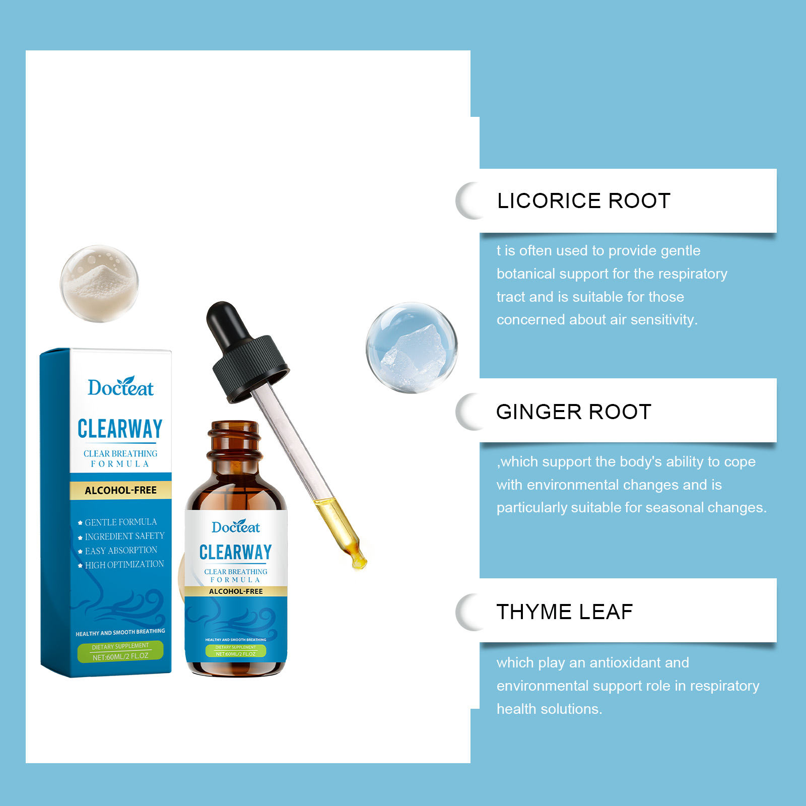 我们的身体护理滴剂,由甘草根、生姜根精心调配而成。专为清洁呼吸道,带来舒适的呼吸体验,独特的抗氧化剂组合调节内部平衡设计。使用方法极为便捷:一天2次,一次1ml,直接服用或与其他食物混合服用。并且它可以促进协同营养素利用并改善身体表现。