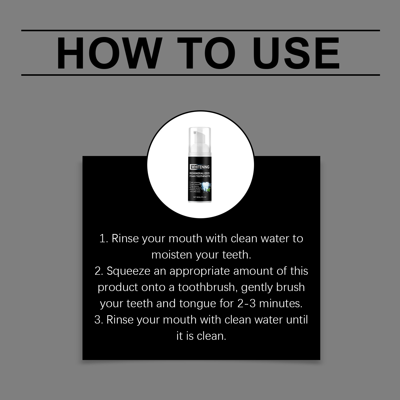 我们的亮白洁牙慕斯,由尿囊素、薄荷醇精心调配而成。专为使牙齿看起来更白设计。使用方法极为便捷:1.用清水漱口,以湿润牙齿。2.将适量本产品挤在牙刷上,轻轻刷牙和舌头2-3分钟。3.用清水漱口直至口腔干净。并且能使牙齿干净闪亮。