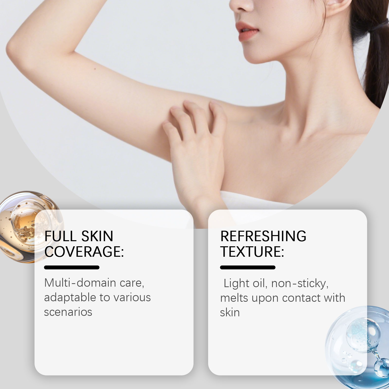 我们的身体毛发护理精油,由茶叶油、霍霍巴籽油精心调配而成。专为保湿、滋养和按摩设计。使用方法极为便捷:1.清洁并擦干皮肤。2.涂抹于手臂、腿部和腋下等皮肤区域,并按摩至吸收。并且易于吸收,不粘腻且无残留。