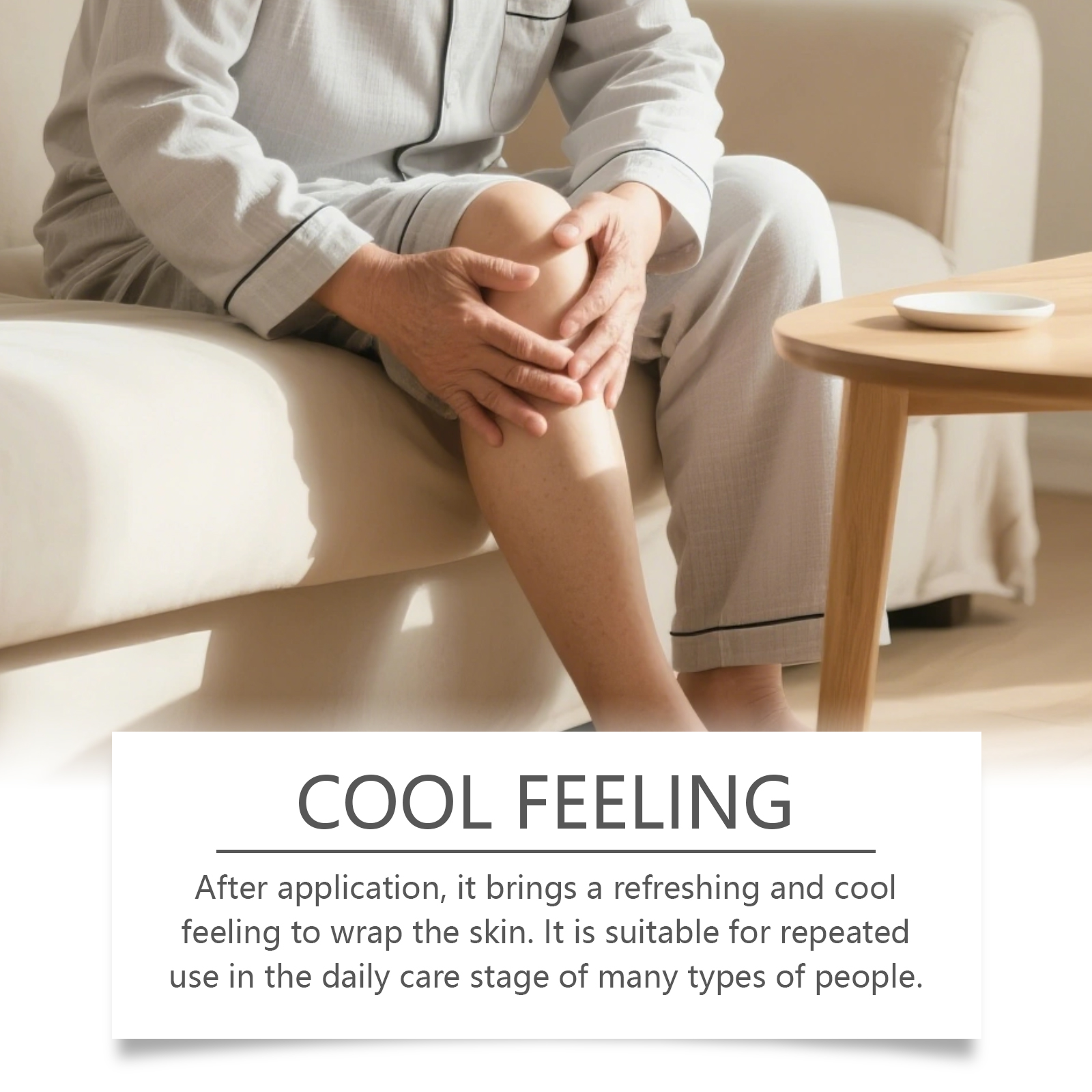 我们的关节按摩精华液,由甘油、1,2-己二醇精心调配而成。专为提供清凉感,涂抹后舒缓肌肤,调理肌肤并增强局部舒适感设计。使用方法极为便捷:1.清洁皮肤并保持干燥。2.取适量本品均匀涂抹于关节。3.轻柔按摩促进吸收。并且它可以带来清爽凉爽的感觉包裹肌肤,适合在日常护理阶段多次使用于多种人群。