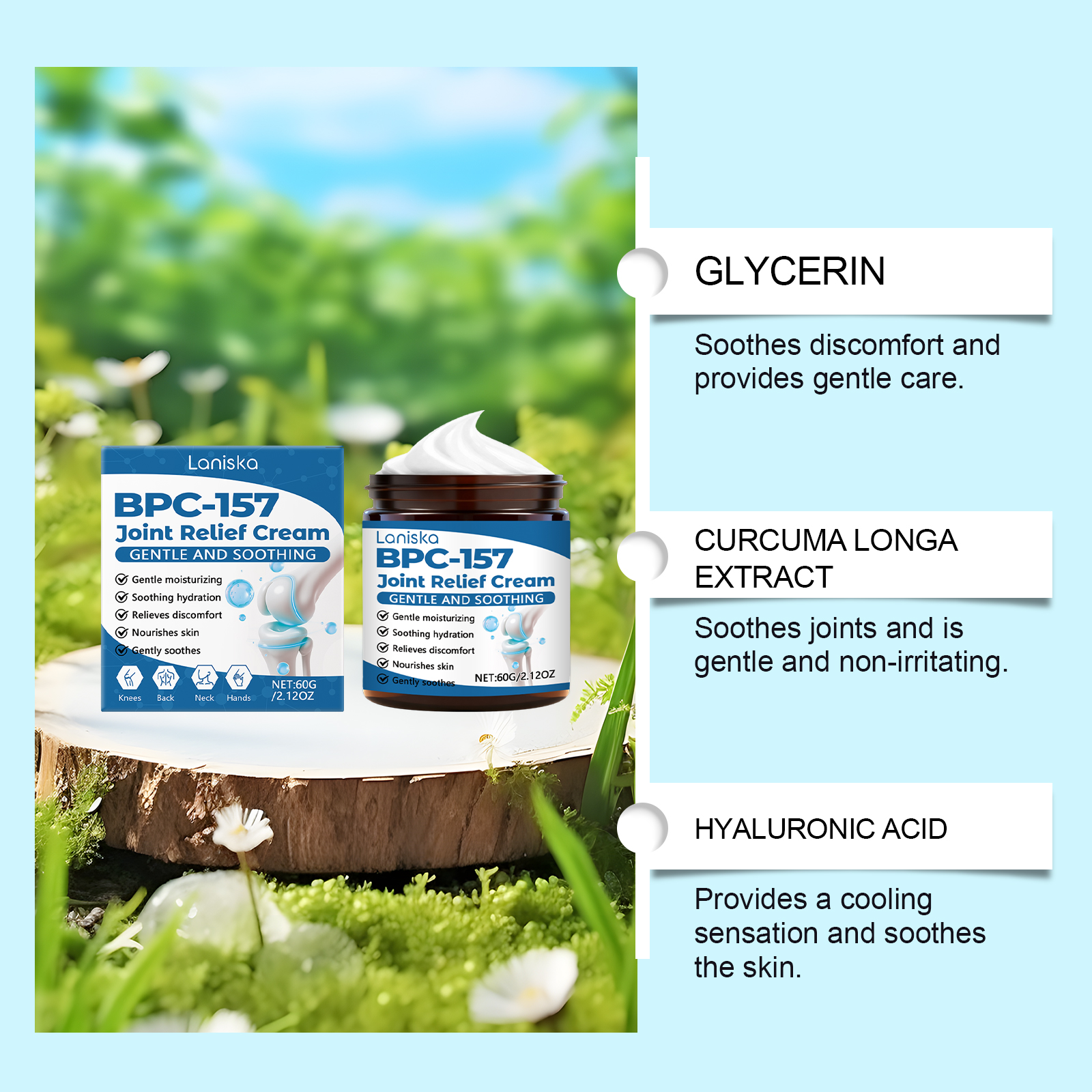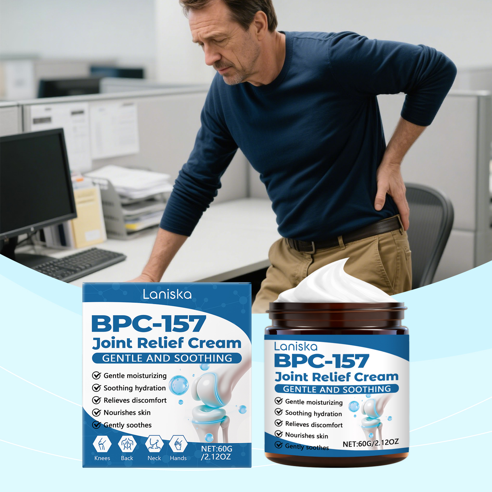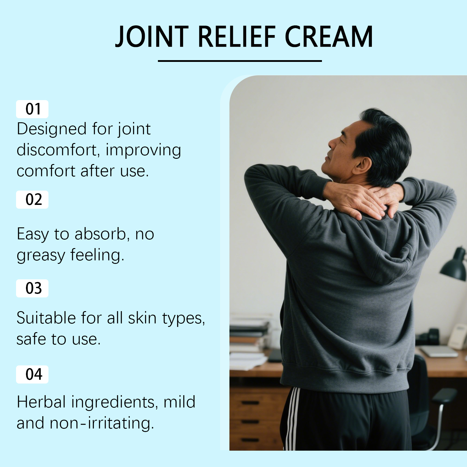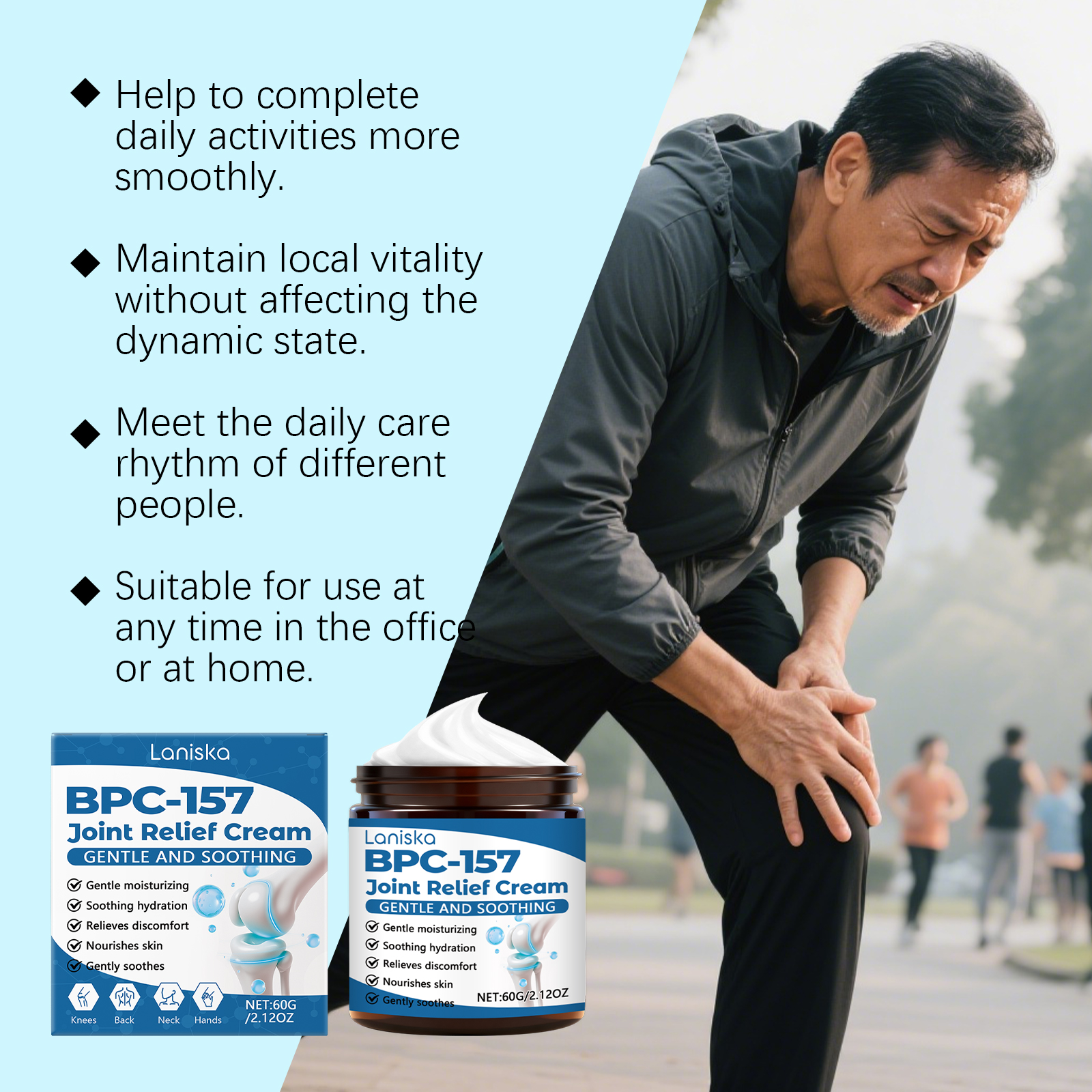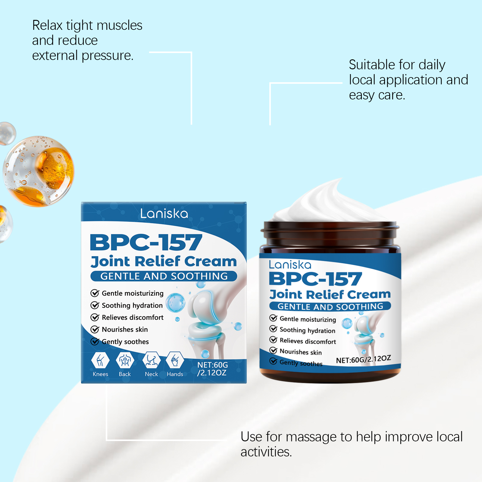 我们的关节护理霜,由姜黄提取物、葡糖胺精心调配而成。专为放松关节周围的紧张肌肉,舒适度翻倍,改善受影响区域的血液循环并恢复活力设计。使用方法极为便捷:清洁关节肌肤并保持干燥;取黄豆粒大小的本品涂抹至关节皮肤表面,轻柔按摩直至吸收。并且它可以使关节更加灵活,可以自由活动。