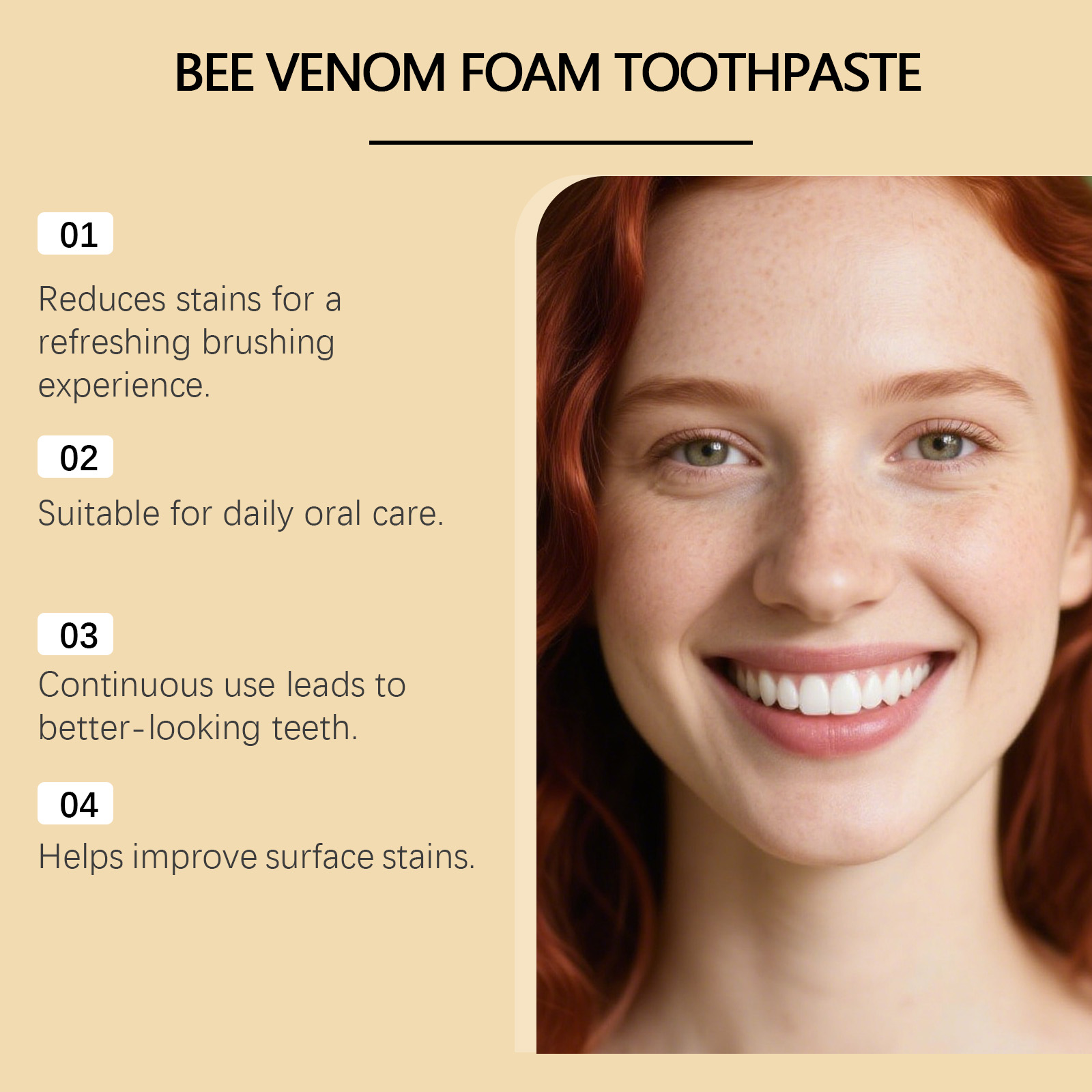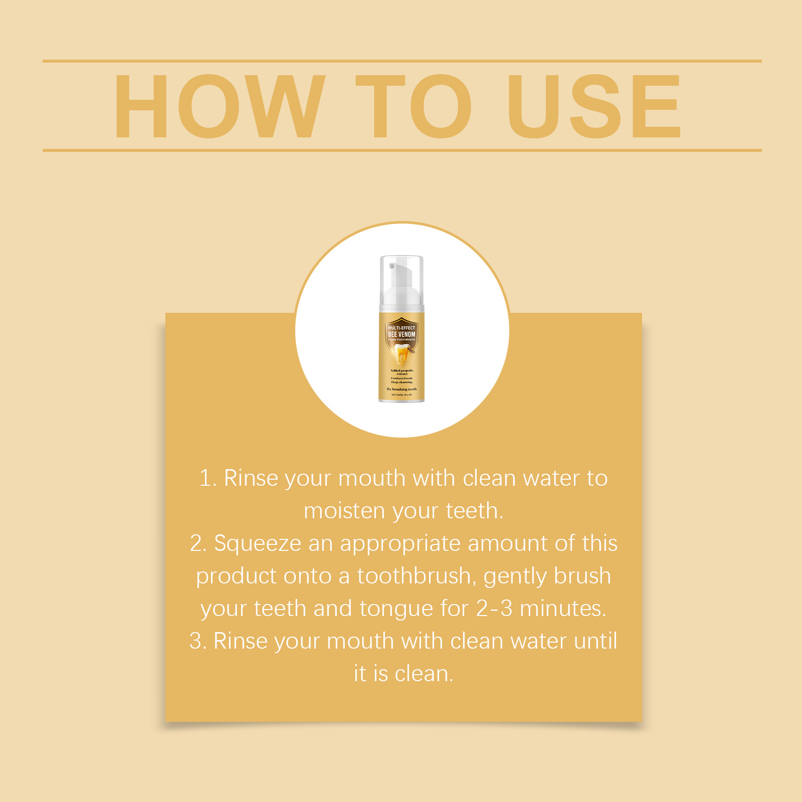 我们的蜂毒洁牙慕斯,由蜂毒、蜂胶提取物精心调配而成。专为使牙齿看起来更白设计。使用方法极为便捷:1.用清水漱口,以湿润牙齿。2.将适量本产品挤在牙刷上,轻轻刷牙和舌头2-3分钟。3.用清水漱口直至口腔干净。并且可以使牙齿干净闪亮。