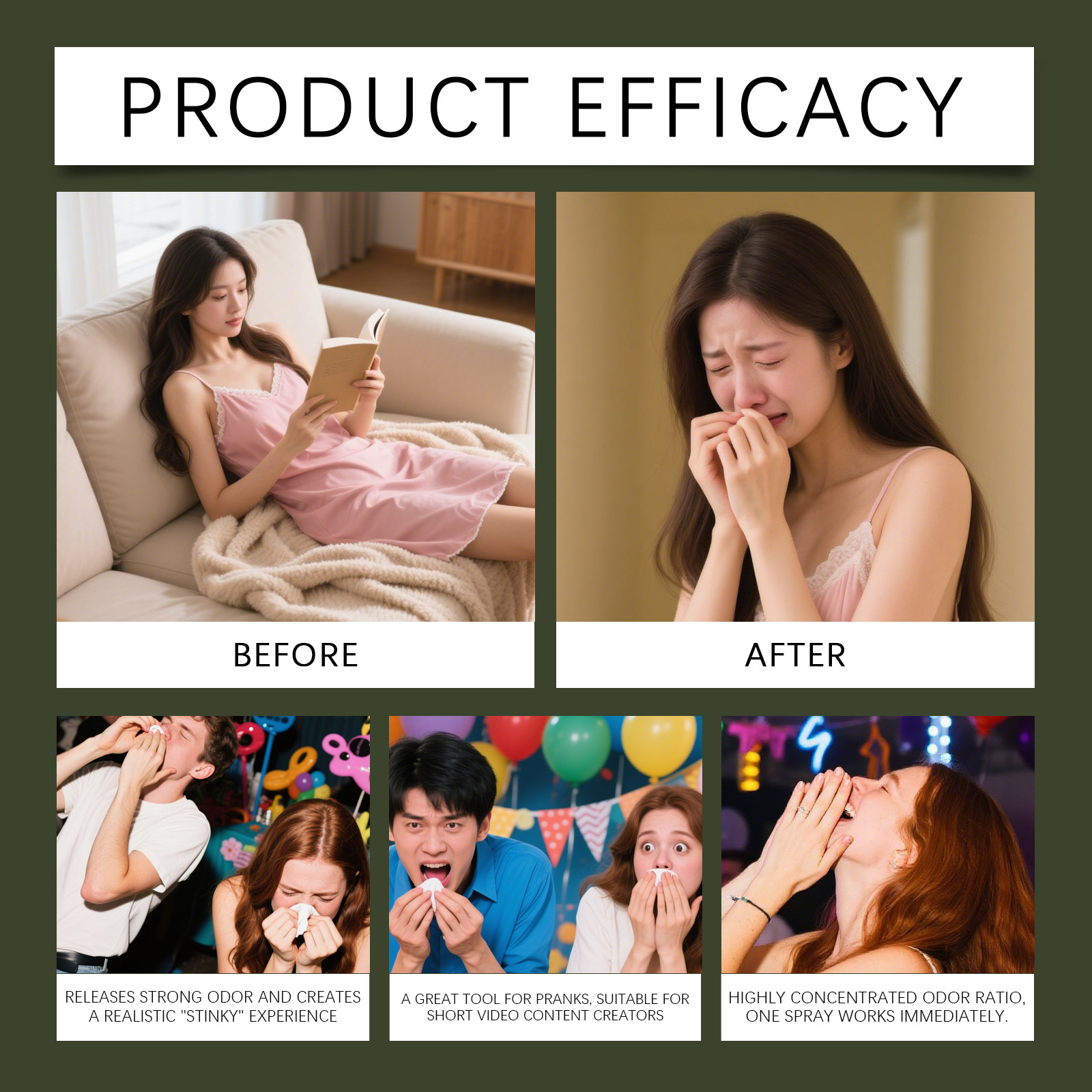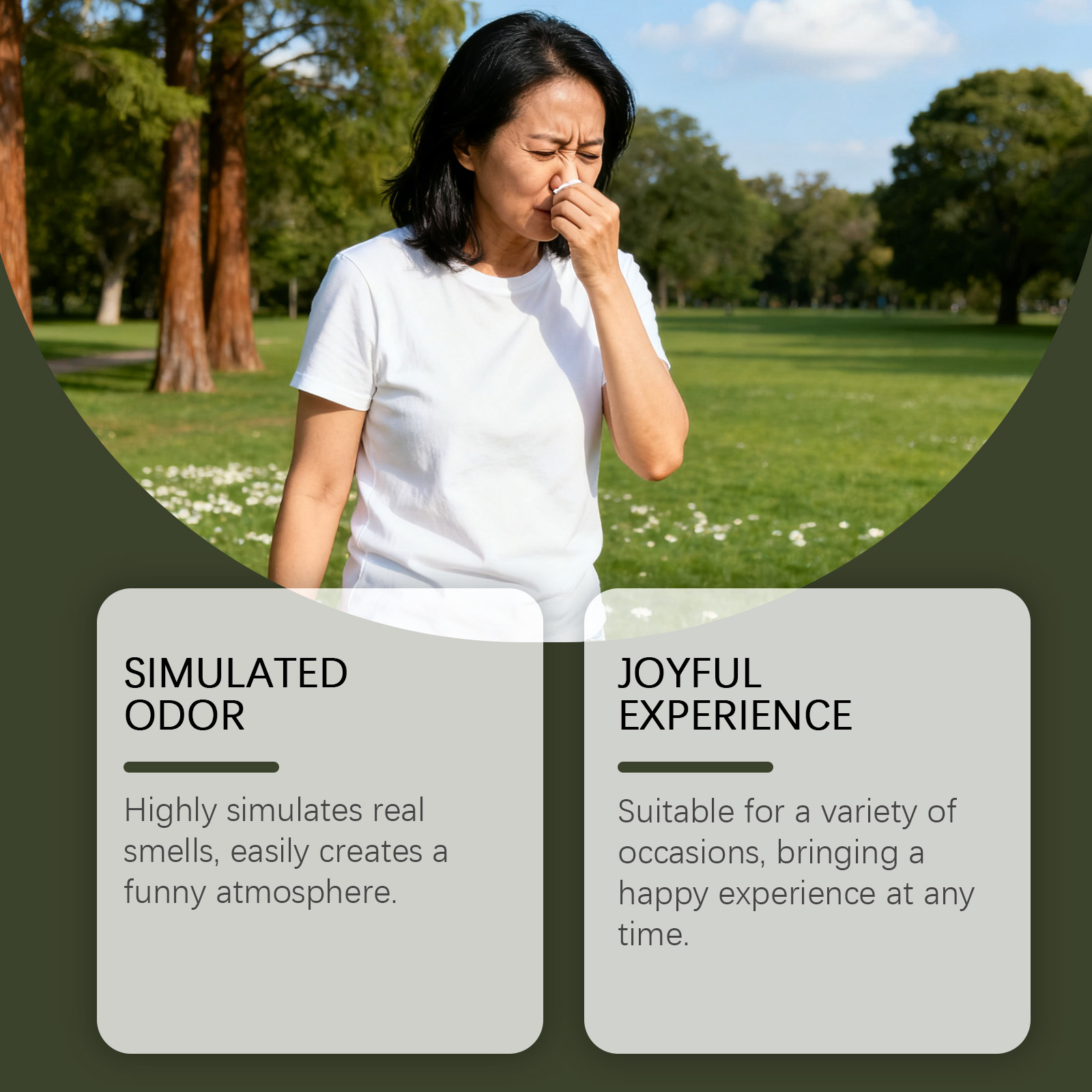 我们的臭屁味喷雾,由1,2-己二醇、甲硫醇精心调配而成。专为高度模拟真实气味,轻松营造有趣氛围设计。使用方法极为便捷:使用前,请充分摇匀喷雾,以确保香味均匀释放。打开盖子,轻轻按压泵头2-3次。在你想恶作剧的地方喷洒,以制造喜剧效果。使用后,建议打开门窗,以保持空气流通,并尽快消除异。并且适用于多种场合,随时随地带来快乐体验。