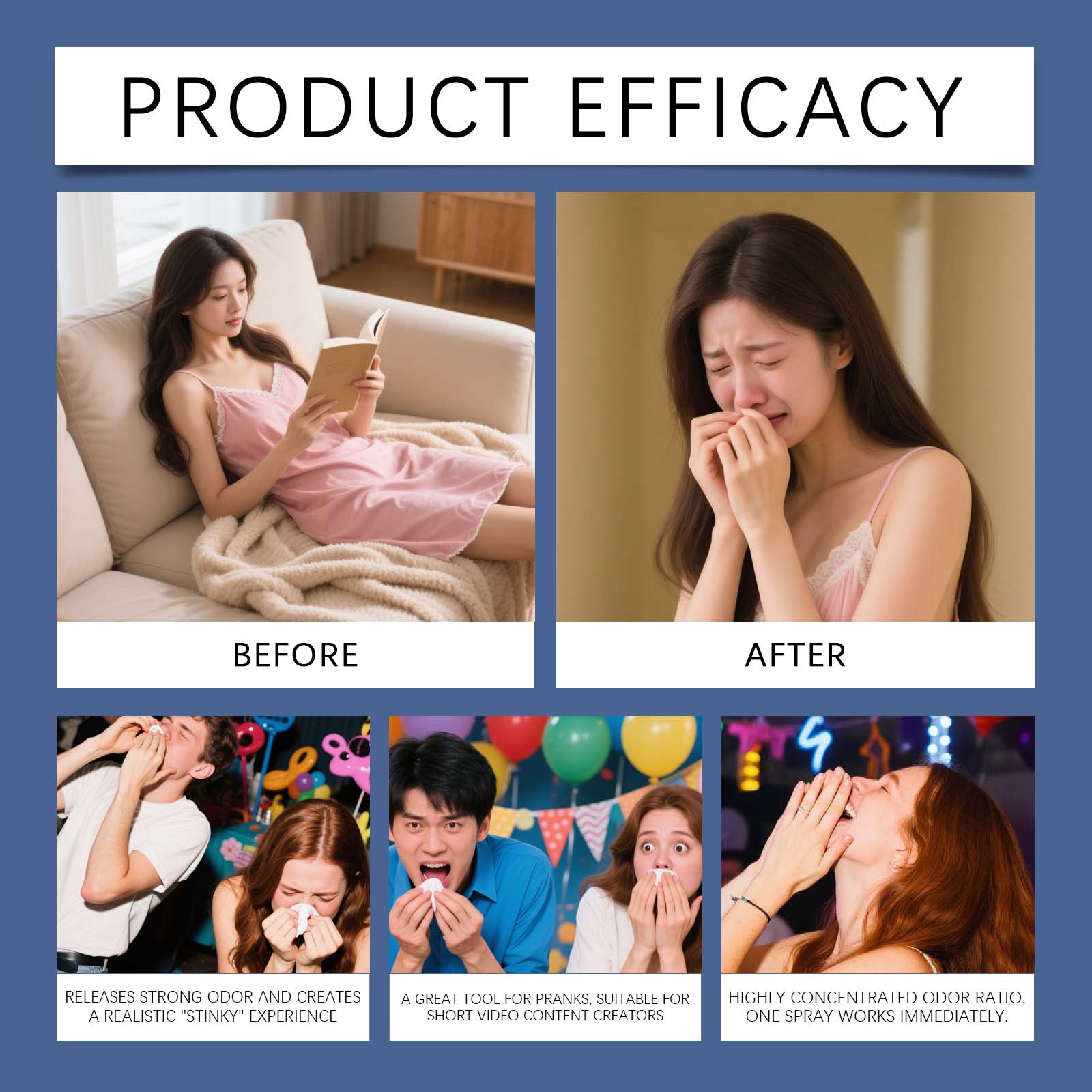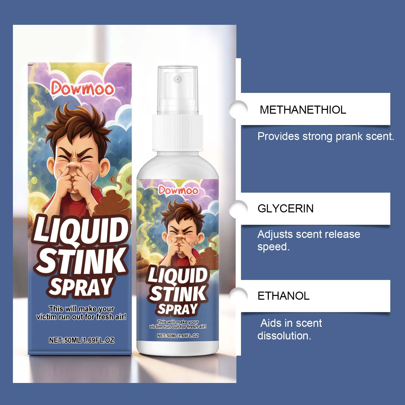 我们的臭屁味喷雾,由1,2-己二醇、甲硫醇精心调配而成。专为聚会增添欢乐设计。使用方法极为便捷:使用前请充分摇匀喷雾,以确保香味均匀释放。打开盖子,轻轻按压泵头2-3次。喷洒在你想恶作剧的地方,以制造喜剧效果。使用后,建议打开门窗,以保持空气流通,并尽快消除气味。并且它具有明显的恶作剧效果。