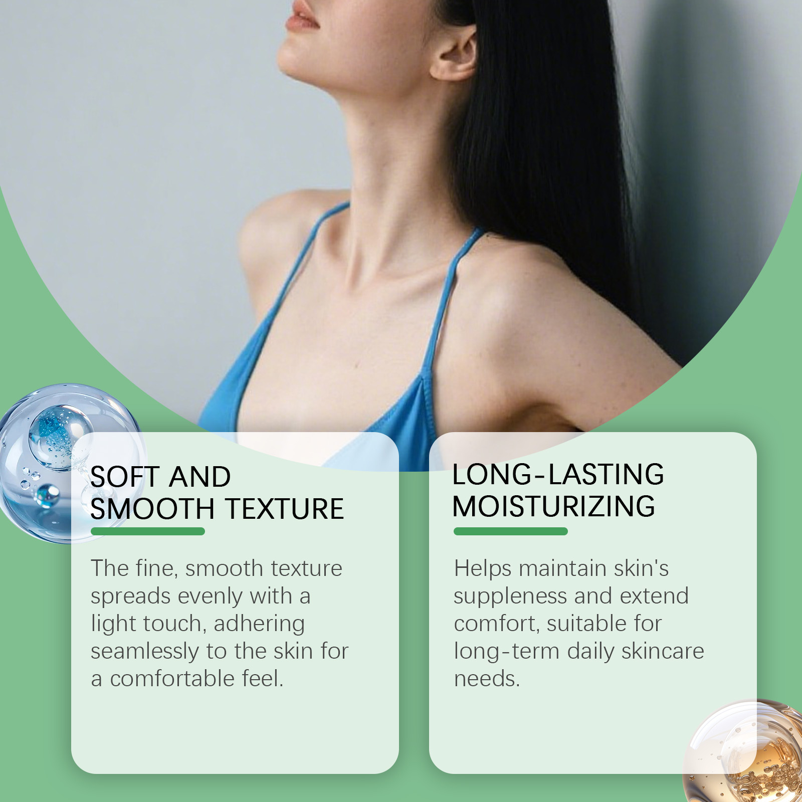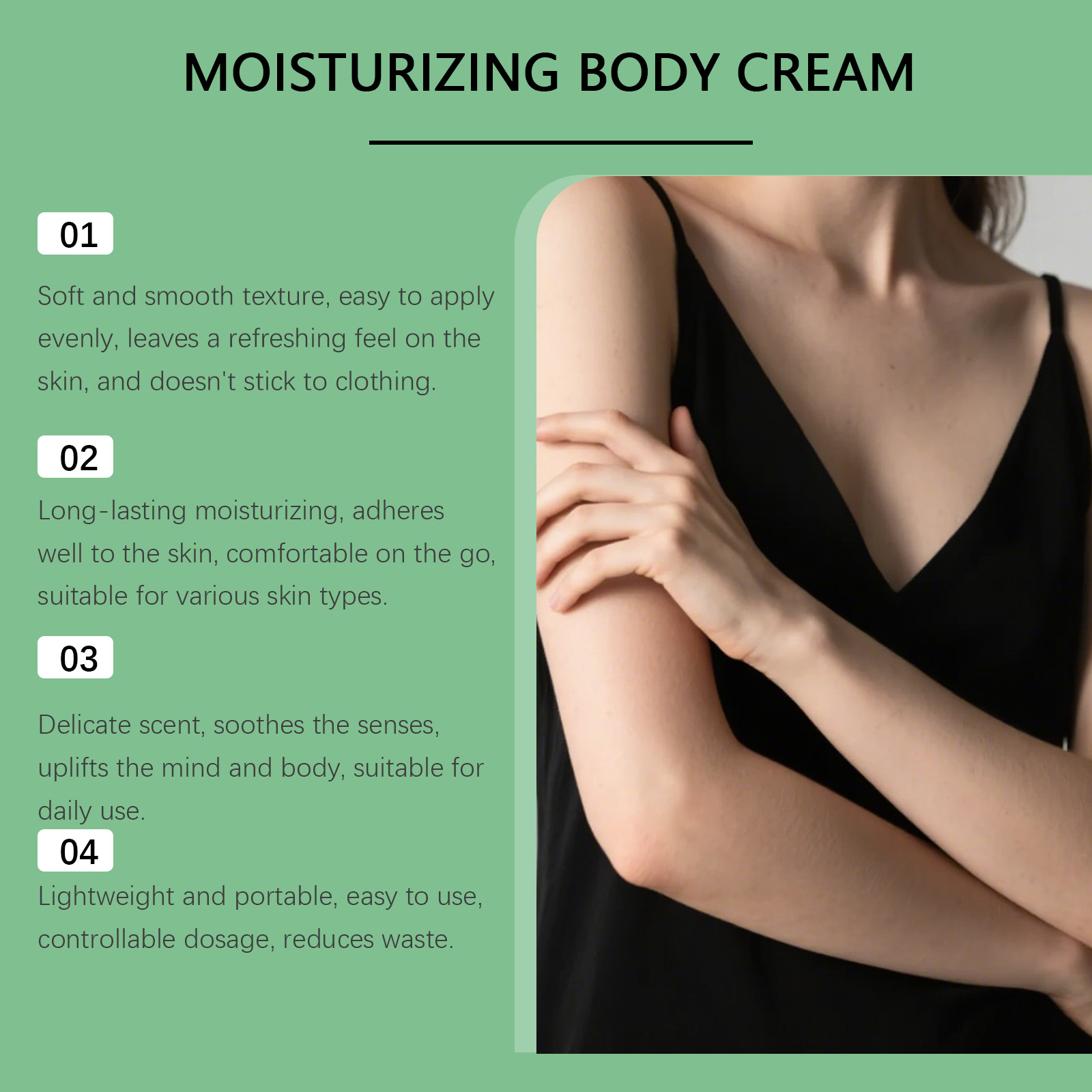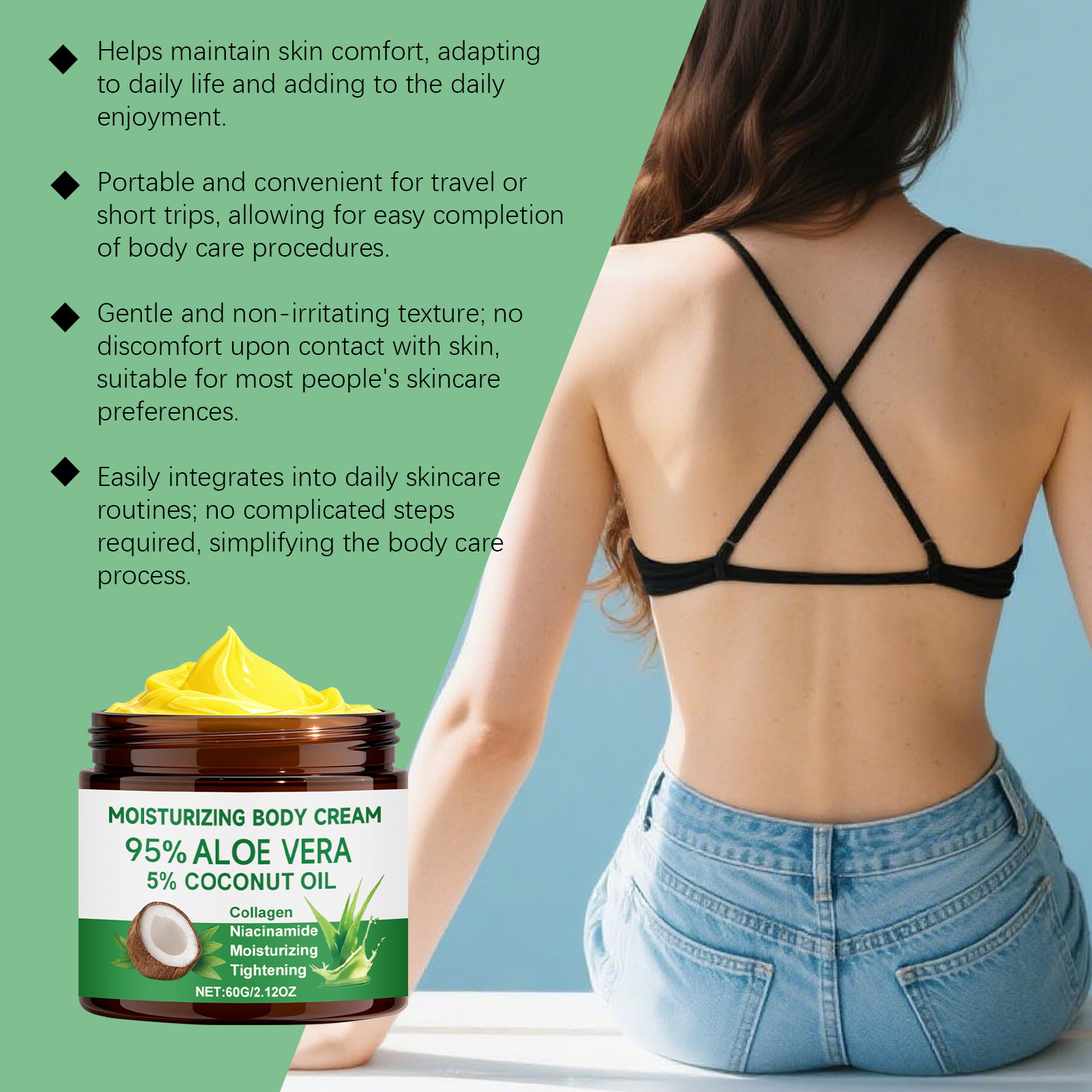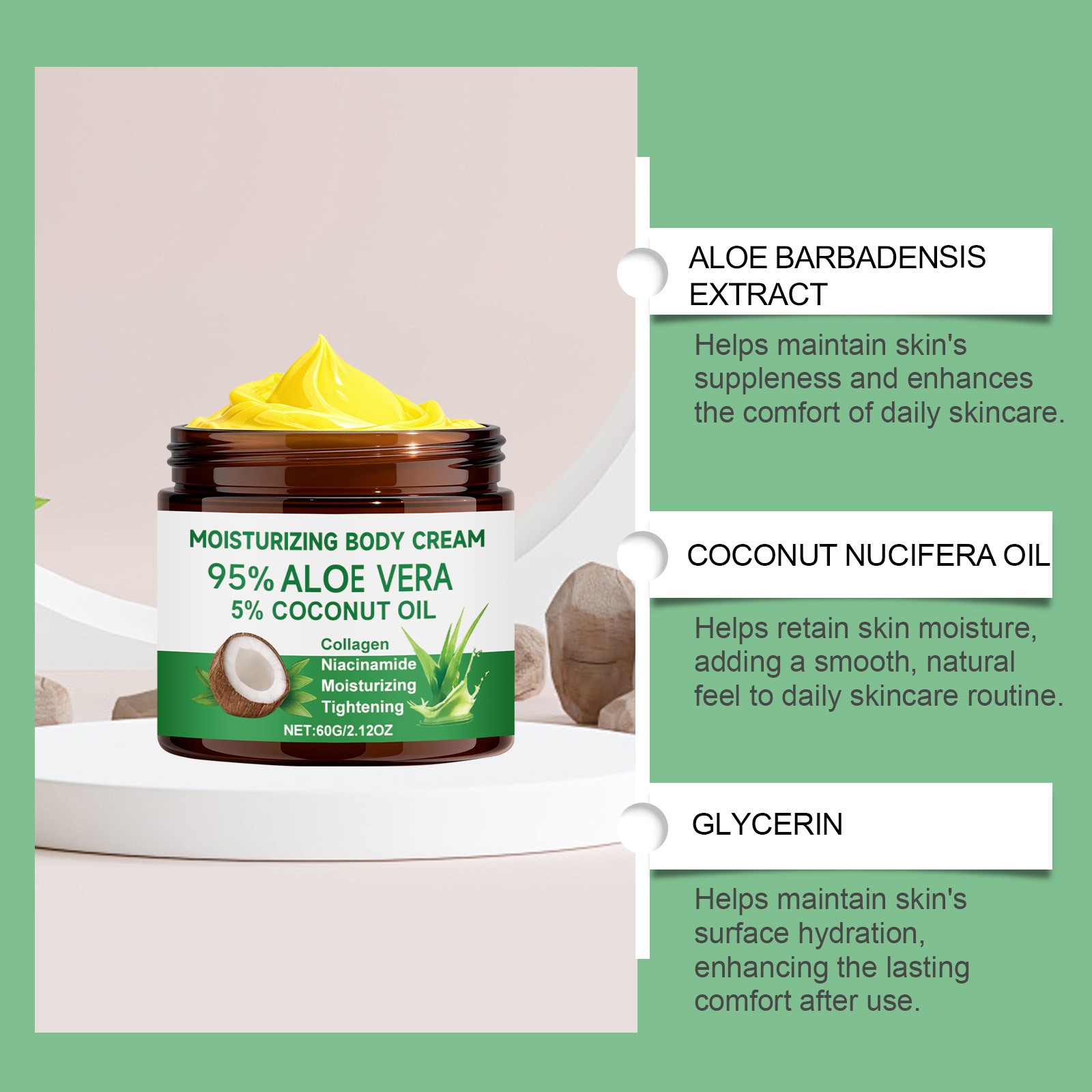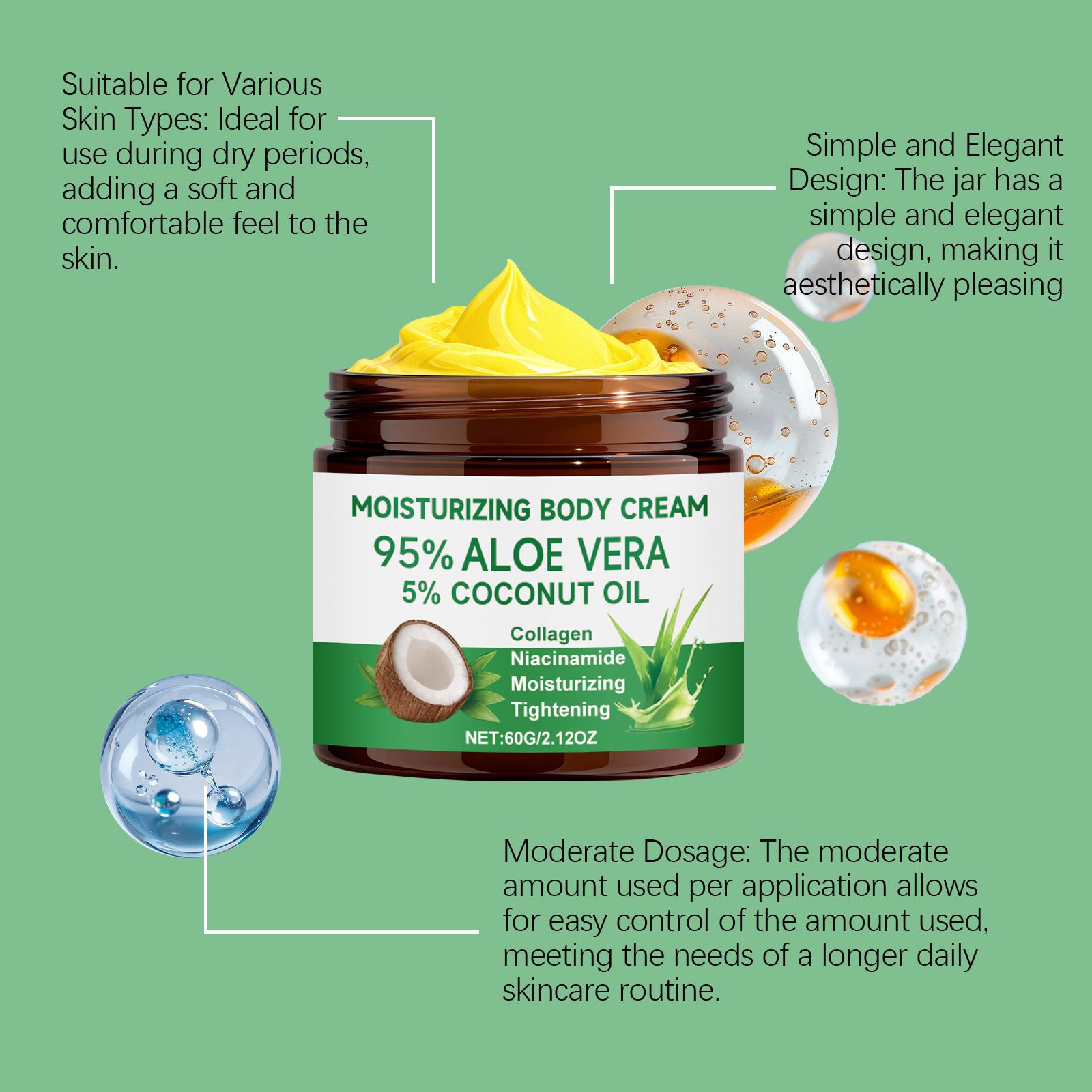 我们的芦荟保湿身体霜,由库拉索芦荟提取物、椰子油精心调配而成。专为持肌肤柔嫩并延长舒适感设计。使用方法极为便捷:1.清洁并擦干身体。2.将适量本产品均匀涂抹于身体,并轻轻按摩至吸收。并且使用后不会留下粘性残留物,使皮肤感觉清新透气,在日常活动中不会造成负担或干扰。