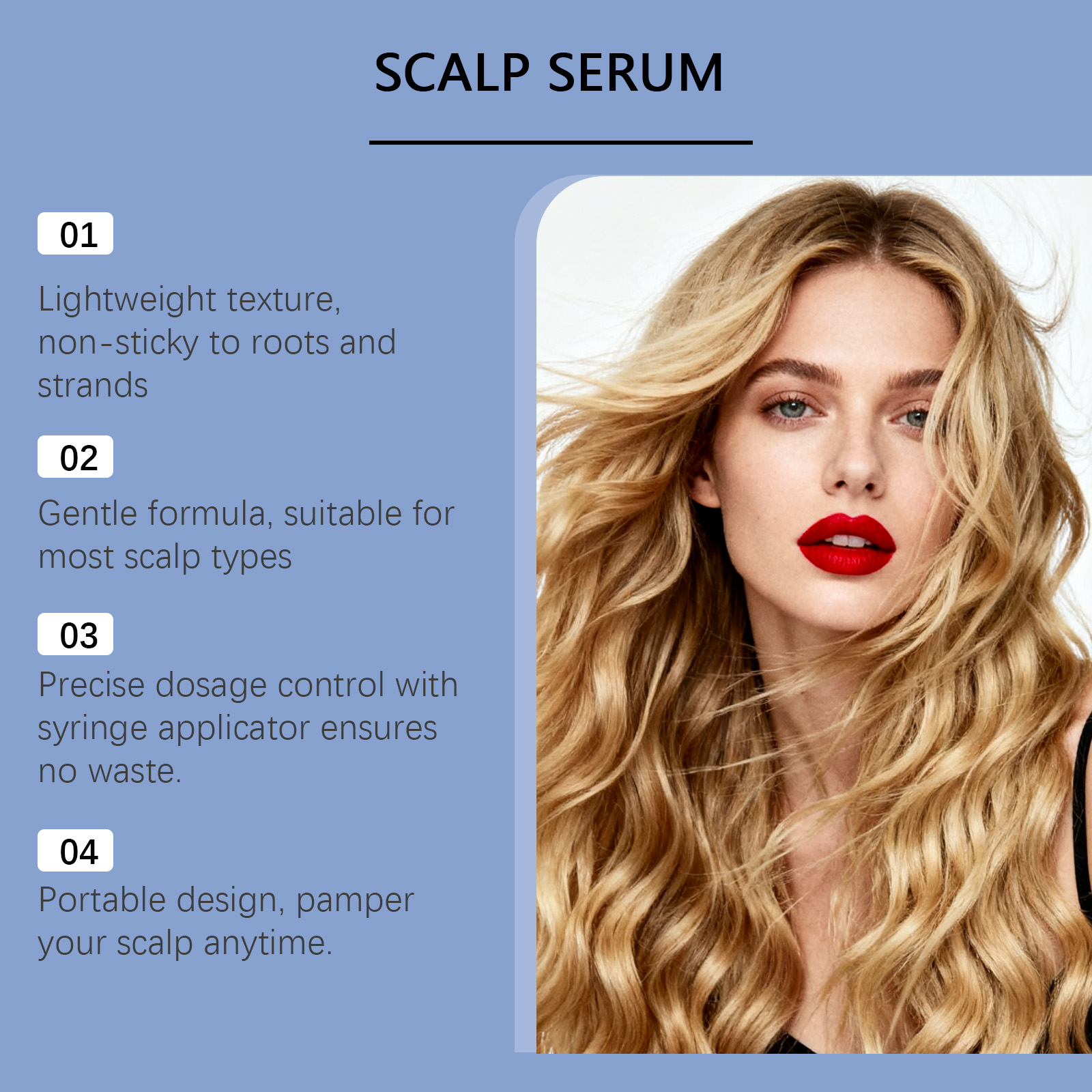 我们的头皮精华液,由甘油、氢化蓖麻油精心调配而成。专为头皮补充养分,维持舒适状态,助力头皮保持水润,减少干燥不适感设计。使用方法极为便捷:1.取下注射器的盖子,根据需要适量抽取血清。2. 用指尖轻轻按摩 10 秒钟,以帮助头皮吸收精华液。3. 使用完毕后无需冲洗;您可以立即进行发型造型。并且它可以帮助维持发根稳固,呈现健康观感,让头皮焕发清爽活力,发丝更显蓬松。