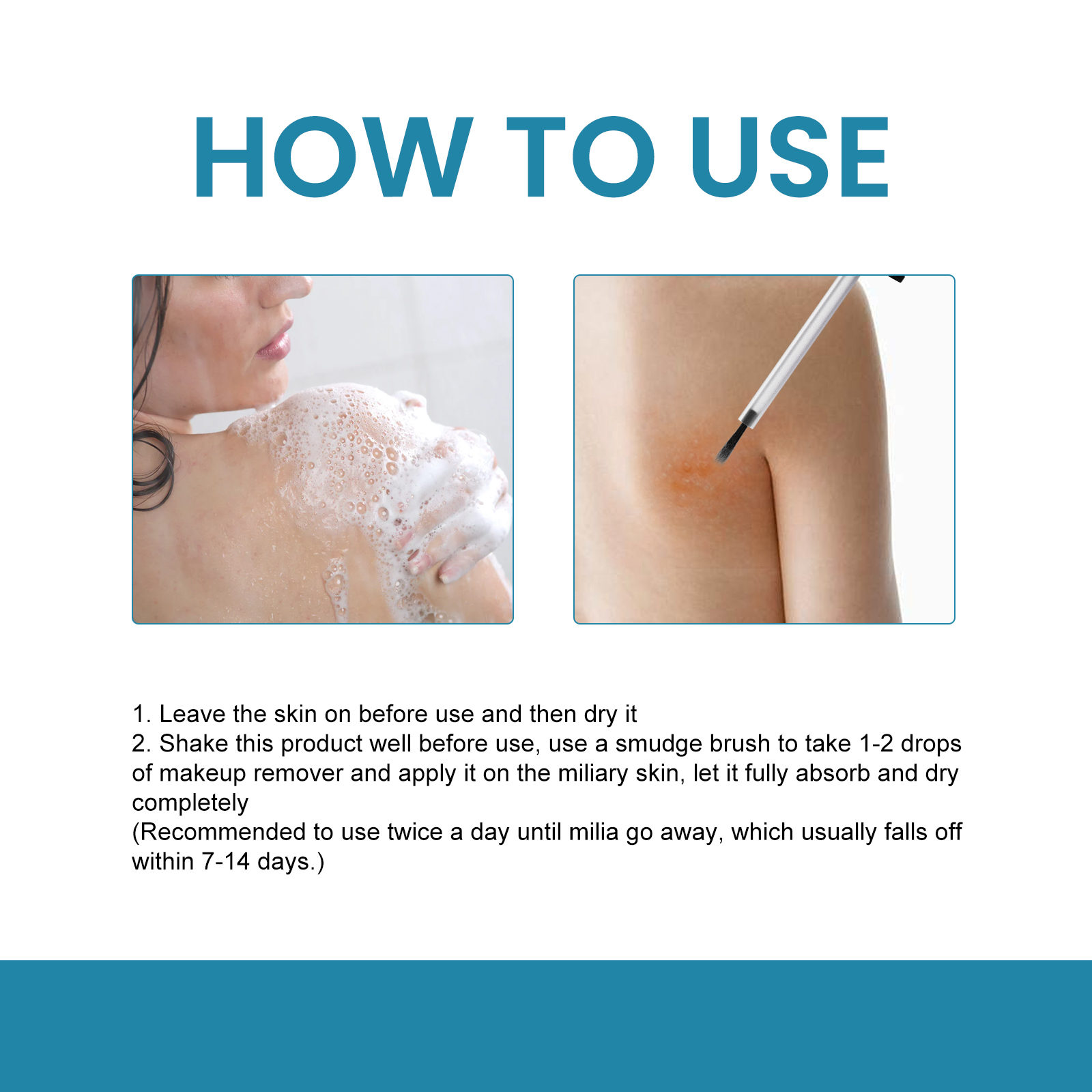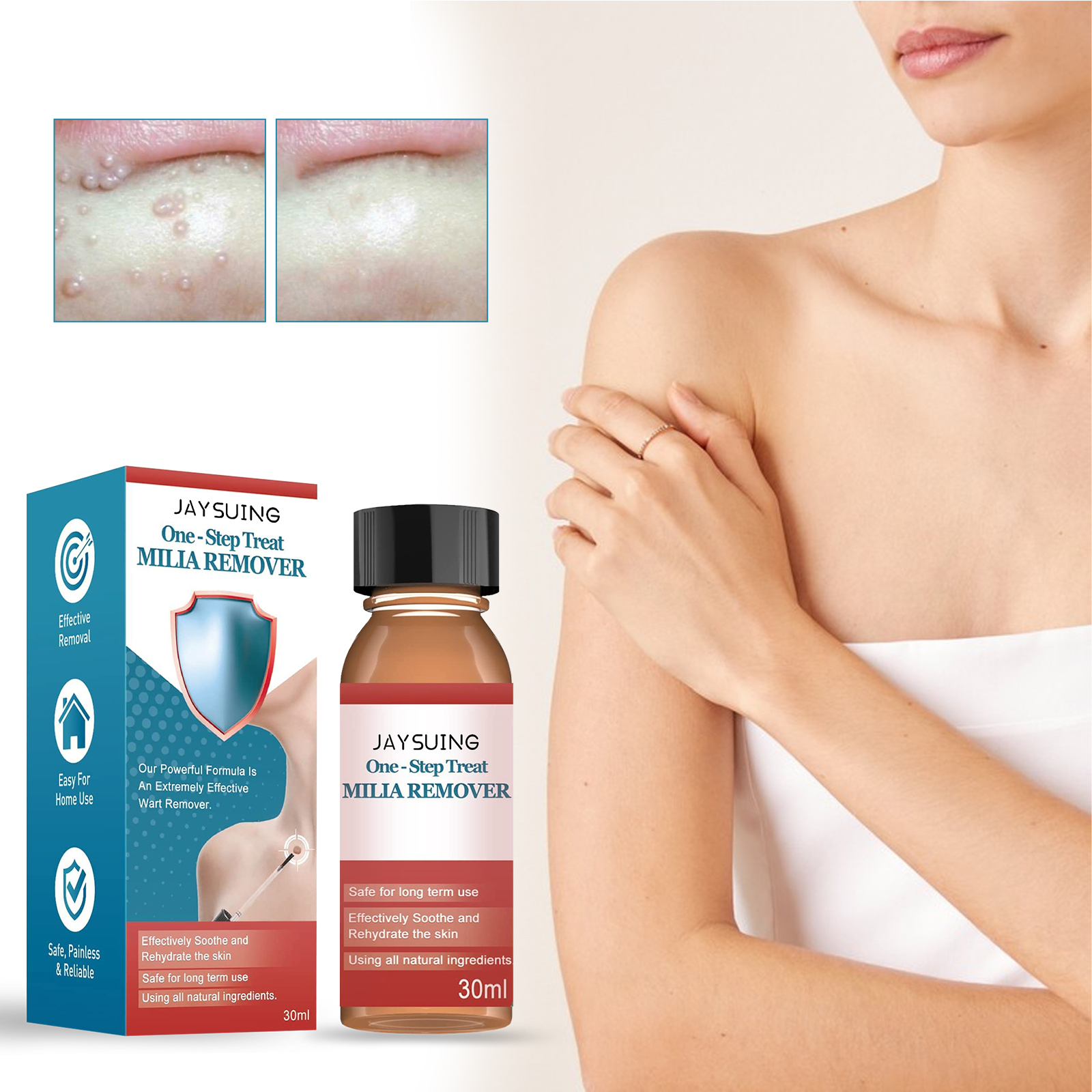 我们的皮肤修护液含有紫草,苦参、黄柏。它可以有助于恢复受感染的皮肤,防止其扩散,快速缓解疼痛,轻轻地保养你的皮肤。它的使用方法很简单:使用前保留皮肤,然后晾干,使用前将本品摇匀,用涂抹刷取1-2滴卸妆液涂抹在军性皮肤上,让其充分吸收并完全干燥(建议每天使用两次,直到粉刺消失,通常在7-14天内脱落)。去除粟粒疹,快速安全无痛,使用简单快捷。