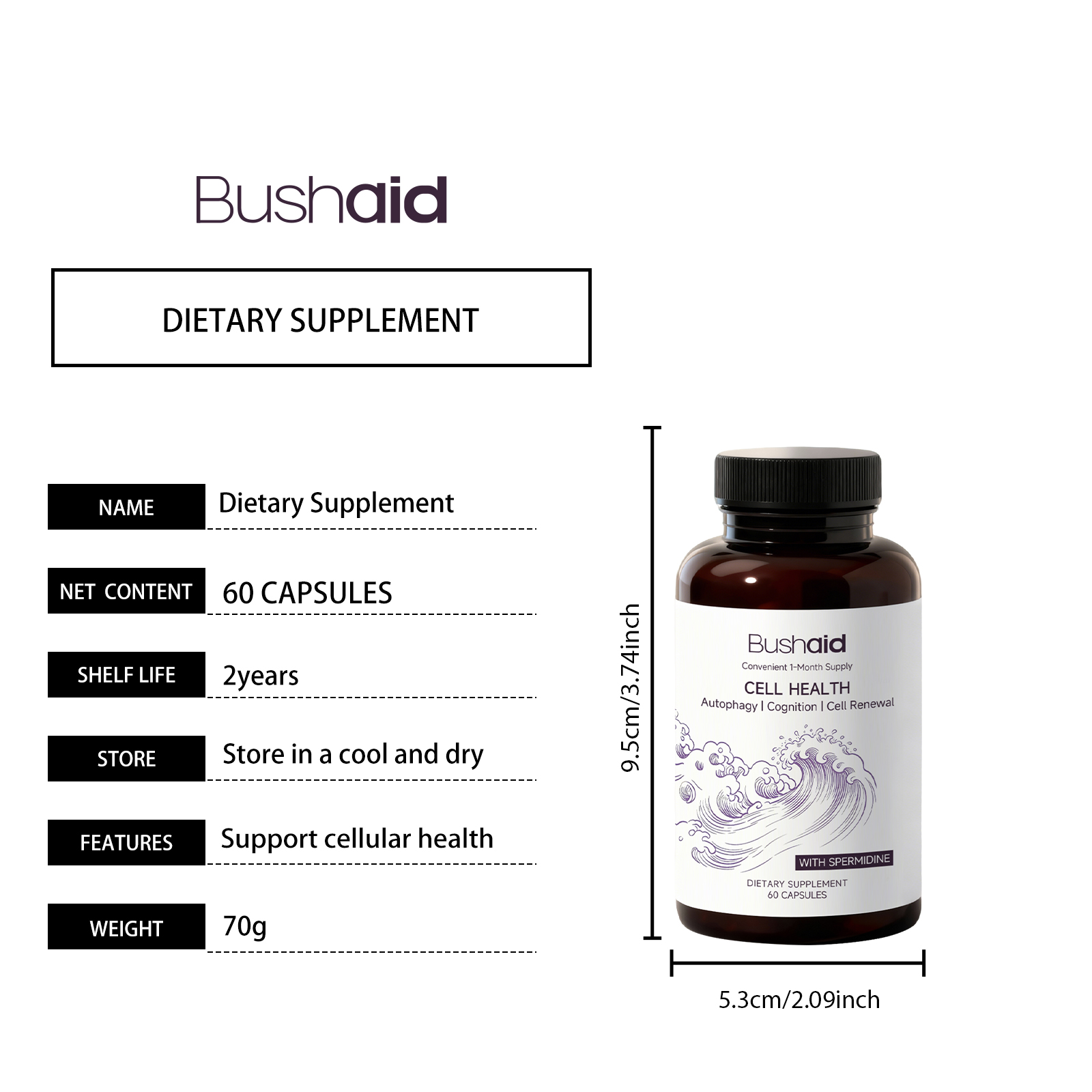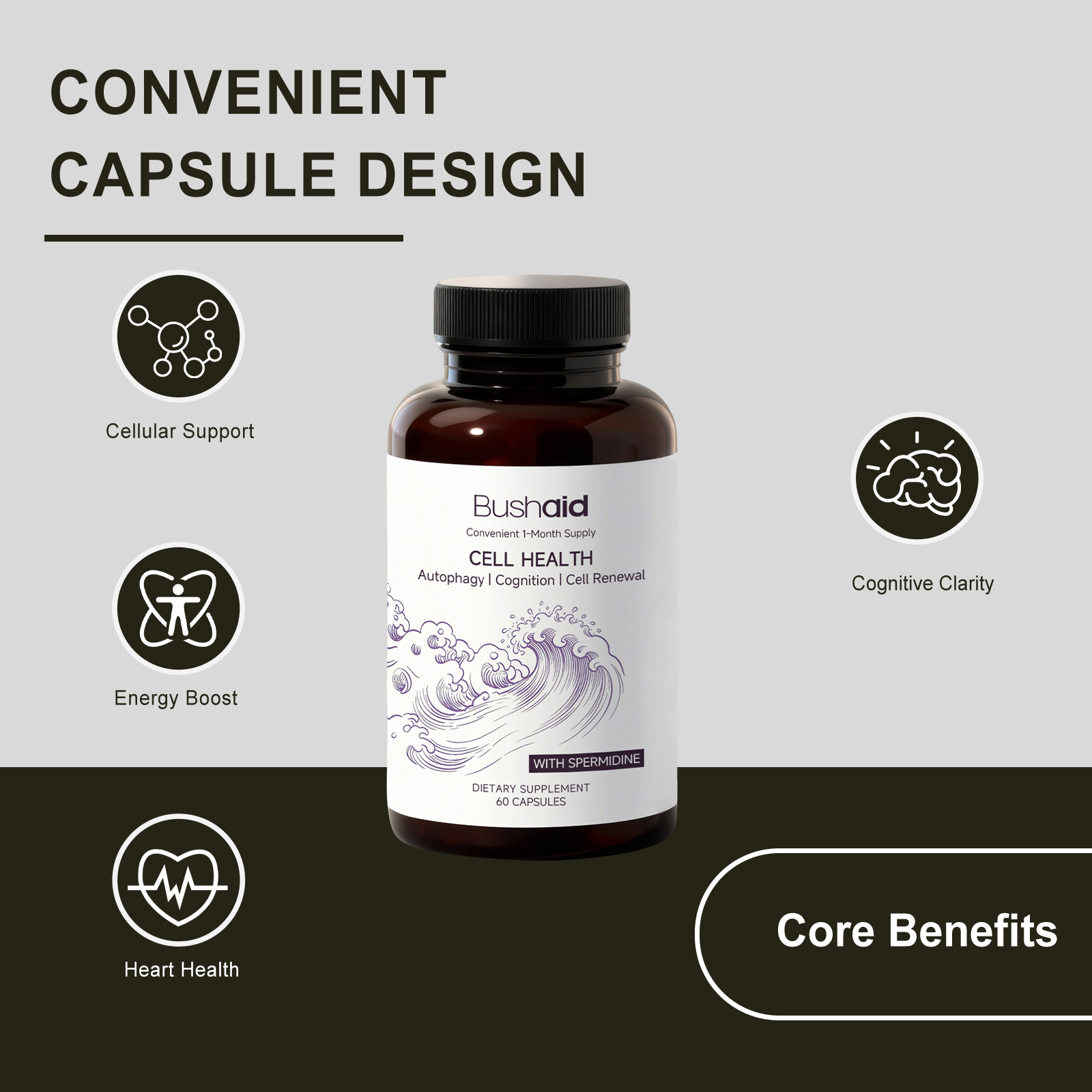 我们的亚精胺健康支援胶囊,由亚精胺、浓缩小麦胚芽提取物精心调配而成。专为促进细胞健康,维持代谢平衡设计。使用方法极为便捷:每天一次,一次2粒胶囊,吞服。并且它可以提升日常能量,增强认知清晰度。