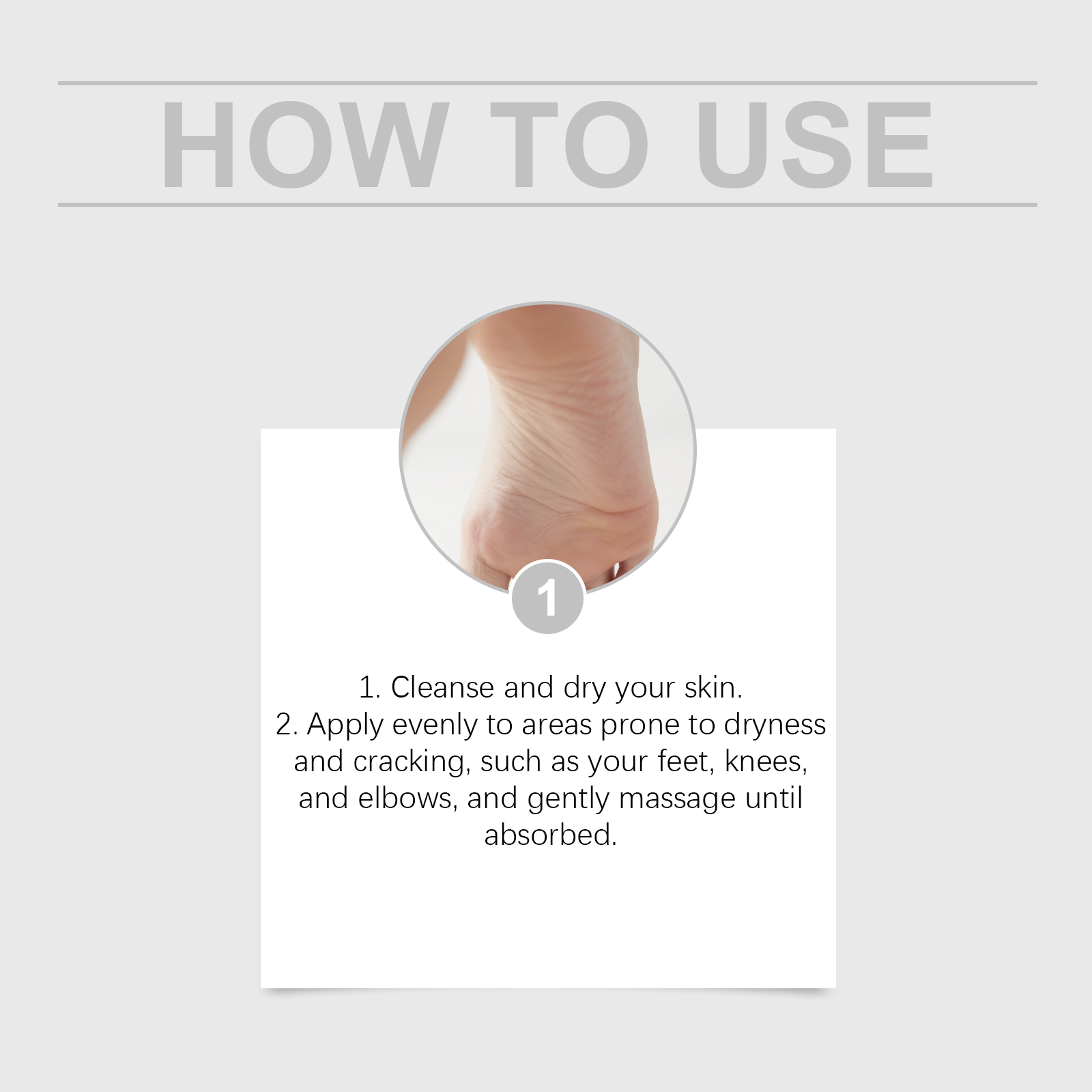 我们的足部护理,由椰子油、牛油果树果脂精心调配而成。专为保持脚部水分,带来光滑、日常舒适的触感设计。使用方法极为便捷:1.清洁并擦干皮肤。2.均匀涂抹于易干燥开裂的部位,如脚部、膝盖和肘部,并轻轻按摩至吸收。并且该产品具有细腻光滑的质地,能贴合足部表面,提供舒适的日常护理体验。