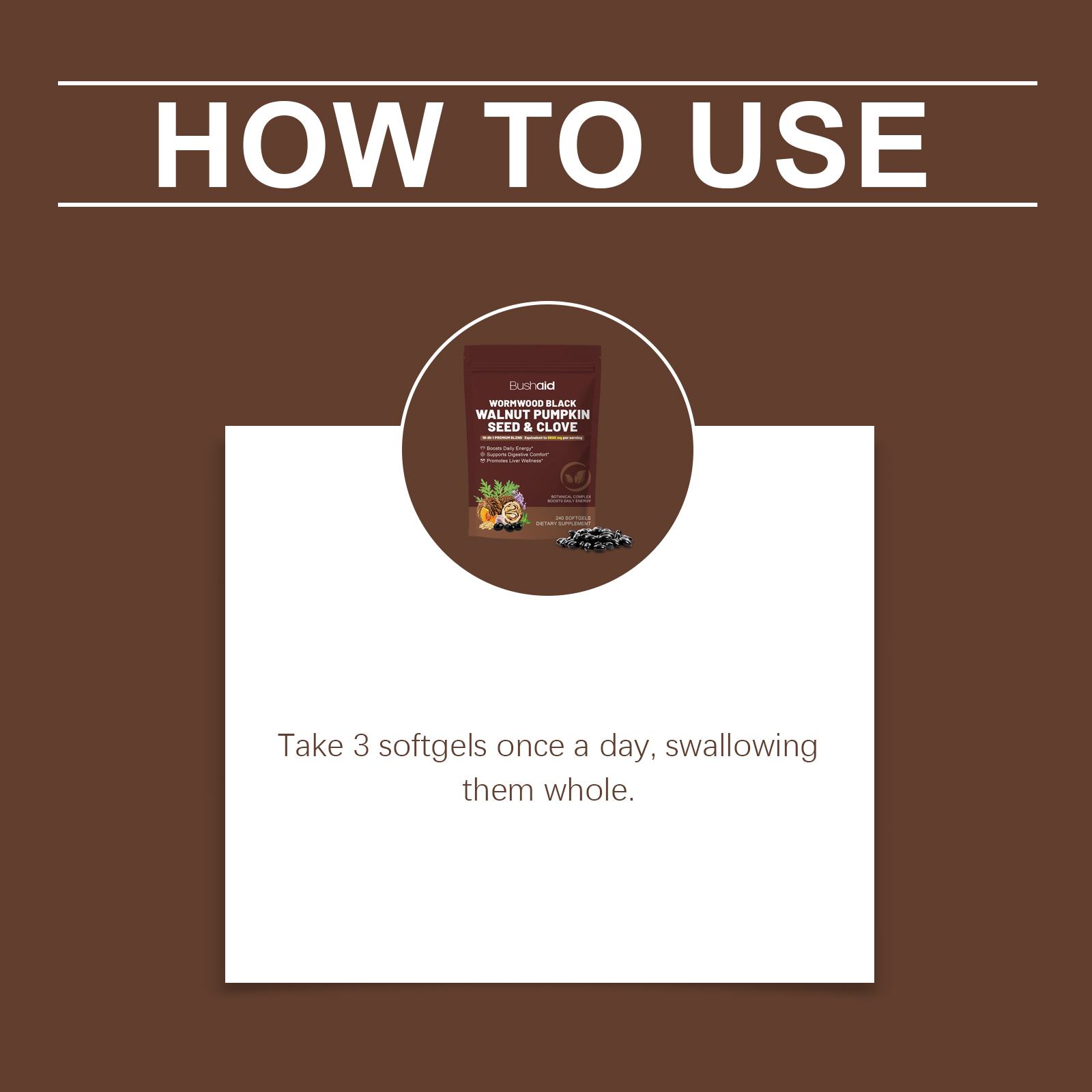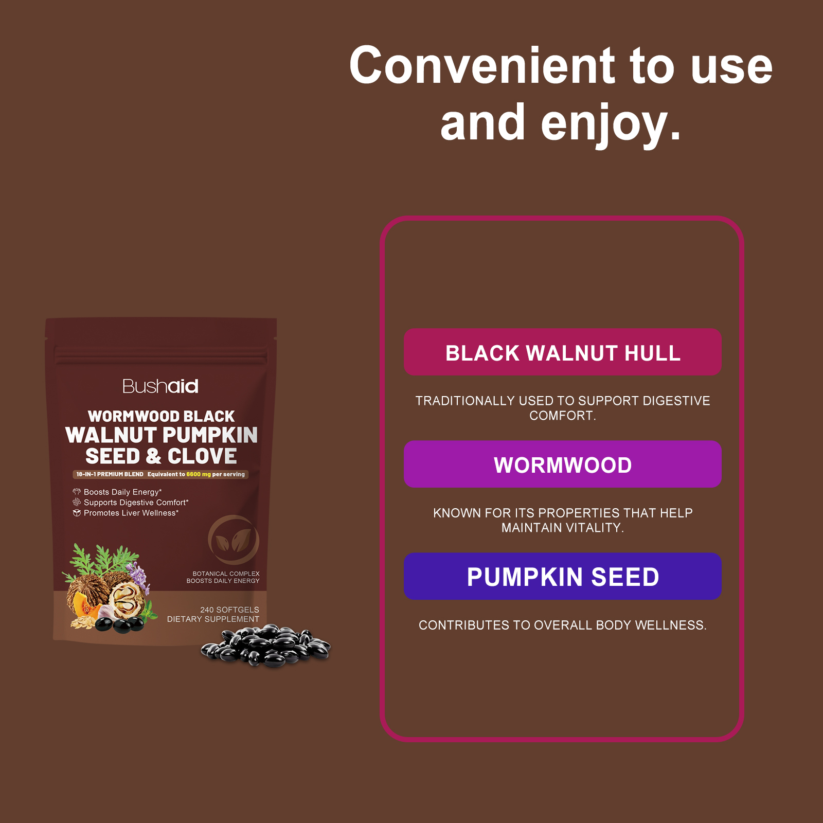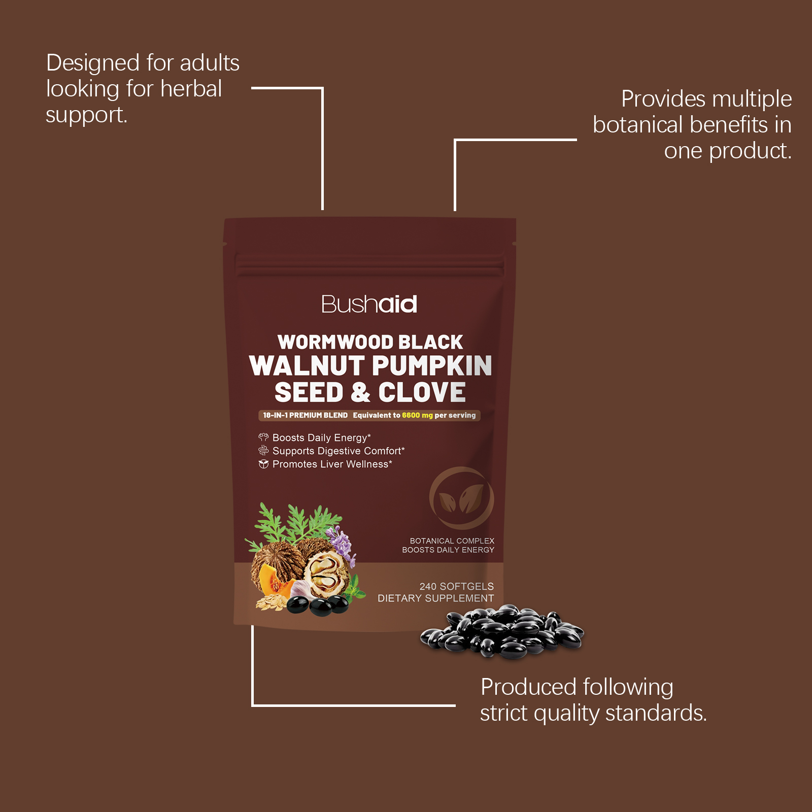 我们的苦艾酒黑胡桃丁香胶囊,由黑胡桃壳、艾草精心调配而成。专为有助于整体身体健康设计。使用方法极为便捷:每日服用 3 片软胶囊,完整吞服即可。并且它是采用精心加工的植物成分制成,支持餐后舒适消化。