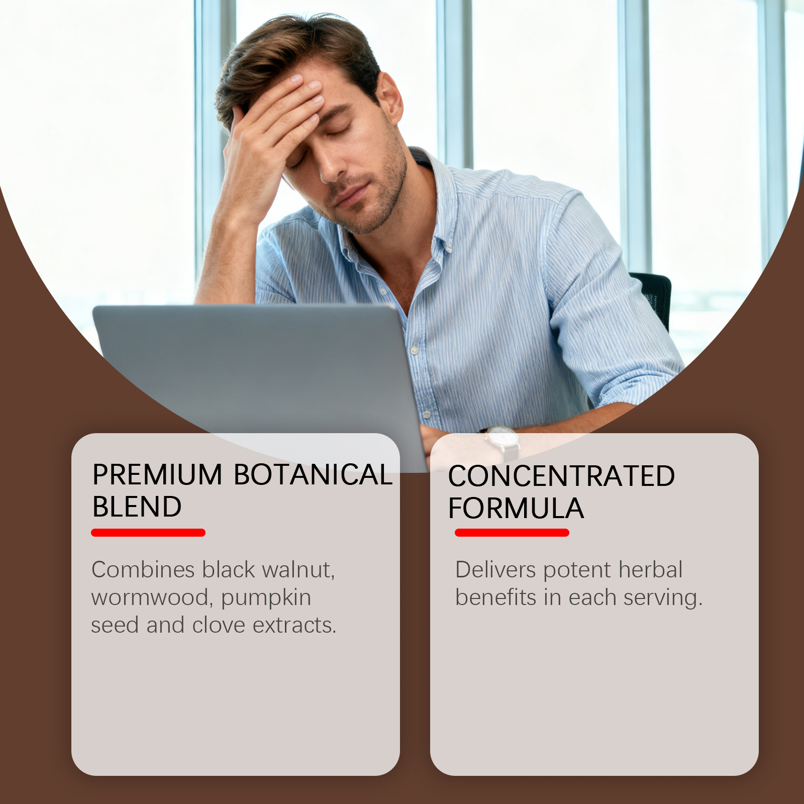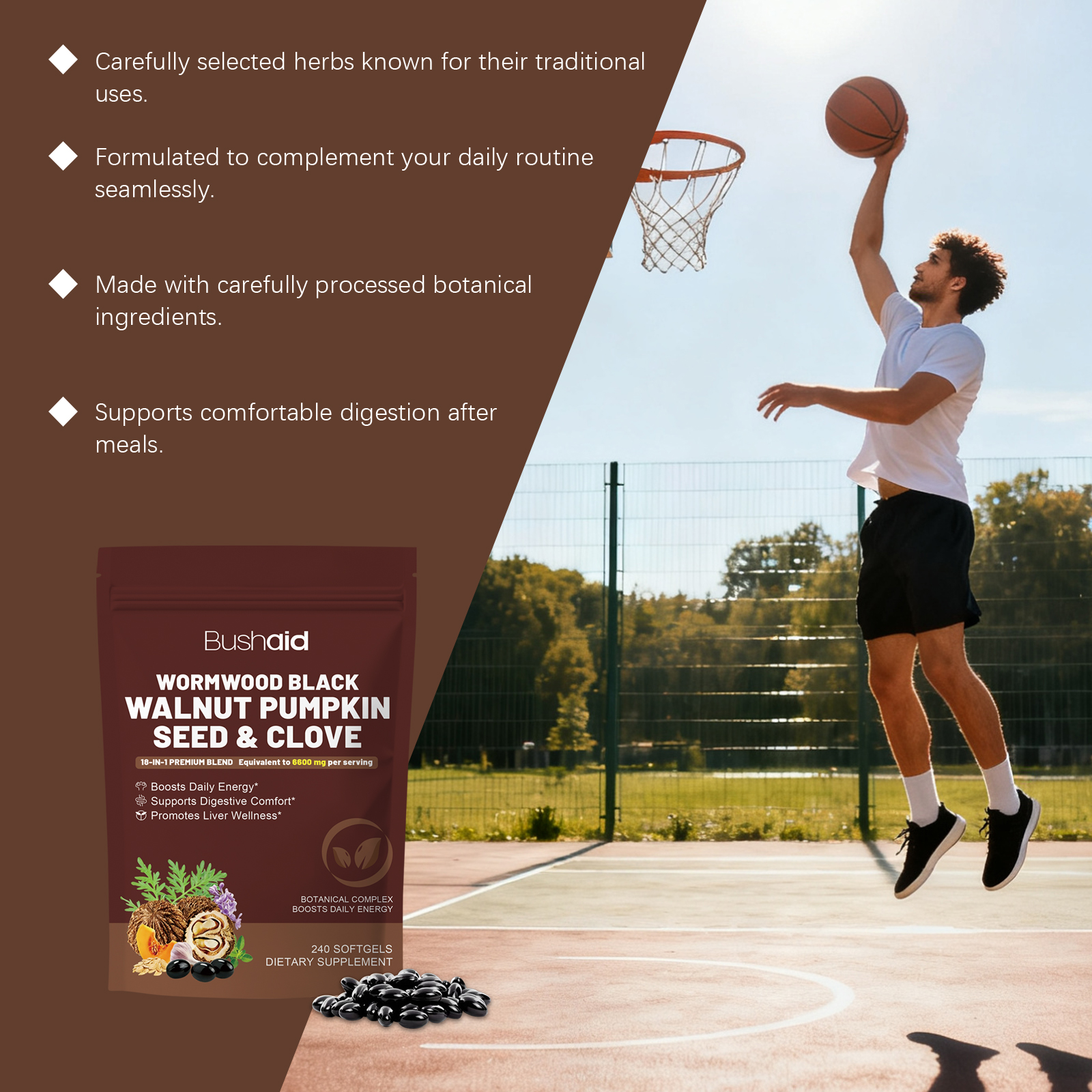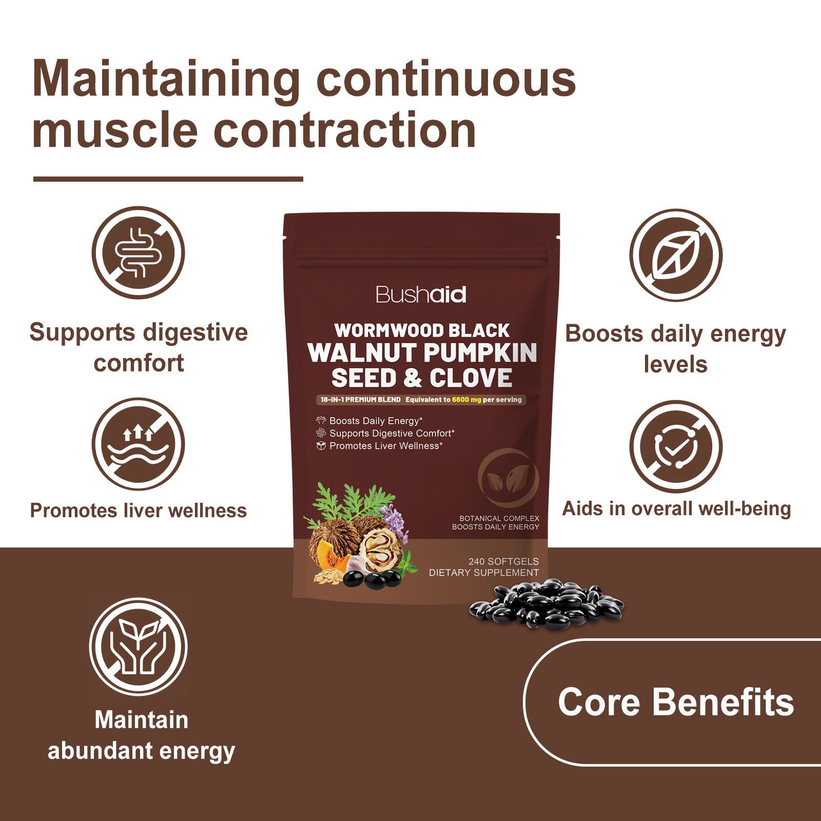 我们的苦艾酒黑胡桃丁香胶囊,由黑胡桃壳、艾草精心调配而成。专为有助于整体身体健康设计。使用方法极为便捷:每日服用 3 片软胶囊,完整吞服即可。并且它是采用精心加工的植物成分制成,支持餐后舒适消化。