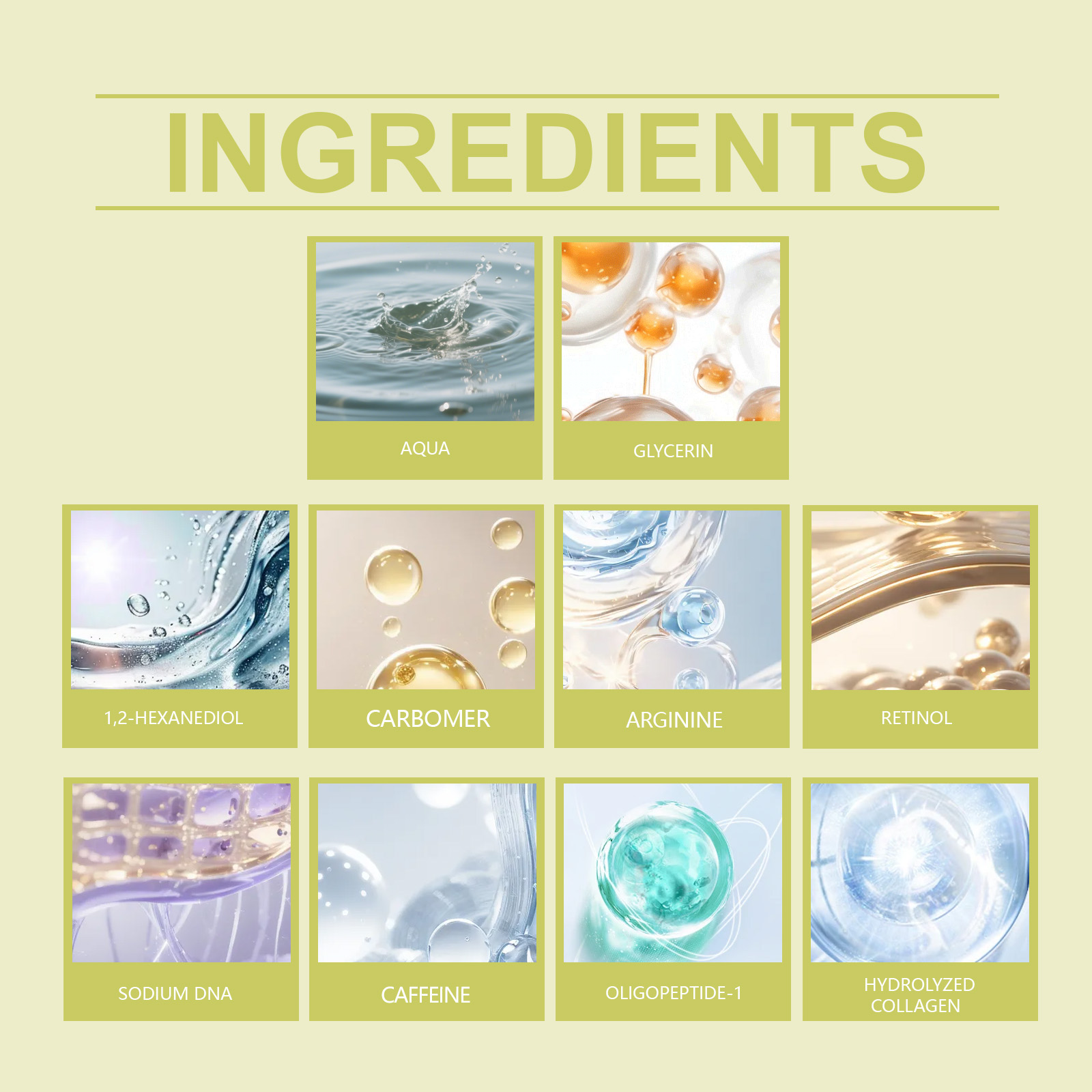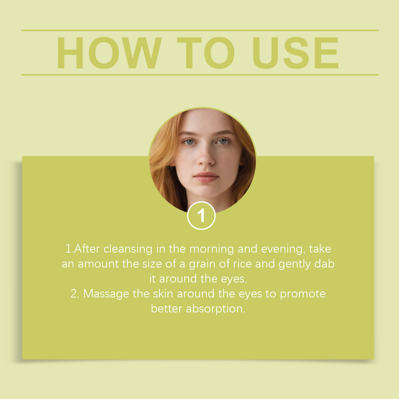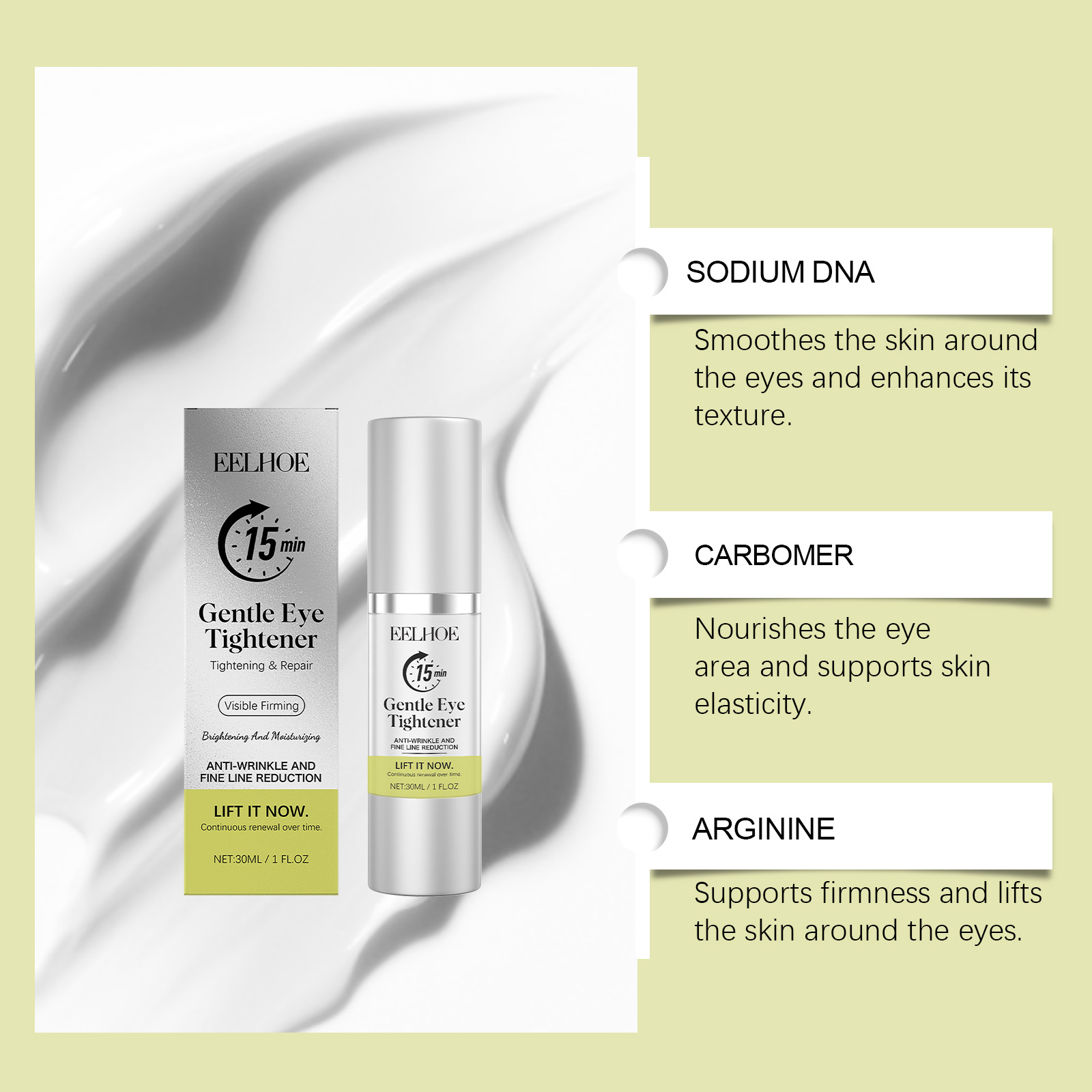 我们的眼部精华,由甘油、1,2-己二醇精心调配而成。专为针对眼部周围的细纹,减少其外观,增强紧致度并提拉眼周肌肤设计。使用方法极为便捷:1.早晚清洁后,取米粒大小的量轻轻点涂于眼周。2.按摩眼周肌肤以促进更好吸收。并且它可以提亮眼周轮廓,减少松弛和衰老的外观。