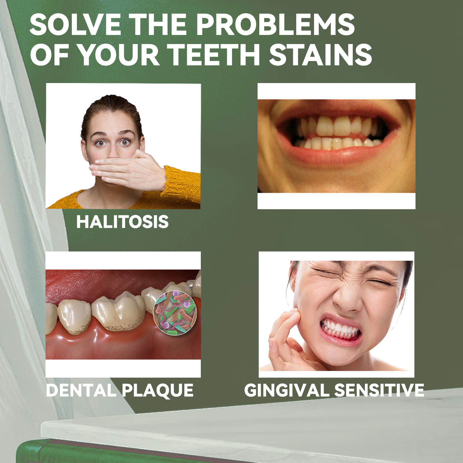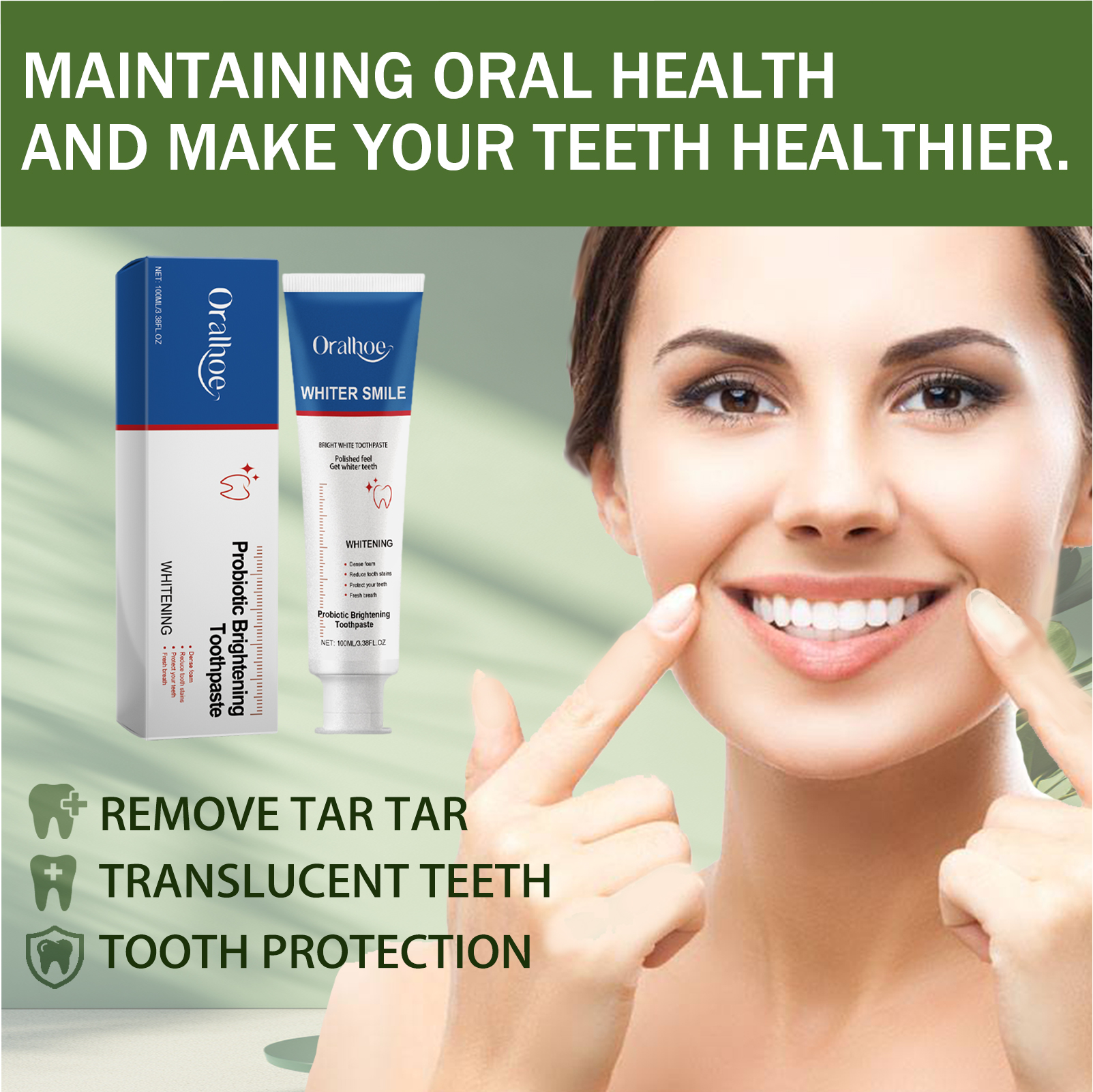我们的益生菌焕白牙膏含有生物素、胶原蛋白、人参提取物。它可以改善牙齿受损的问题,改善牙龈和牙齿的健康,帮助去除牙齿表面的色斑和色素沉着,使牙齿更白更亮。它的使用方法很简单:在牙刷上挤上适量的牙膏,以由内而外的圆周运动轻轻刷牙1-2分钟,最后用清水漱口即可。可以有效去除牙渍,更好地保护牙齿,让牙齿更白。