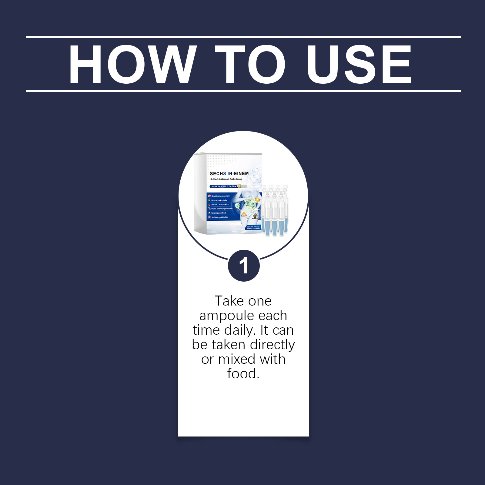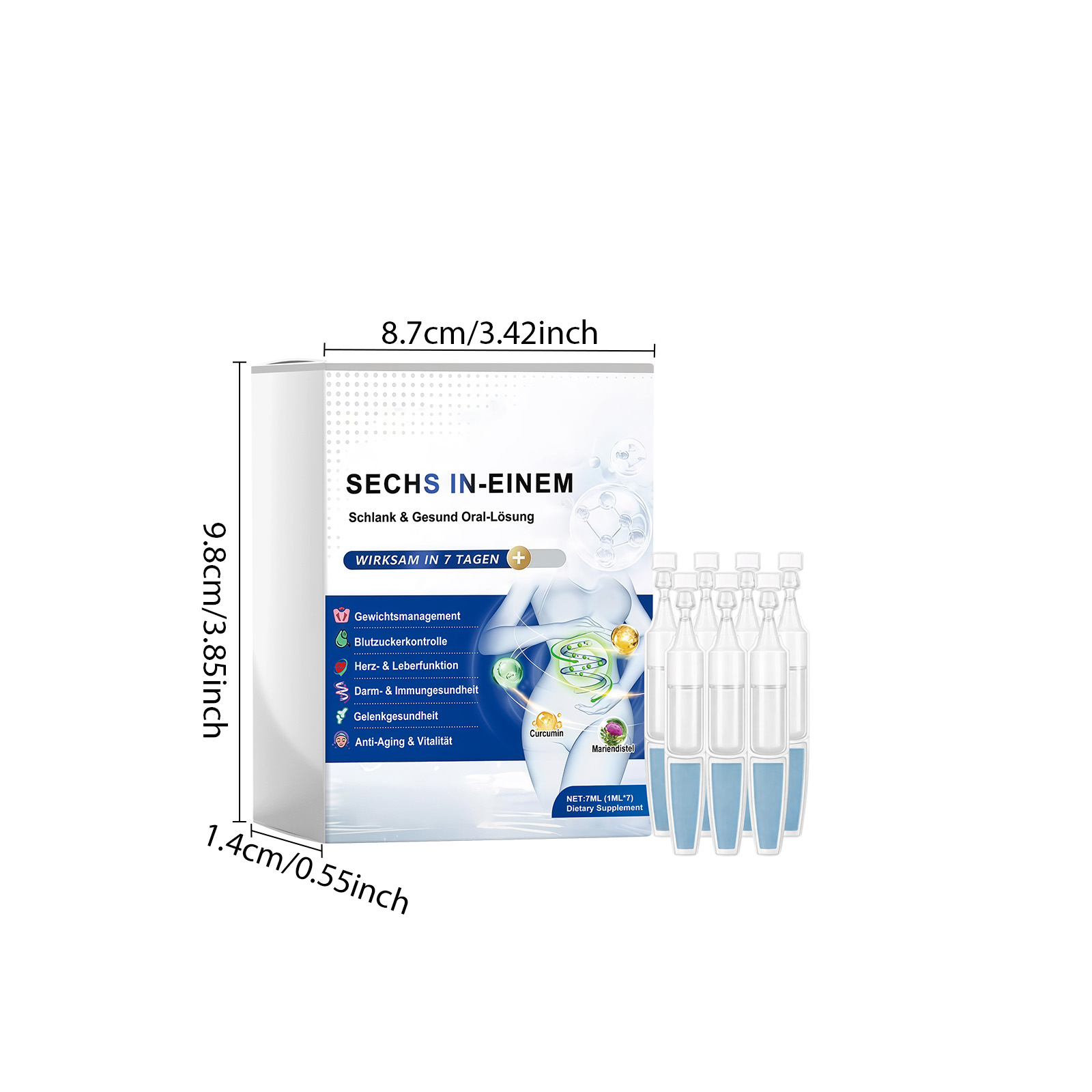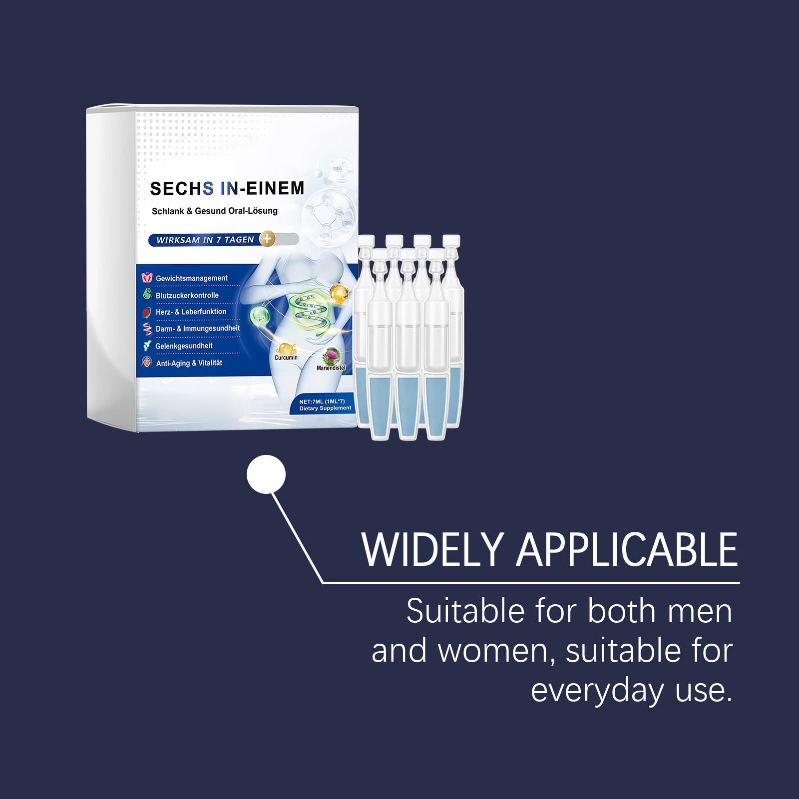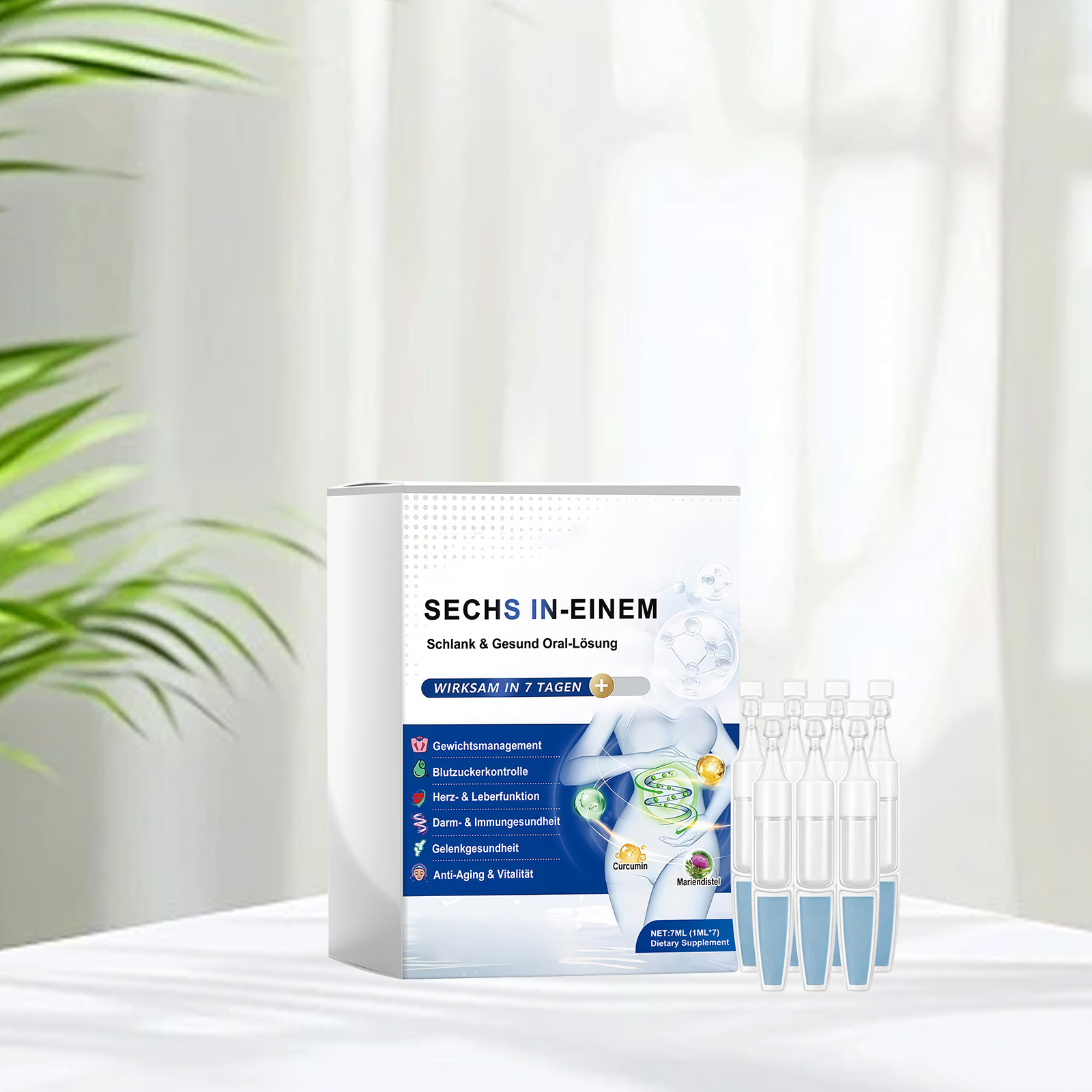 我们的六合一口服溶液,由姜黄素、奶蓟提取物精心调配而成。专为多种关节健康设计。使用方法极为便捷:每天每次服用一支安瓿。可以直接服用或与食物混合服用。并且它味道温和,食用舒适。