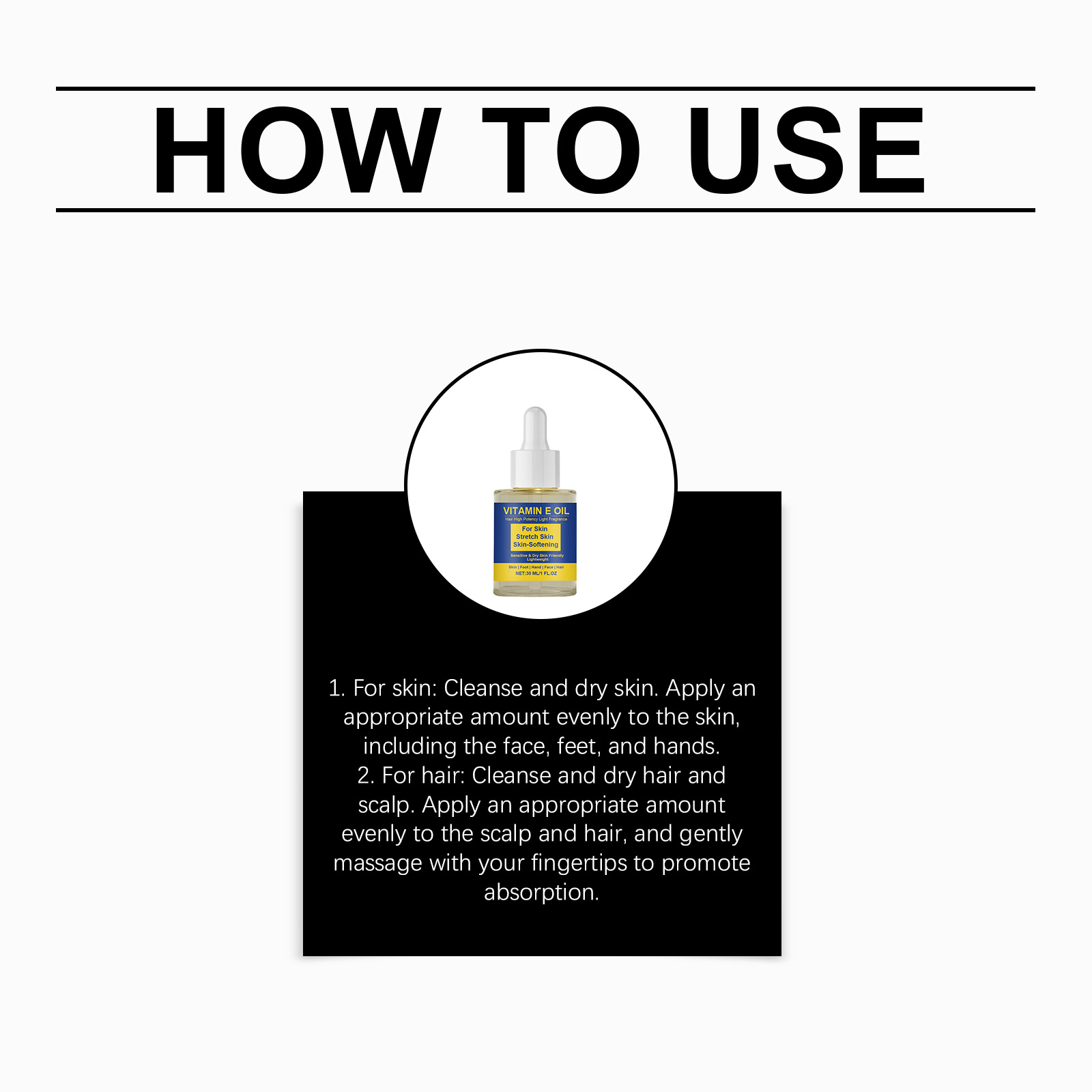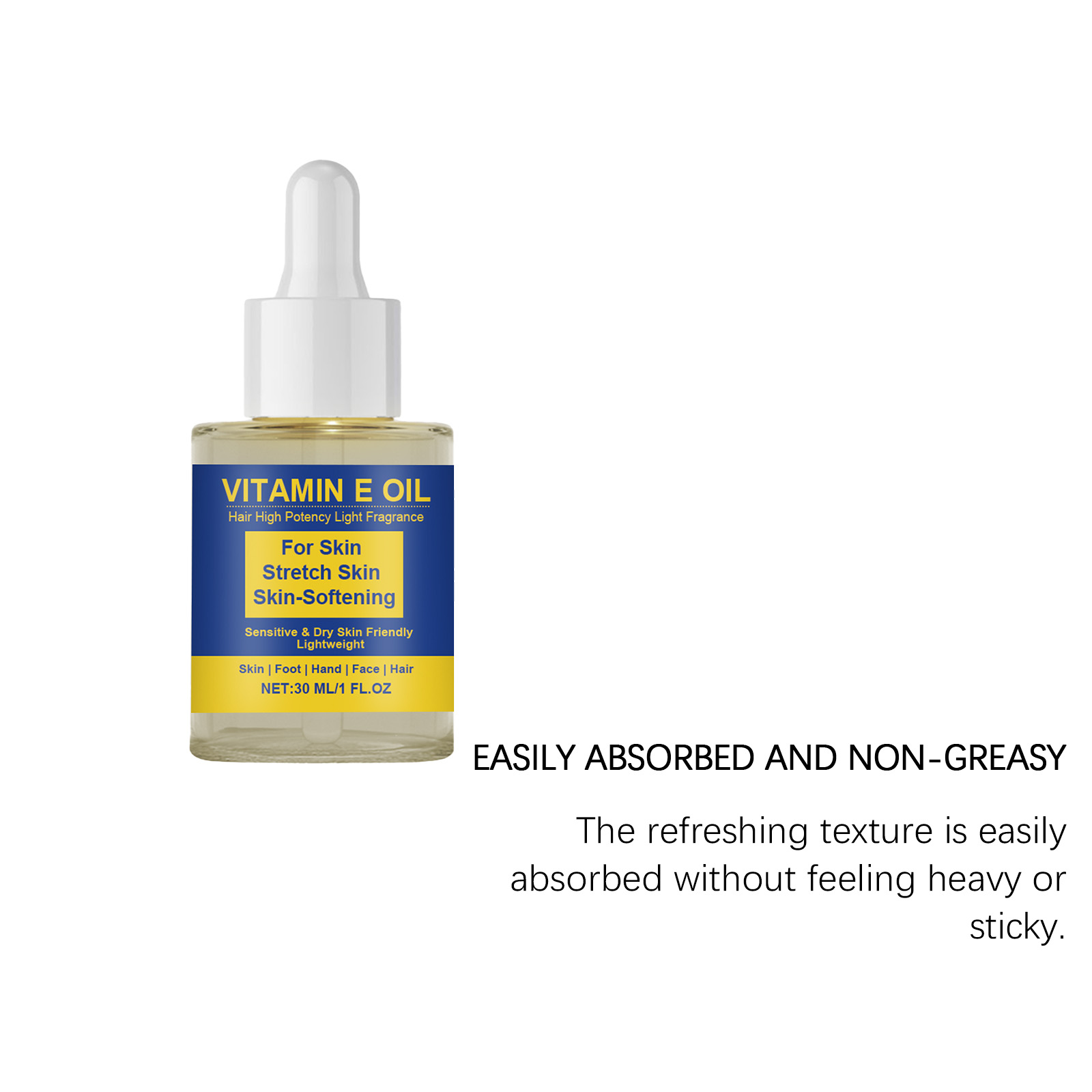 我们的维生素E油,由精氨酸、生育酚(维生素E)精心调配而成。专为补充皮肤水分并改善干燥设计。使用方法极为便捷:1.用于皮肤:清洁并擦干皮肤。取适量均匀涂抹于面部、脚部和手部等部位。2.用于头发:清洁并擦干头发和头皮。取适量均匀涂抹于头皮和头发上,用指尖轻轻按摩,以促进吸收。并且可以滋养皮肤表面,改善其光滑度。