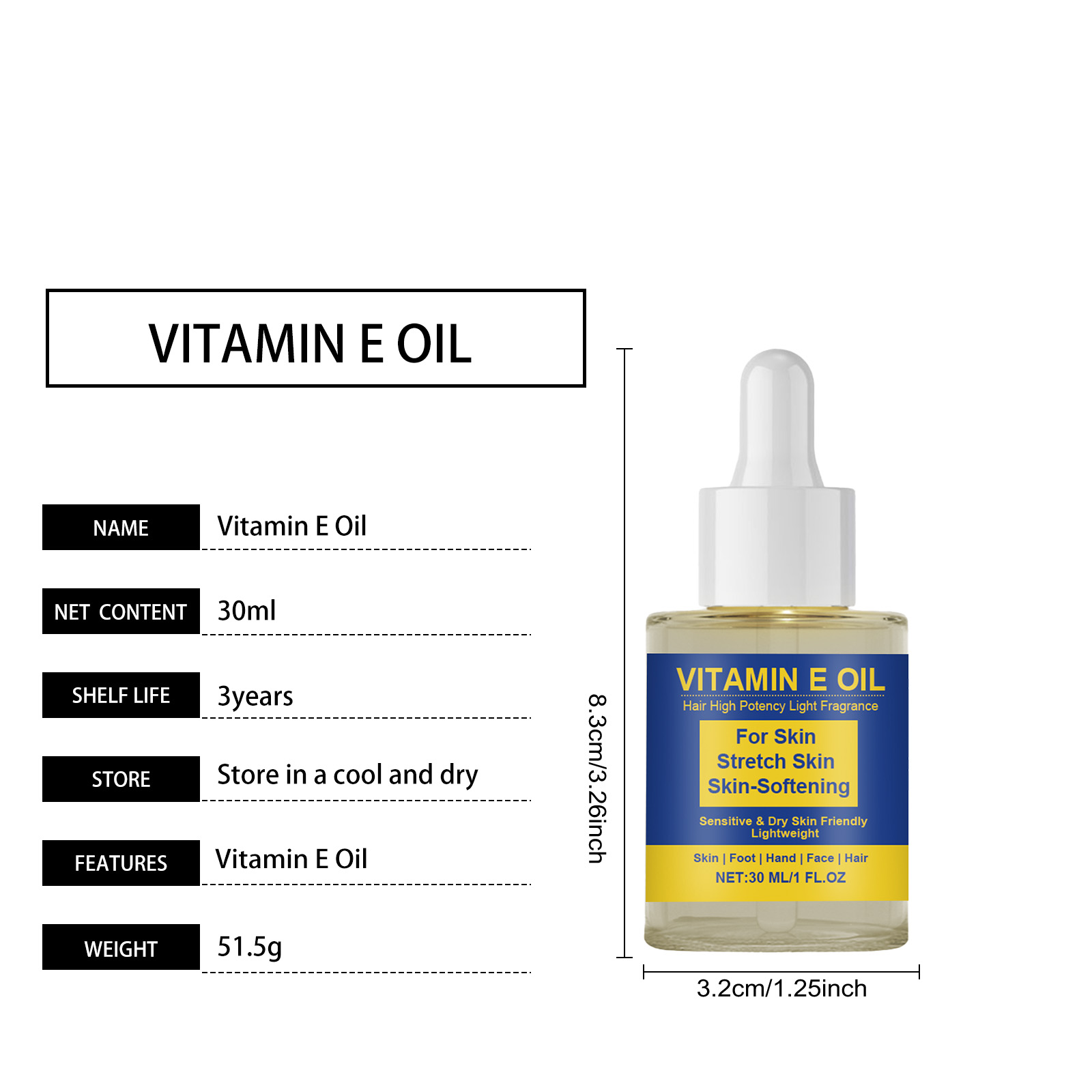 AMZ Vitamin E Oil Is Gentle, Hydrating, Refreshing And Moisturizing. It Provides Daily Comfort And Nourishment For The Face, Hands And Feet, And Hair Care