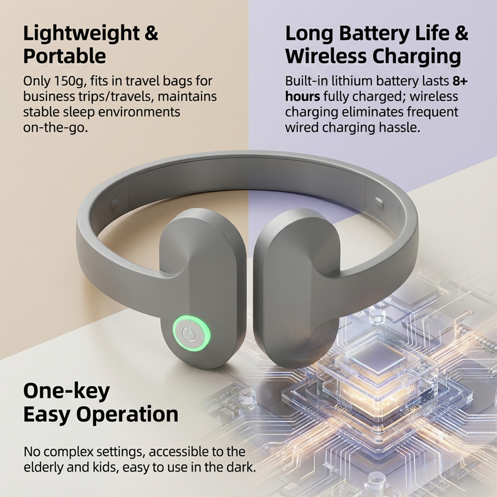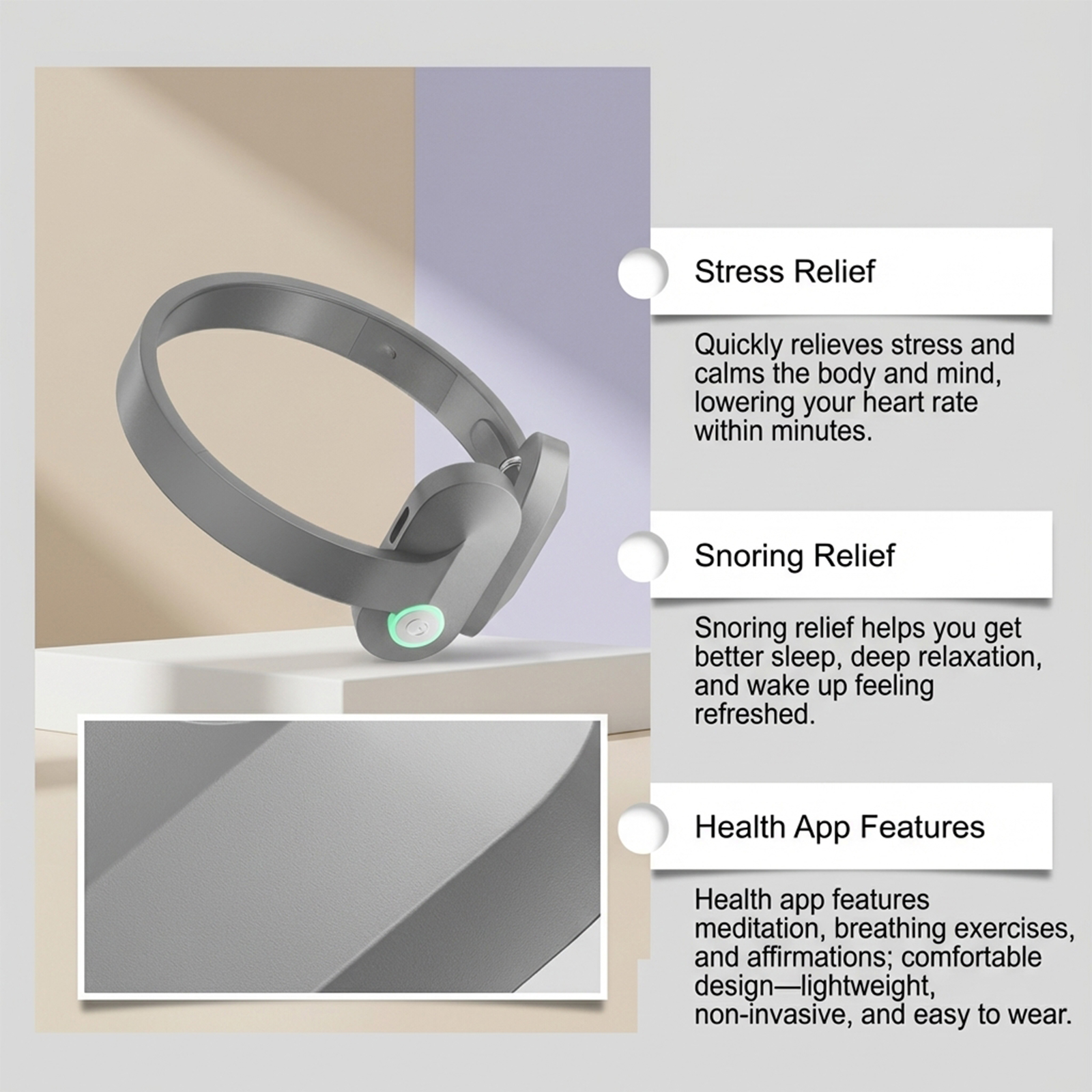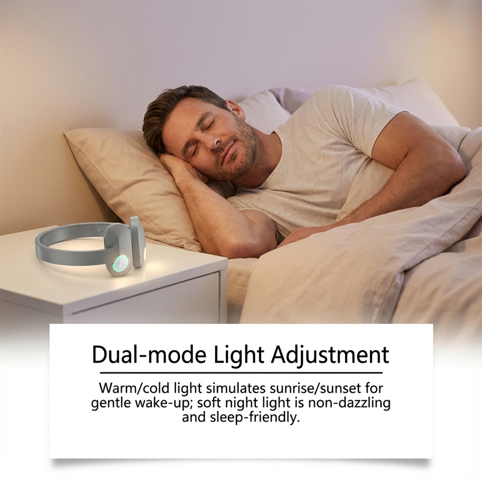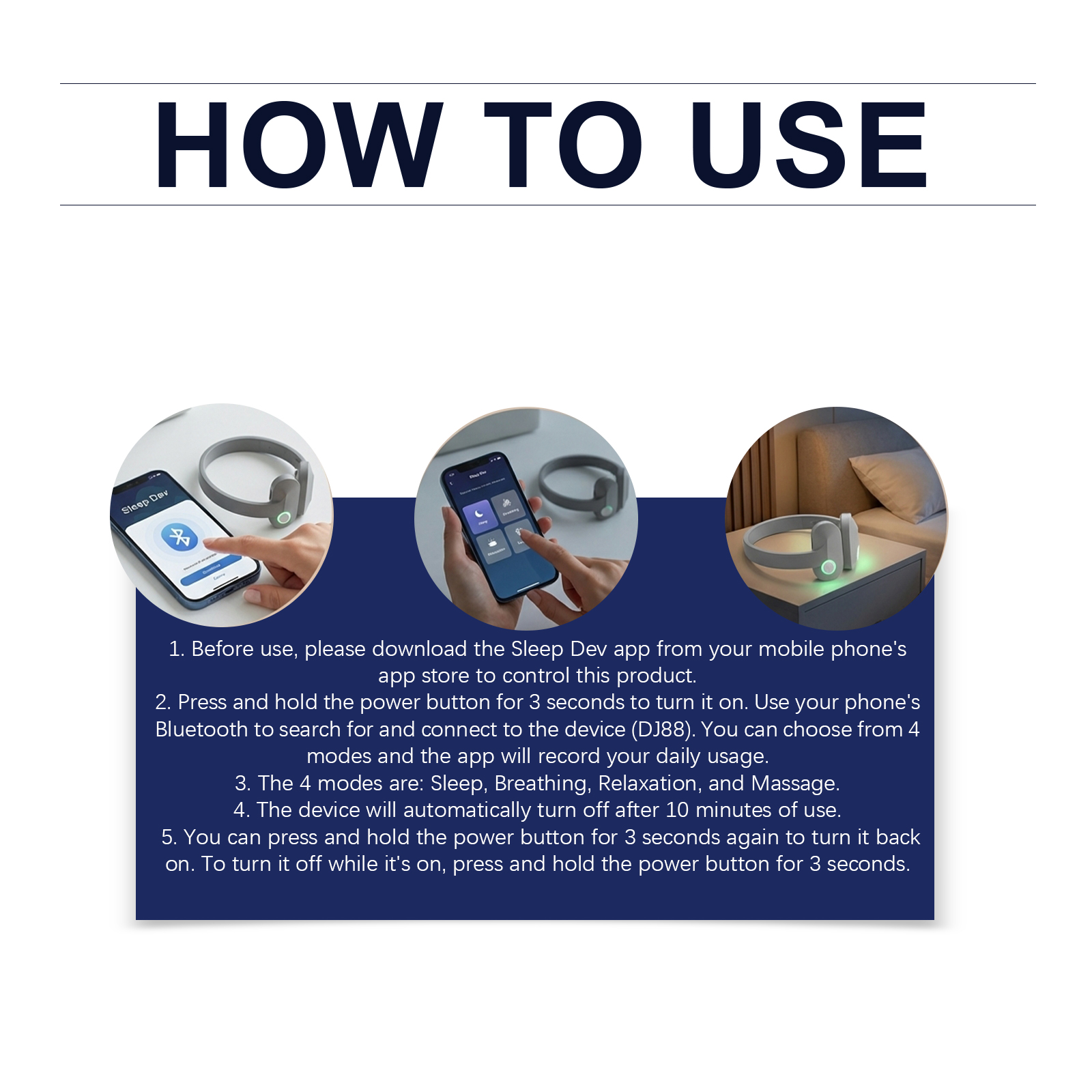 我们的睡眠护理按摩器,由ABS精心制作而成。专为内置海洋波浪/雨声可阻隔环境噪音改善因打鼾引起的睡眠中断设计。使用方法极为便捷:1.使用前,请从手机应用商店下载Sleep Dev应用程序以控制本产品。2.长按并按住电源按钮3秒以将其开启。请使用手机的蓝牙功能来搜索并连接该设备(DJ88)。您可选择4种模式,且该应用将记录您的日常使用情况。3.四种模式为:睡眠、呼吸、放松和按摩。4.设备在使用10分钟后将自动关机。5.可再次长按电源键3秒以重新开机。在设备开启状态下,长按电源键3秒可关机。并且它可以暖光/冷光模拟日出/日落,带来柔和的唤醒体验;柔和夜灯不刺眼且利于睡眠。