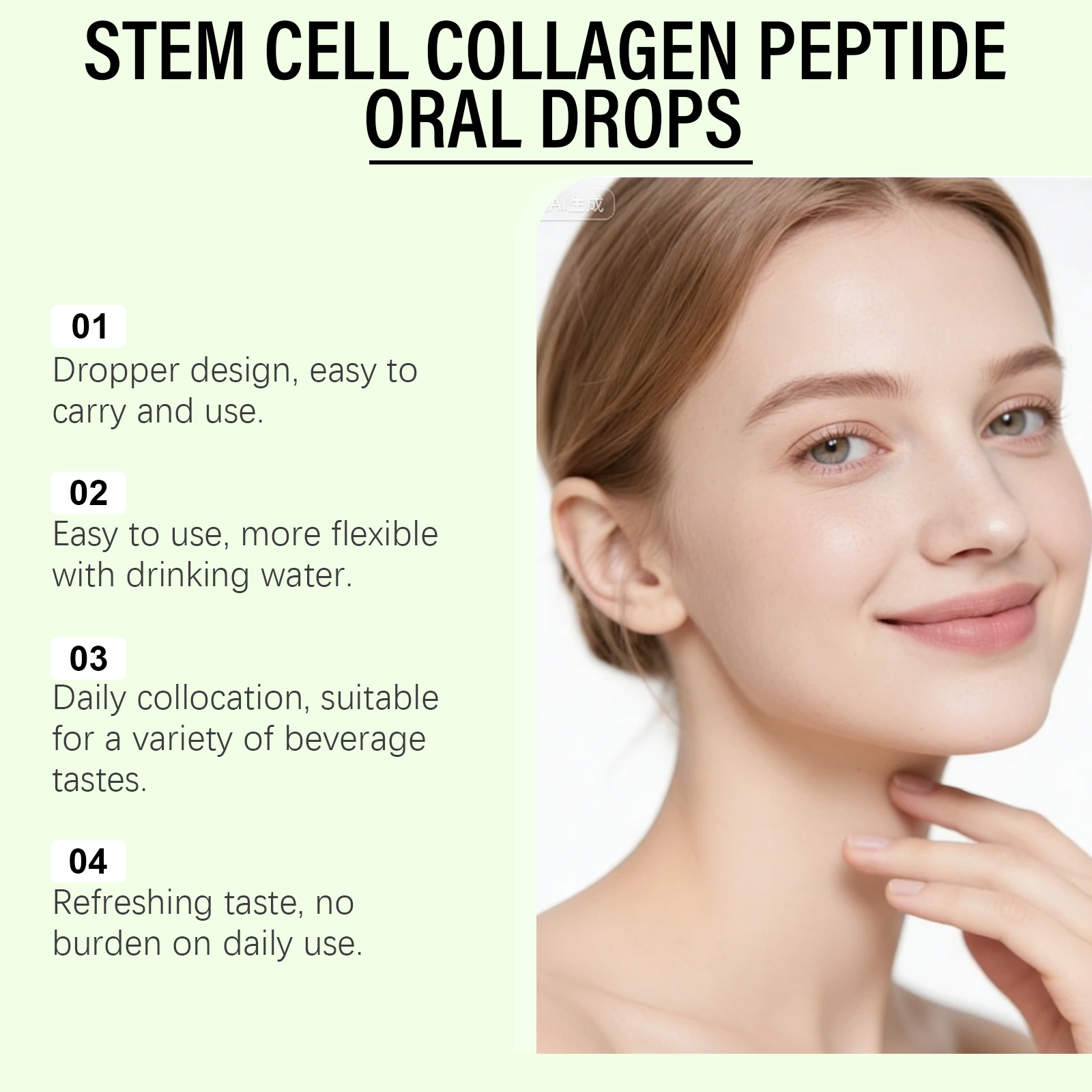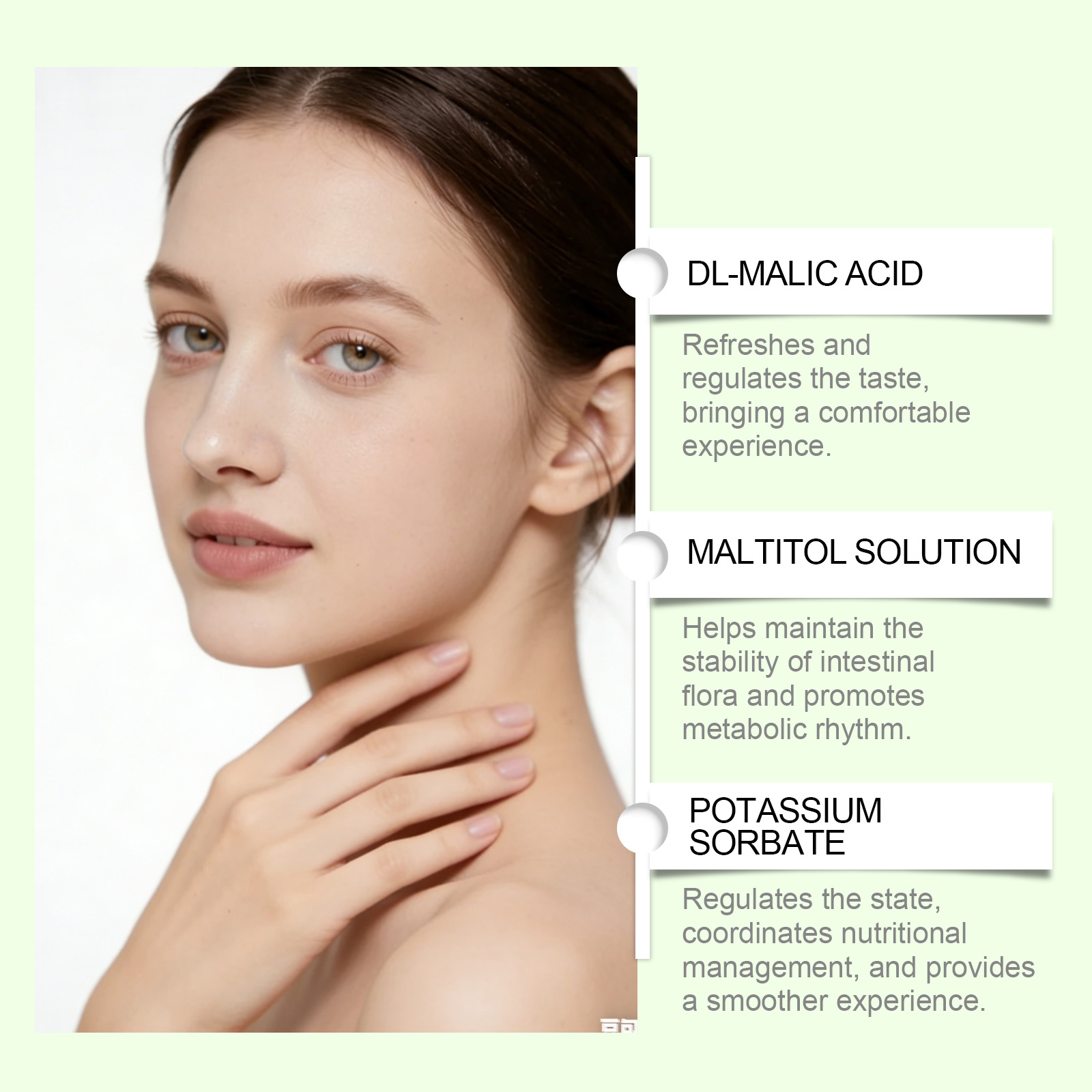 我们的口服滴剂,由DL-苹果酸,麦芽糖醇液精心调配而成。专为轻松融入日常生活设计。使用方法极为便捷:每天服用1毫升,可直接服用或与其他食物混合。并且适用于皮肤、头发和指甲。