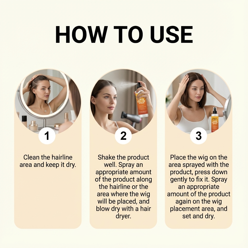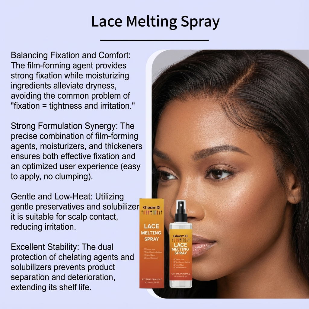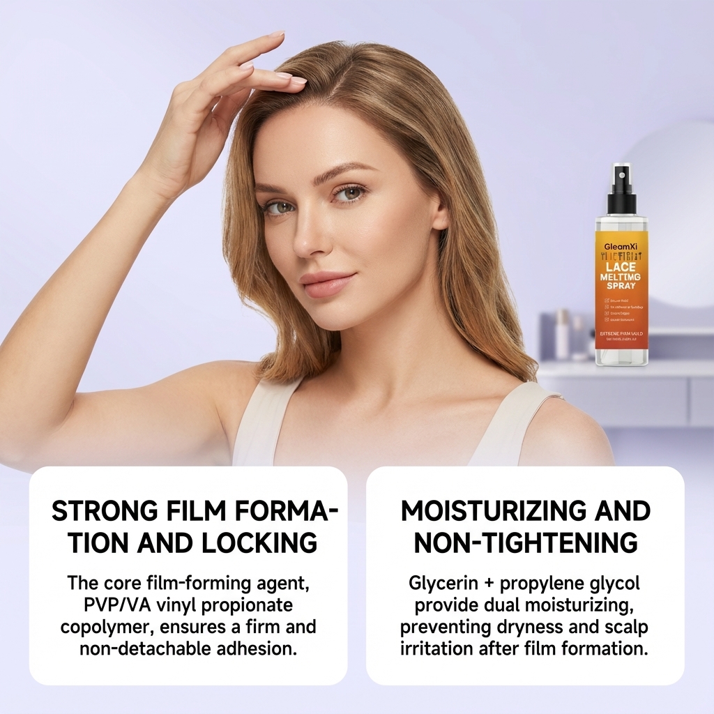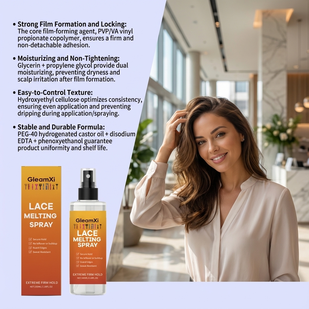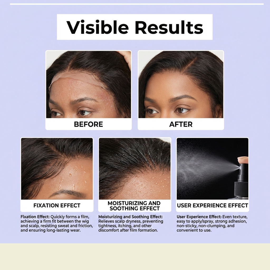 我们的蕾丝假发粘合喷雾,由甘油、丙二醇精心调配而成。专为供双重保湿,防止成膜后干燥和头皮刺激设计。使用方法极为便捷:清洁发际线区域并保持干燥。充分摇匀产品。沿发际线或假发将要放置的区域喷洒适量产品,然后用吹风机吹干。将假发放置在已喷洒产品区域,轻轻按压固定。再次在假发放置区域喷洒适量产品,并定型晾干。并且可以缓解头皮干燥。