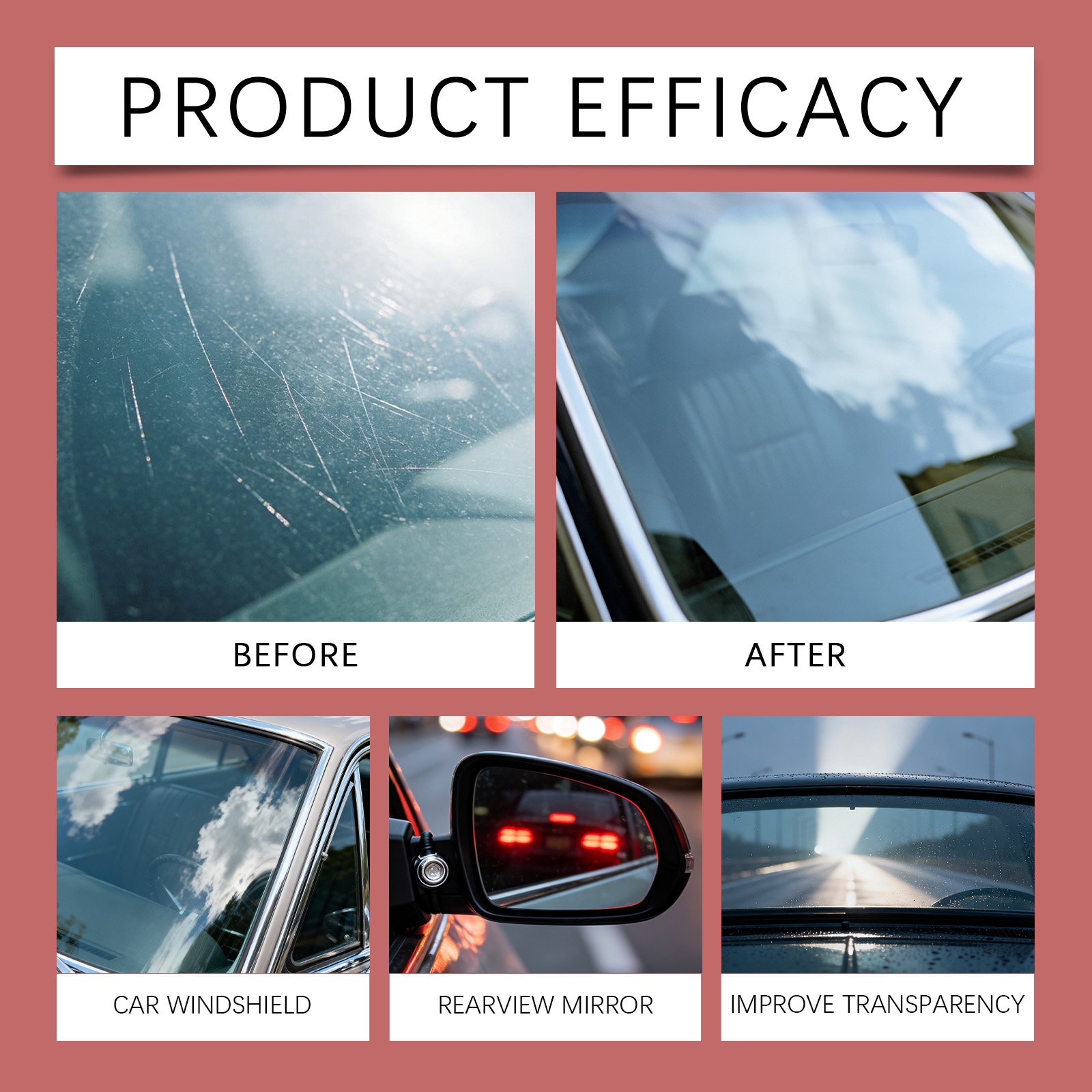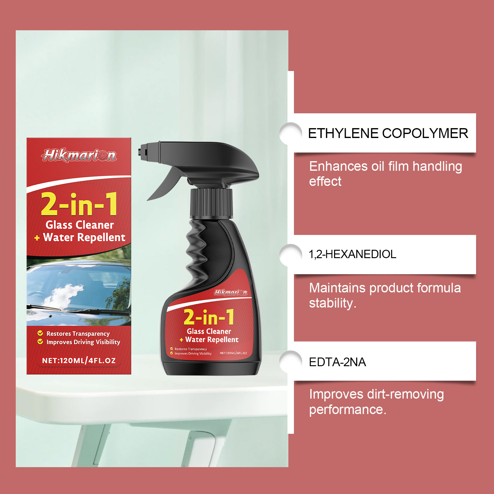 我们的二合一玻璃清洁剂,由乙烯共聚物 、1,2-己二醇精心调配而成。专为解决玻璃油膜问题设计。使用方法极为便捷:1.清洁玻璃表面的油污和灰尘。2.均匀喷洒在玻璃表面。3.让其自然干燥,直至形成薄膜。并且能提升驾驶清晰度。