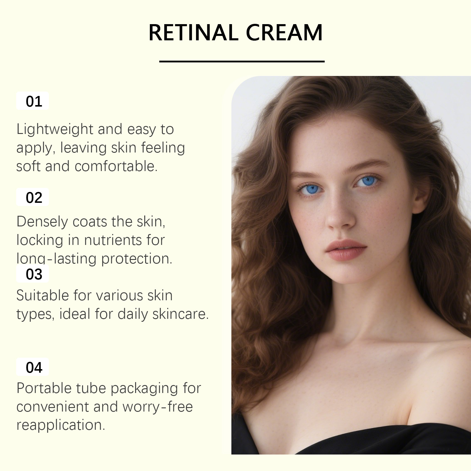 我们的视黄醇面霜,由精氨酸、视黄醇精心调配而成。专为补充皮肤水分,保持柔软和舒适的状态设计。使用方法极为便捷:1.彻底清洁并擦干皮肤。2.取适量均匀涂抹于面部。3.轻柔按摩,以达到最佳吸收效果。并且早晚护肤均可使用,完美契合您的日常护理流程。