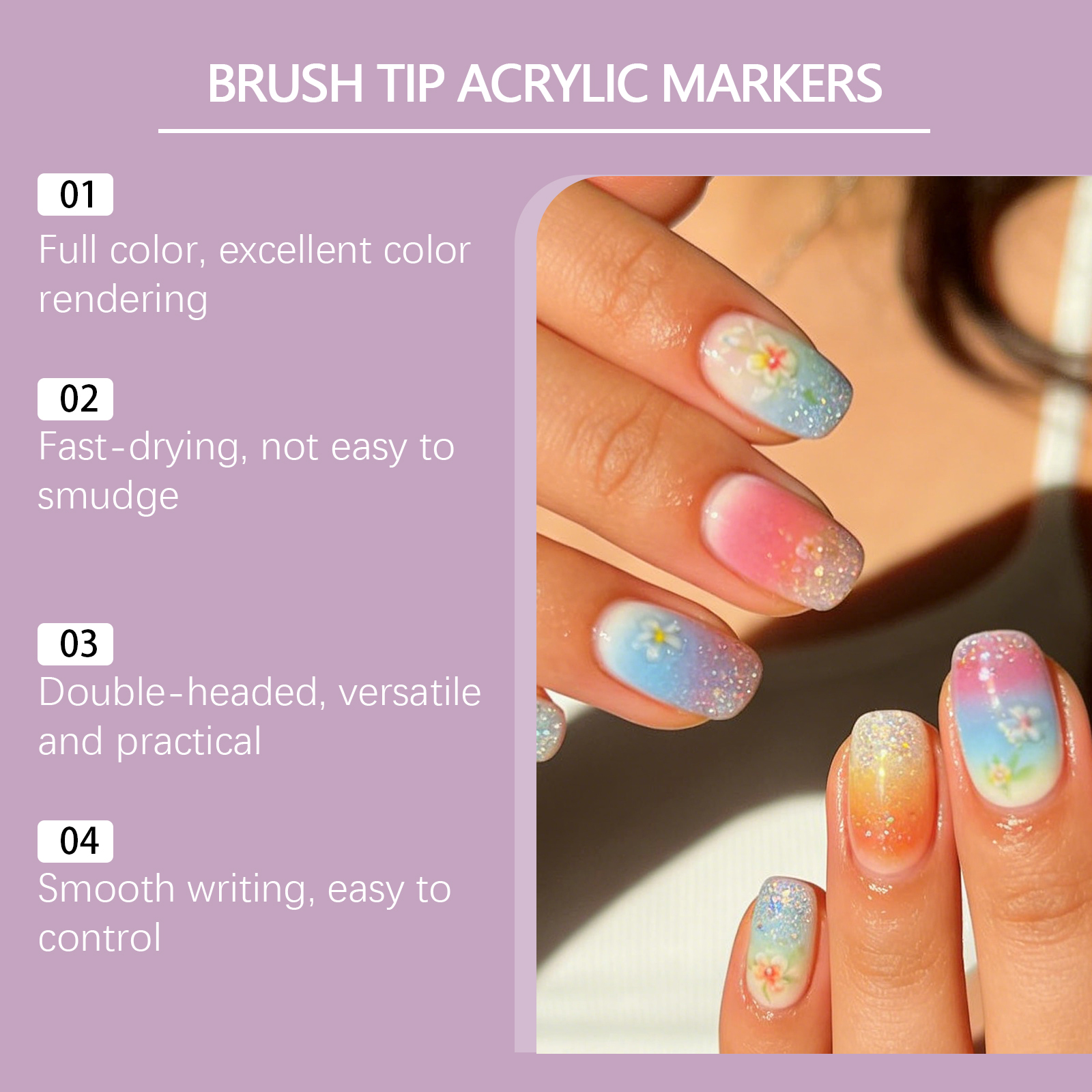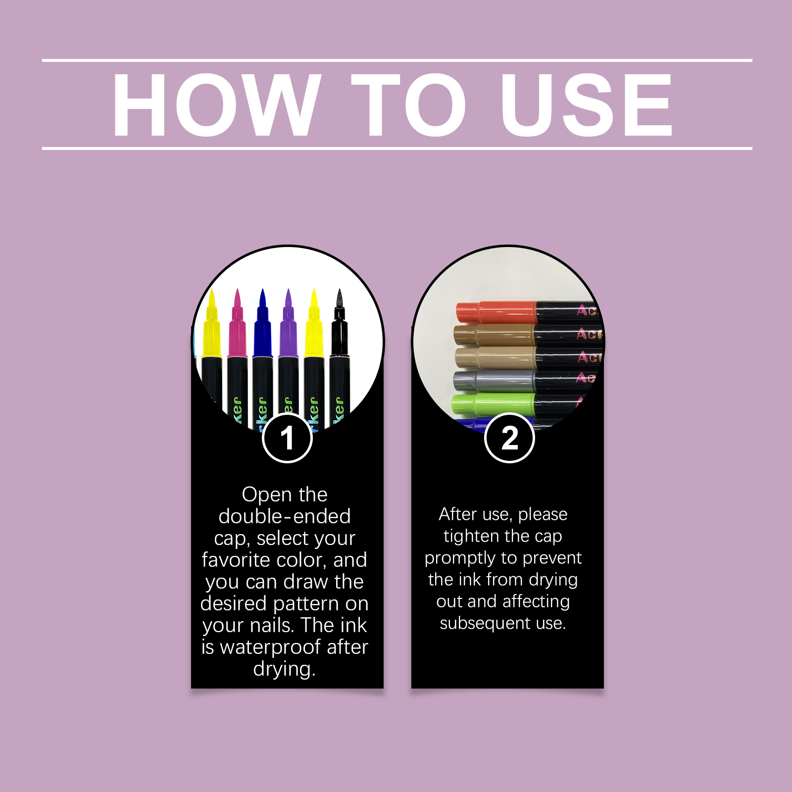 我们的双头美甲涂鸦笔套装,由氟碳树脂、膨润土精心调配而成。专为多种颜色组合满足多样创意需求设计。使用方法极为便捷:打开双头盖,选择你喜欢的颜色即可在指甲上绘制所需图案。墨水干燥后具有防水性。使用后,请及时拧紧瓶盖,以防墨水干涸影响后续使用。并且它可以绘制精确线条,创造精致细节。