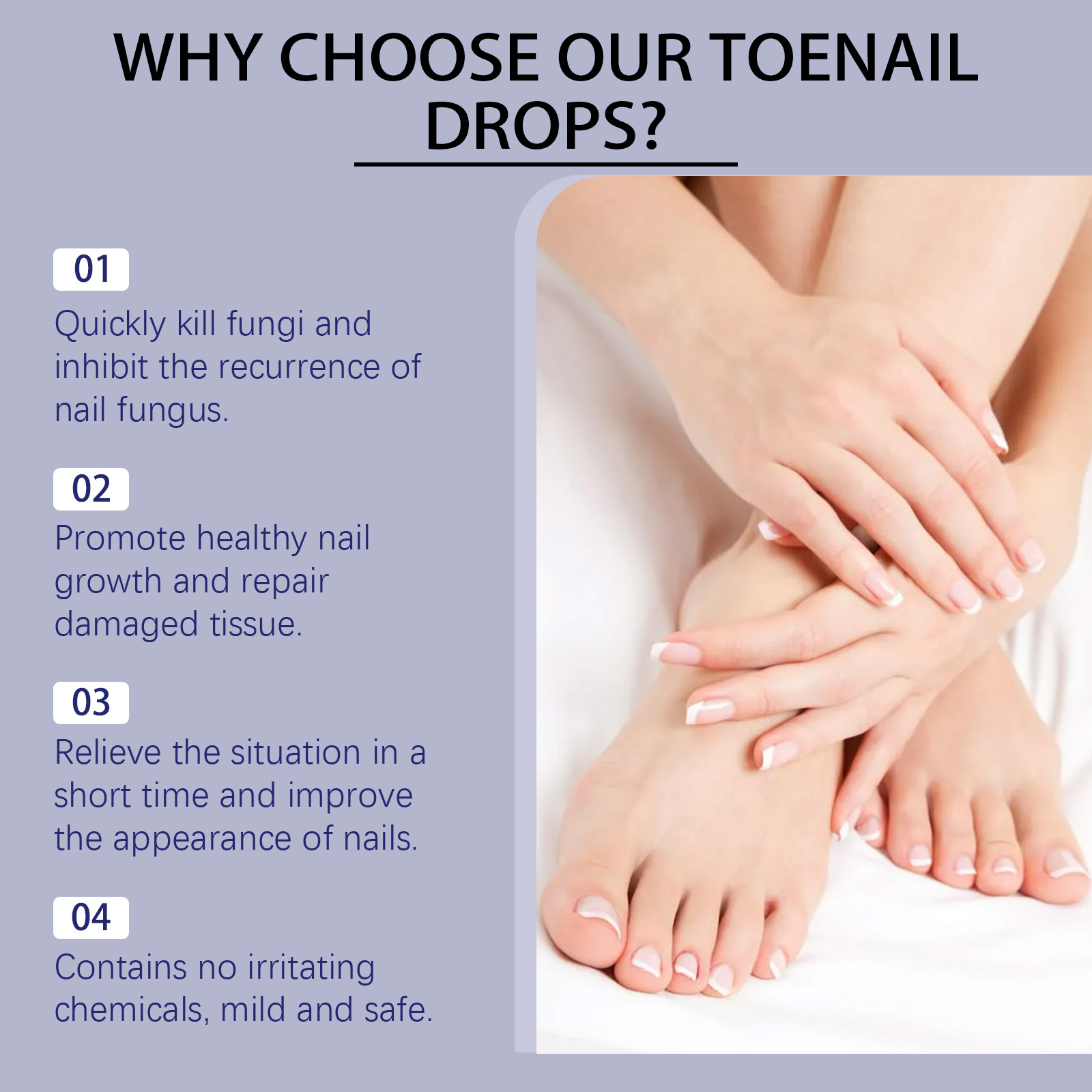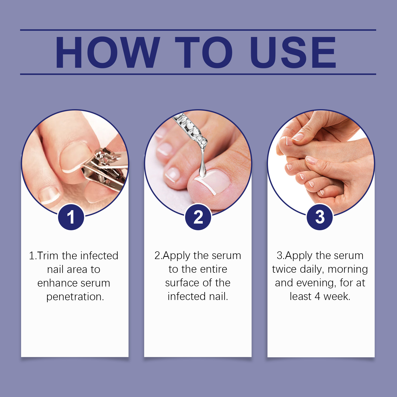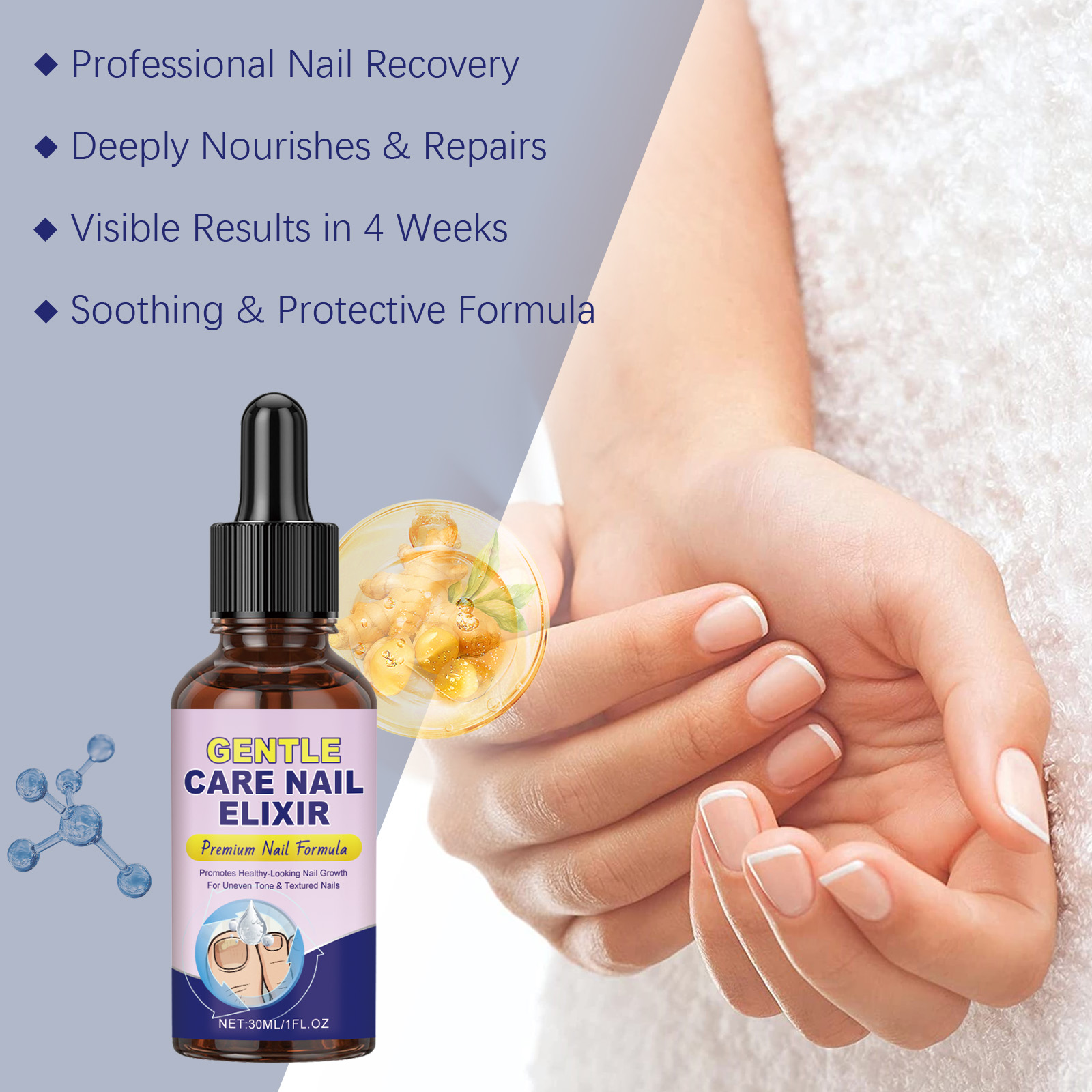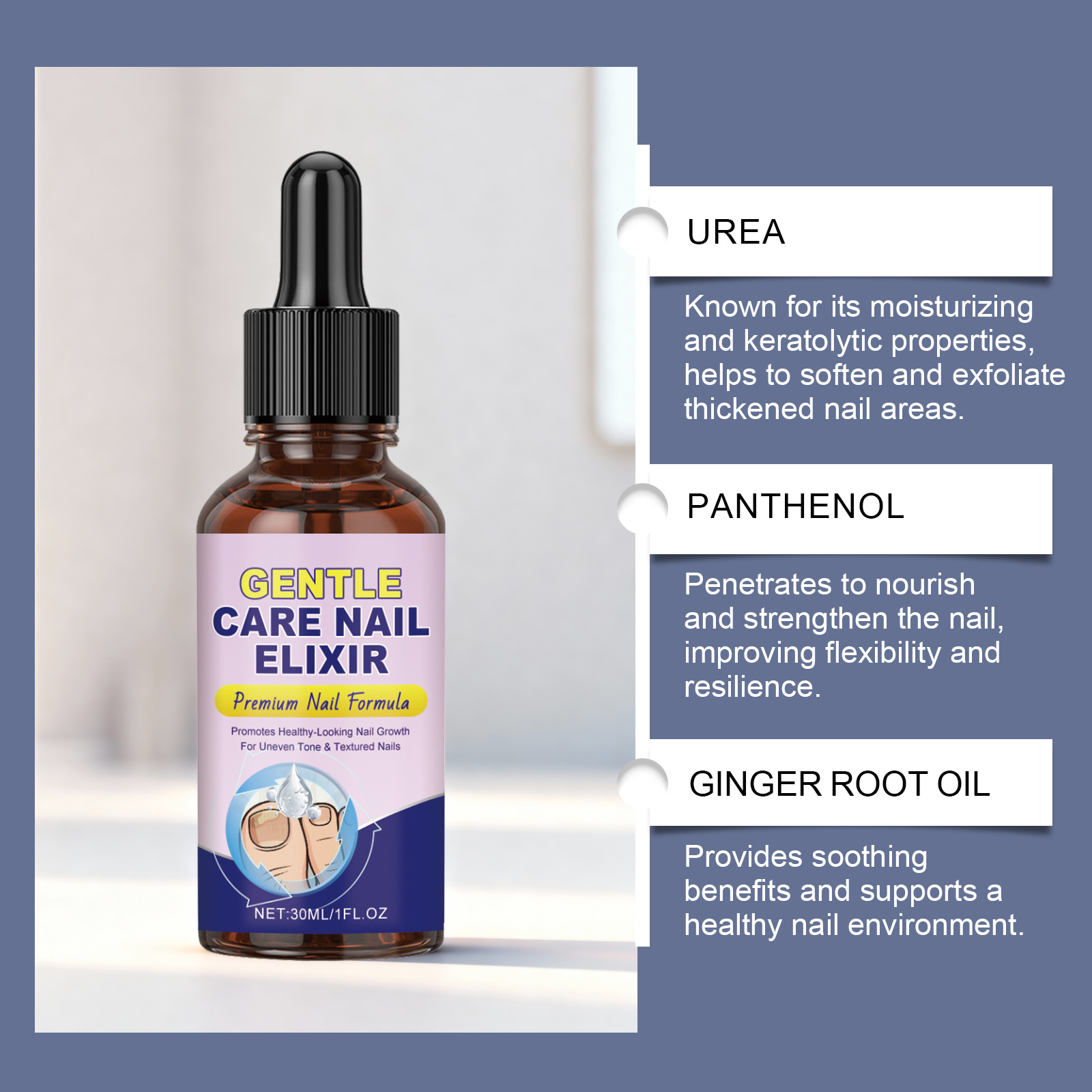 我们的指甲柔润护理液,由尿素、泛醇精心调配而成。专为有效杀菌、抑制真菌生长,并快速缓解甲癣,它使用温和成分不含有害化学物质,安全、温和且无刺激性设计。使用方法极为便捷:1.修剪患甲区域,以促进精华液吸收。2.用干棉签或布清洁甲面。3.将精华液涂抹于整个患甲表面。4.每日早晚各涂抹一次,至少持续4周。并且它可以改善脚趾甲的外观和健康状况,滋养、软化并强化脆弱或受损的脚趾甲,促进光滑健康的脚趾甲。