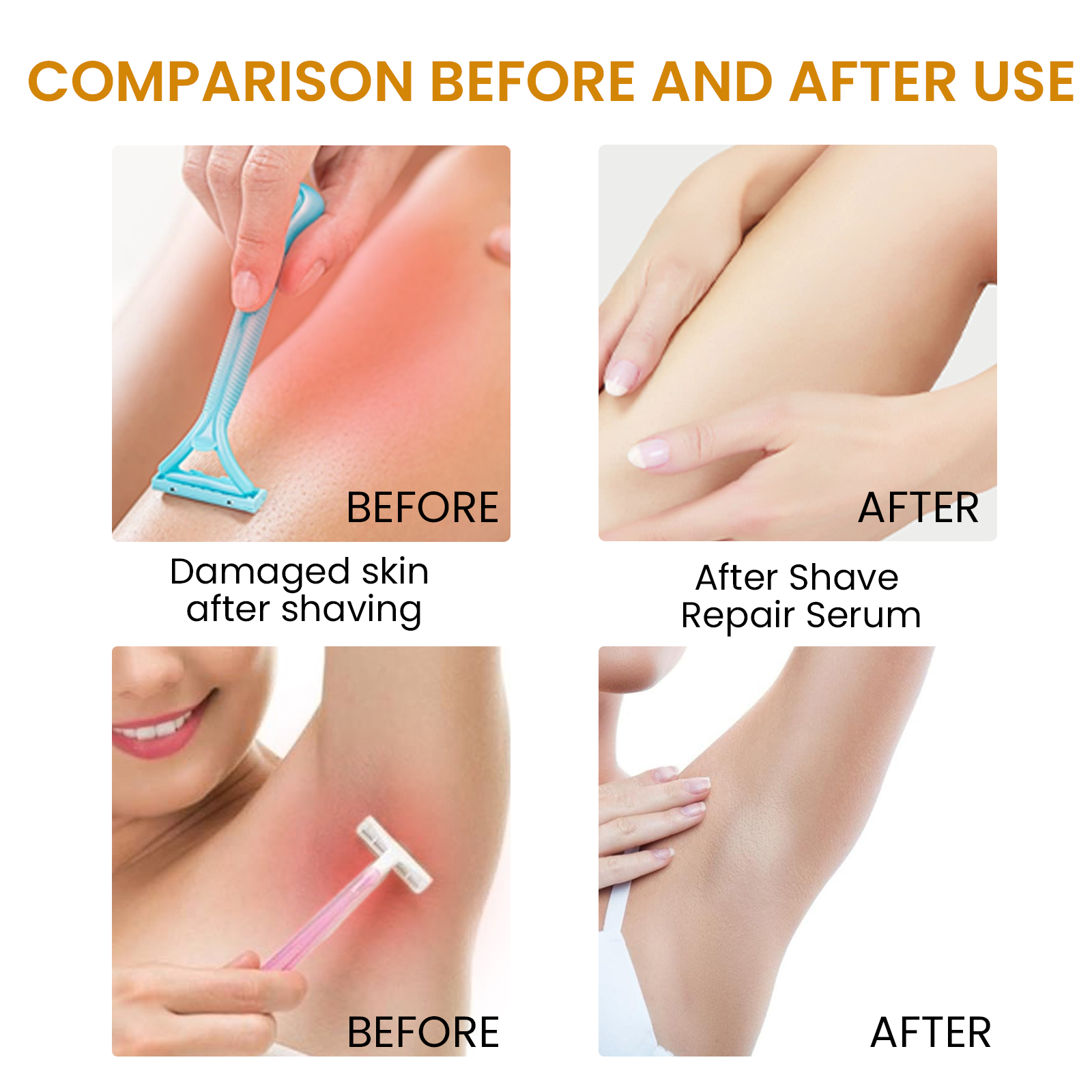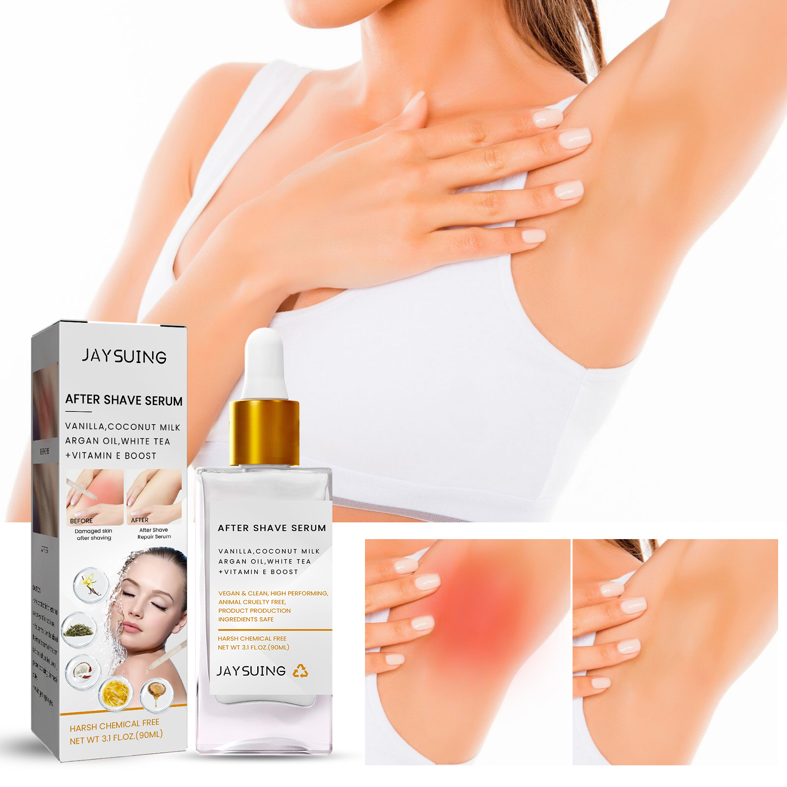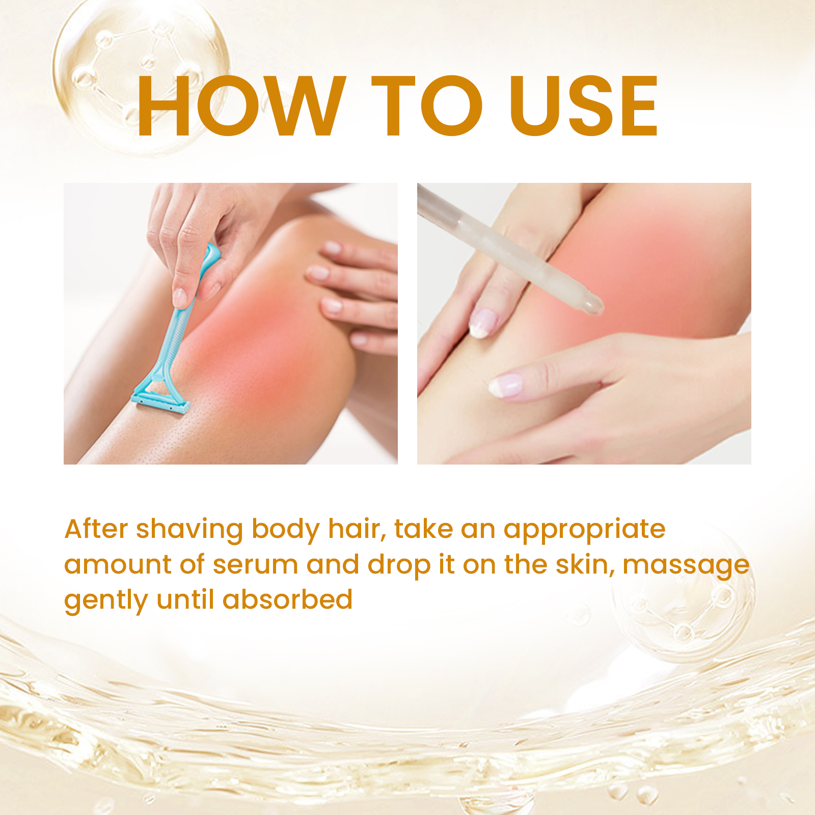 我们的脱毛护理精华含有香草,椰奶,摩洛哥坚果油。它可以屏障修复,舒缓褪色的红色,舒缓的护理,保湿。它的使用方法很简单:剃除体毛后,取适量精华液滴于皮肤上,轻轻按摩至吸收。防止头发内生,减少发红,舒缓皮肤,防止刮胡刀碰伤,提亮肤色。