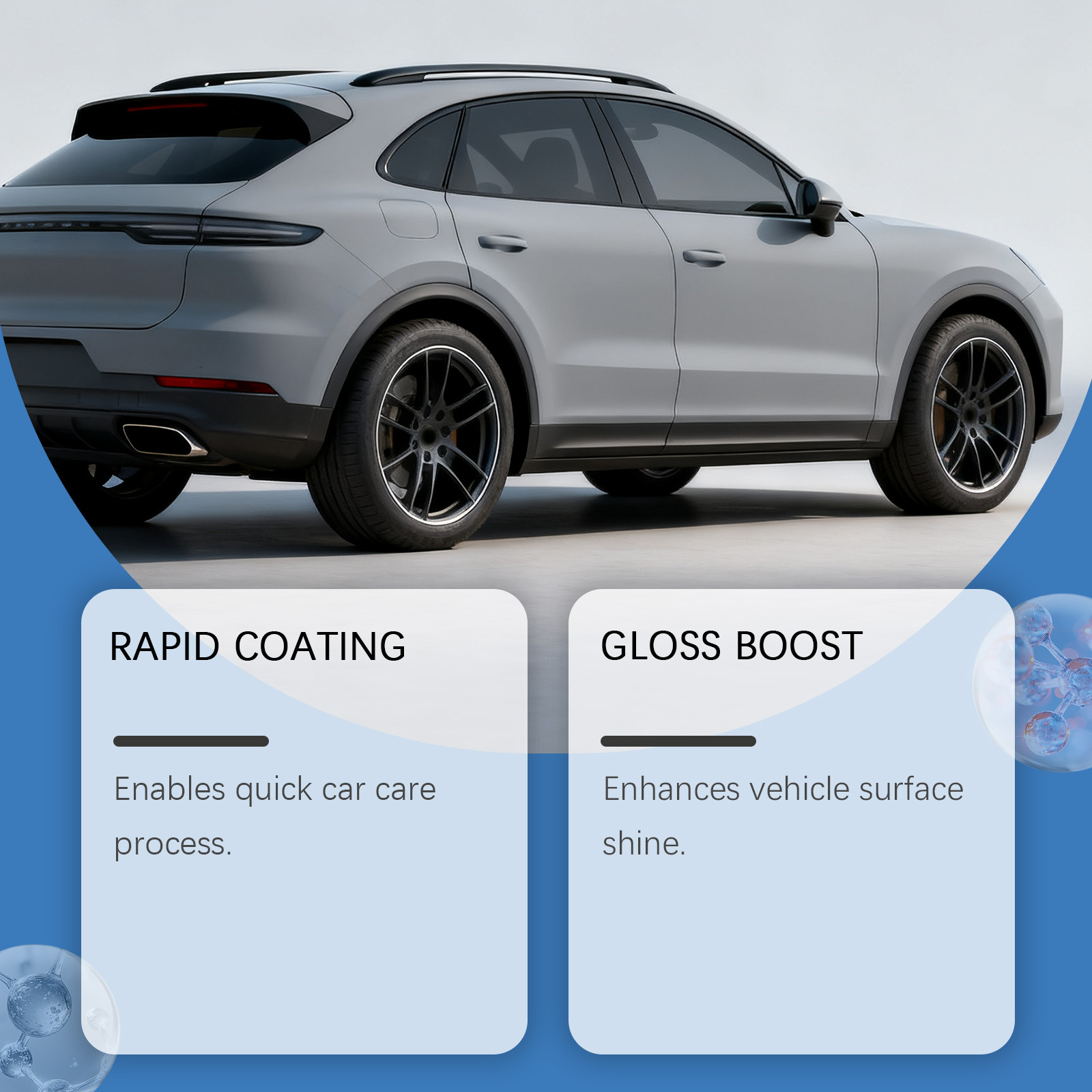我们的汽车涂层喷剂,由乙烯共聚物 、1,2-己二醇精心调配而成。专为增强车辆表面光泽设计。使用方法极为便捷:1.清洁汽车表面,以去除灰尘和杂质,并擦干。2.充分摇匀瓶子,并从距离表面约20厘米处均匀喷洒。3.用海绵擦拭直至抛光。并且可以实现快速涂层,带来快速汽车护理效果。