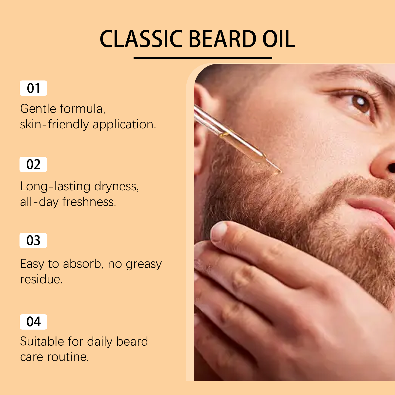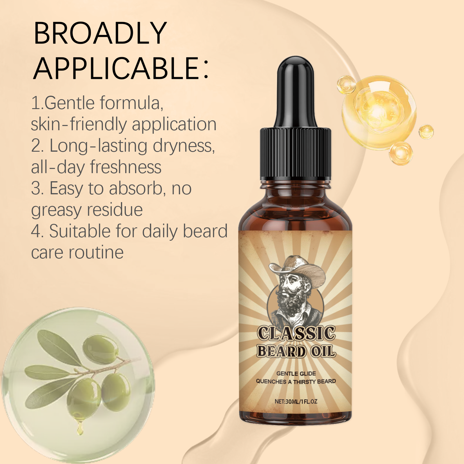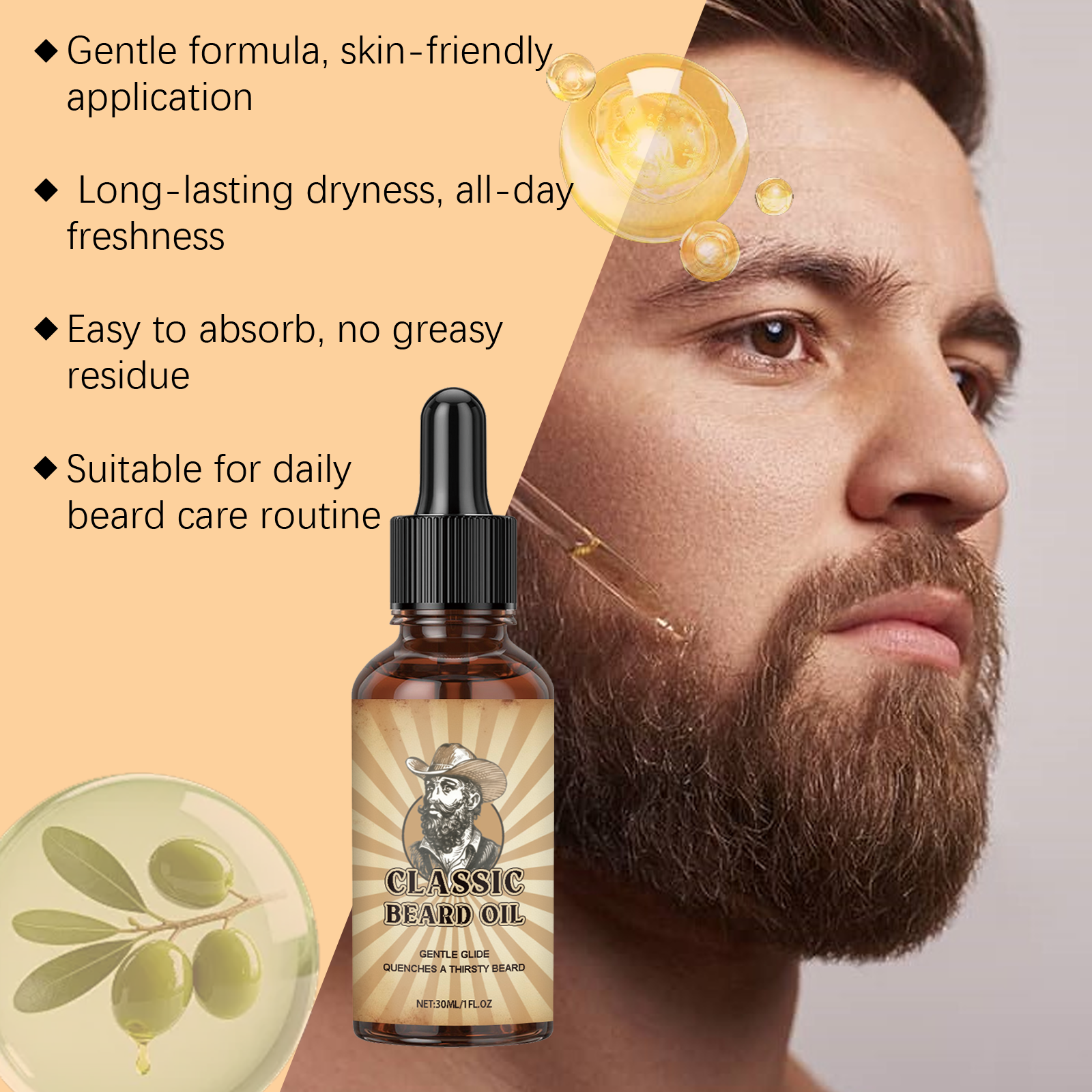 我们的胡须护理精油,由矿油、摩洛哥坚果油精心调配而成。专为日常护理必备,轻松保持干净干燥的胡须设计。使用方法极为便捷:1.清洁并干燥胡须。2.取几滴胡须油涂抹在胡须上。3.轻轻按摩使其吸收。并且它可以让胡须持久清新,深层清洁,去除胡须中的隐藏污垢。