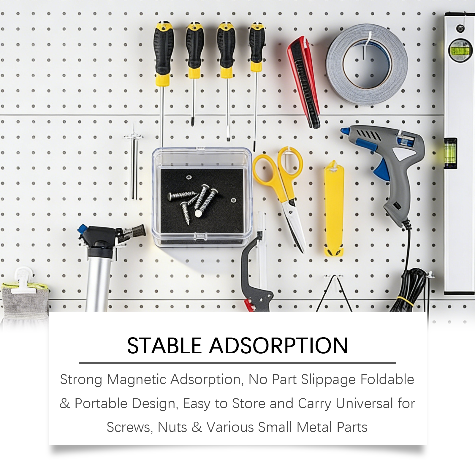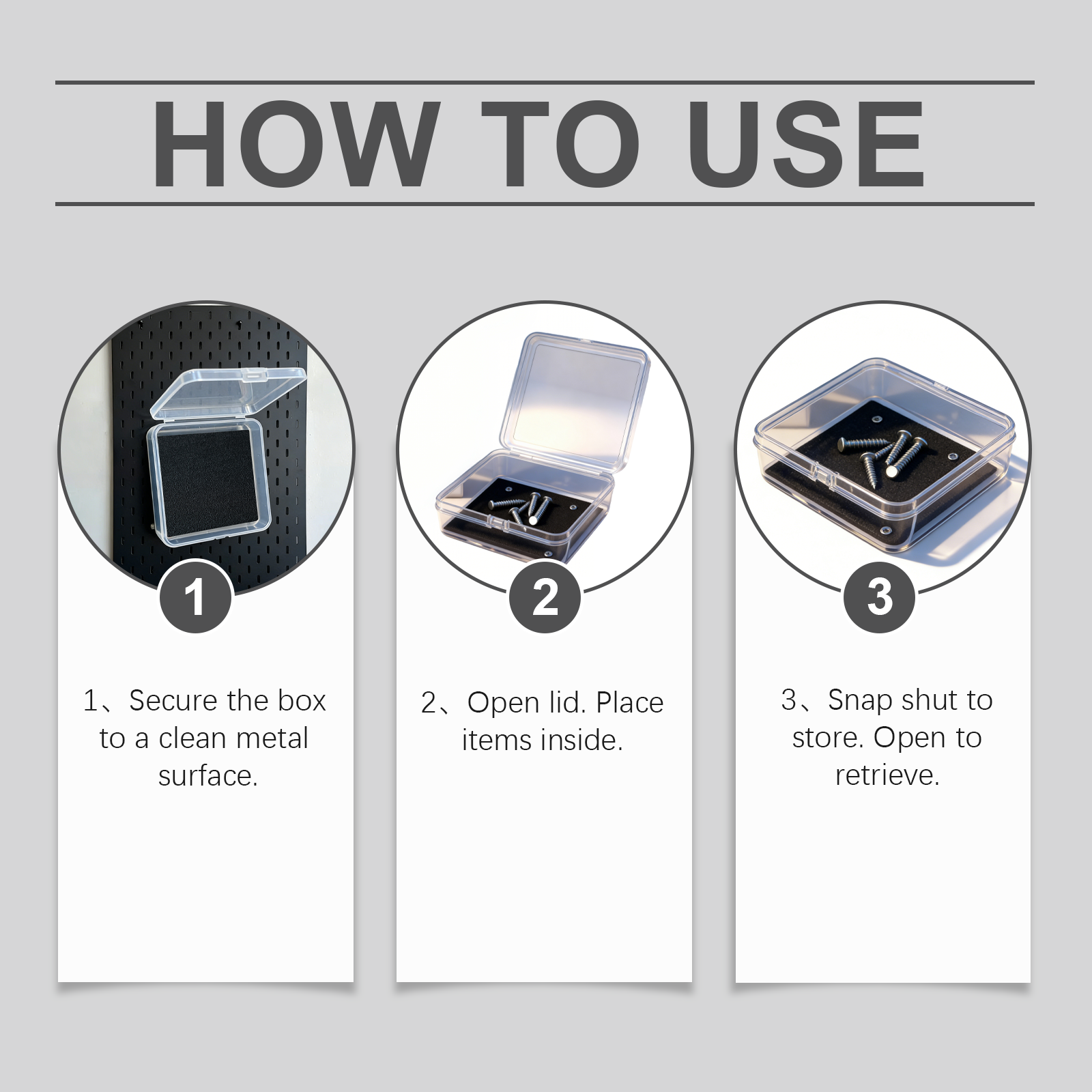 我们的磁力收纳盒,由聚丙烯、橡胶磁精心制作而成。专为整理工作区域并提升操作体验设计。使用方法极为便捷:1、将盒子固定在一块干净的金属表面上。2、打开盖子。将物品放入其中。3、向上按压可锁住储物舱。向下拉则可取出物品。并且适用于各种存储方式如工具袋和口袋,便携设计,是户外作业的优秀助手。