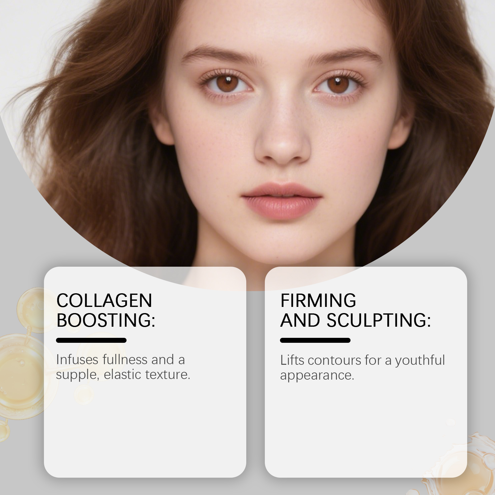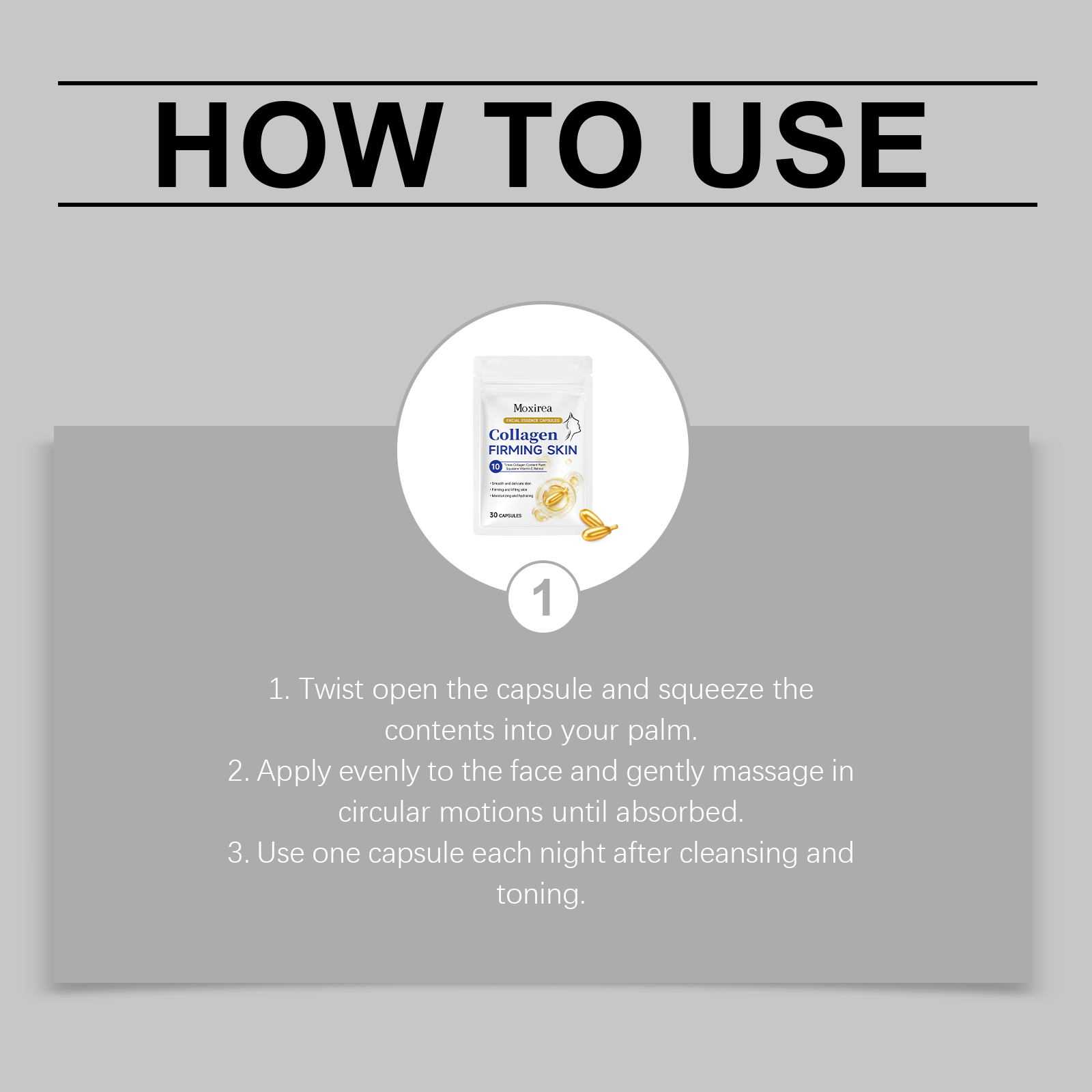 我们的胶原面部精华胶囊,由生育酚(维生素E)、视黄醇精心调配而成。专为赋予肌肤饱满感设计。使用方法极为便捷:1.扭开胶囊,将内容物挤入掌心。2.均匀涂抹于面部,以打圈方式轻柔按摩至吸收。3.每晚洁面和爽肤后使用一粒胶囊。并且可以提升轮廓,呈现年轻外观。