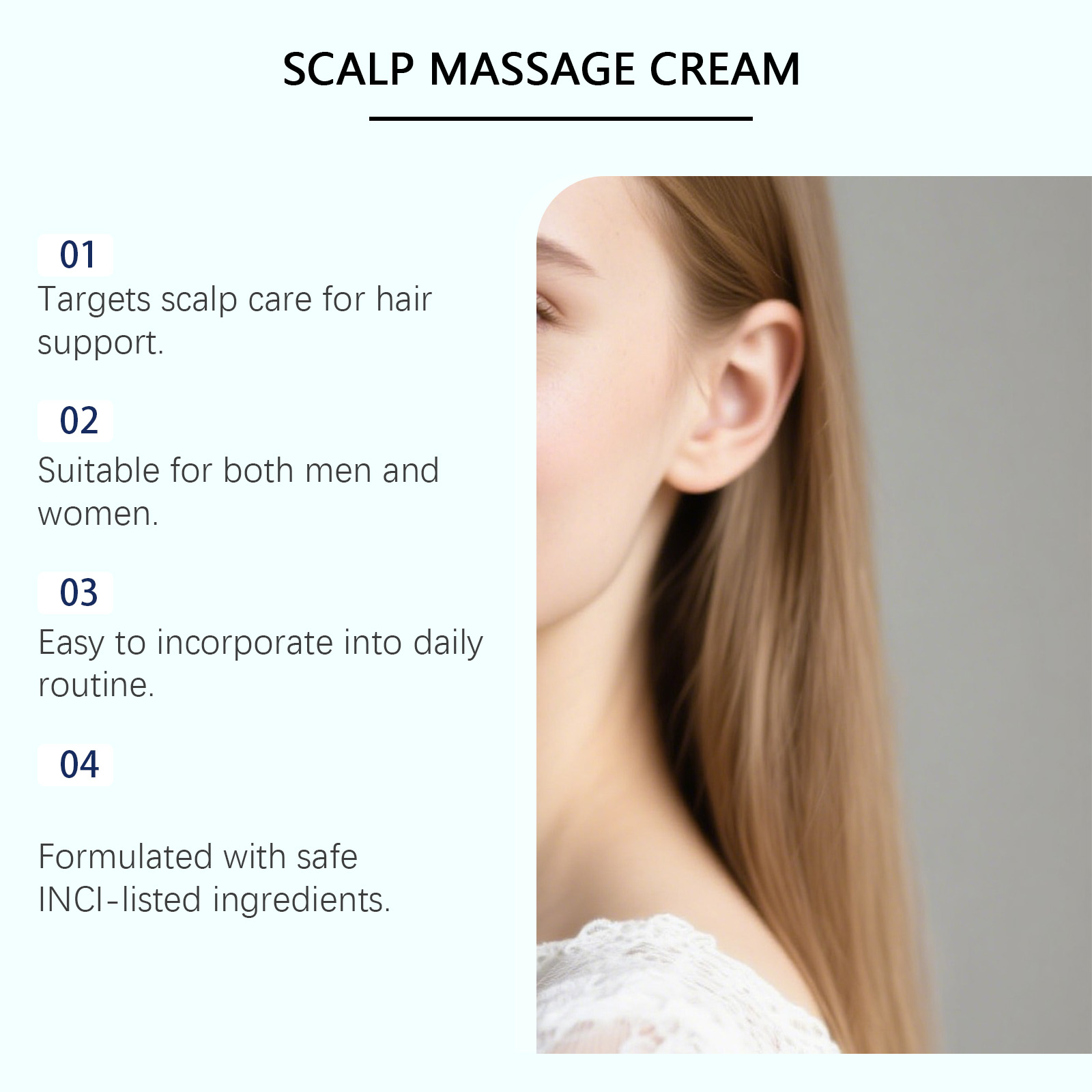 我们的角蛋白头皮按摩霜,由矿油、甘油精心调配而成。专为强化发根设计。使用方法极为便捷:彻底清洁并擦干头皮。将适量本品均匀涂抹于头皮。用指尖轻轻按摩头皮,以促进吸收。并且可以减少脱发。