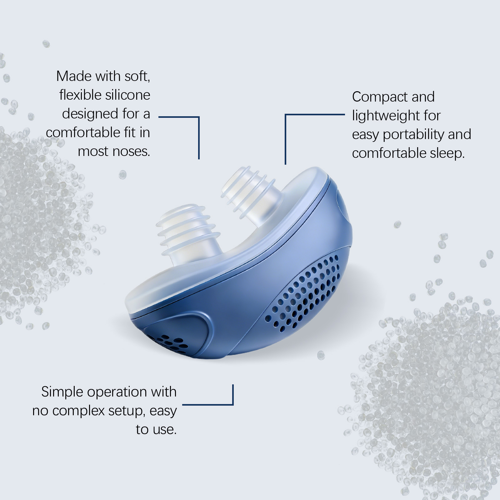 我们的双涡流睡眠辅助仪,由ABS/硅胶精心调配而成。专为提供持续的气流,帮助保持呼吸道畅通并减少打鼾设计。使用方法极为便捷:本产品适用于呼吸不畅者使用,1.开启开关,2.将硅胶体插入鼻腔内。并且它可以产生温和、持续的气流,以保持上呼吸道通畅防止软组织塌陷,减少打鼾,并提高睡眠质量。