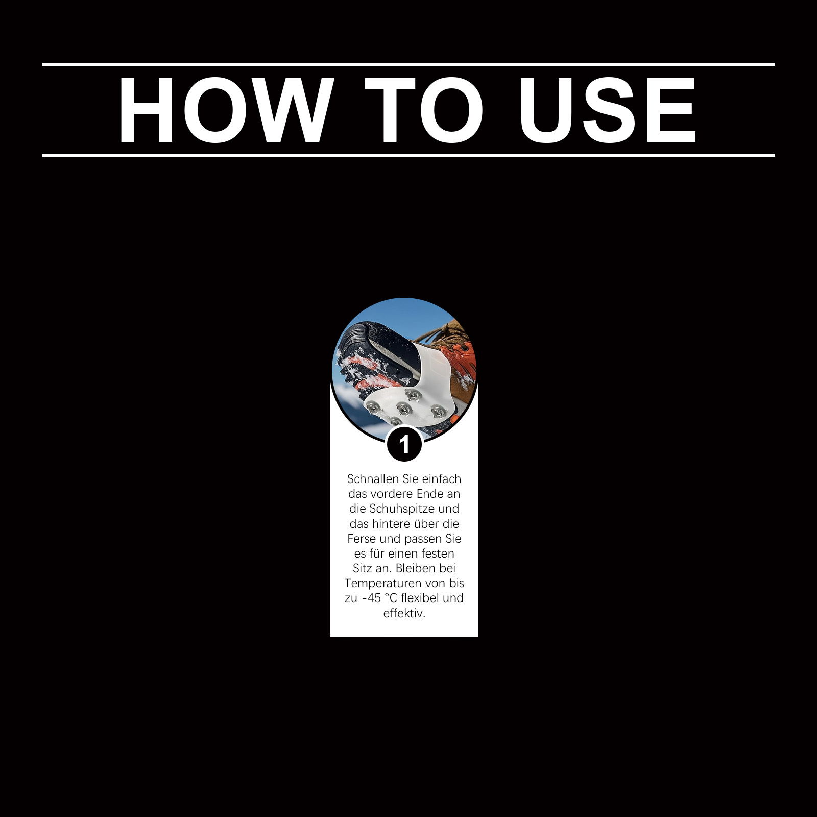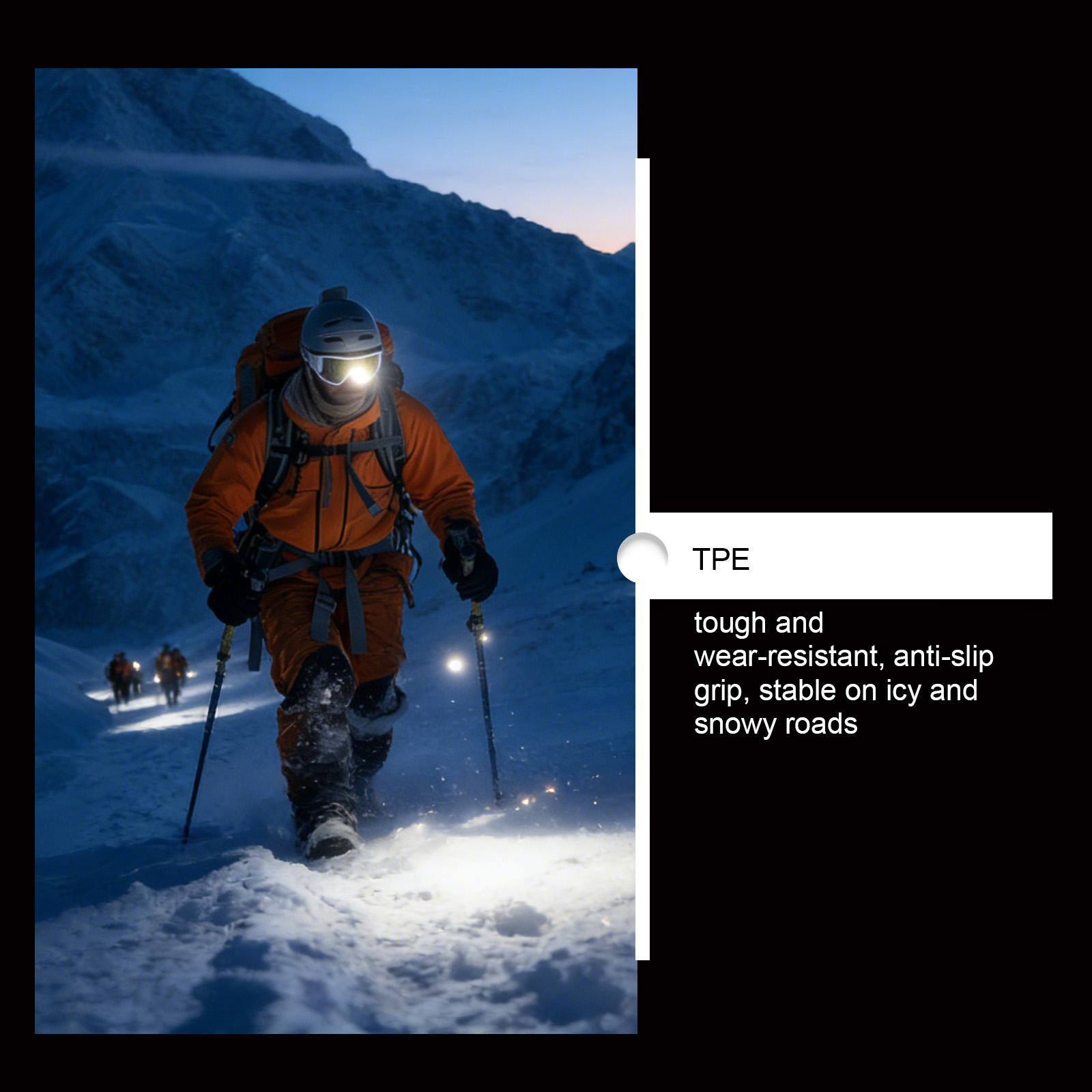 我们的防滑鞋钉,由TPE精心制作而成。专为防止在冰上滑倒设计,使用方法极为便捷:只需将前端系在鞋尖上,后端系在鞋跟上,并将其调整为牢固的坐姿。在高达-45°C的温度下,保持灵活和高效。 并且采用高弹性橡胶,增强耐用性。
