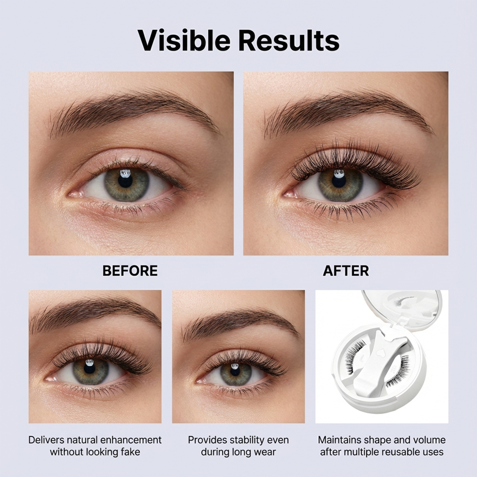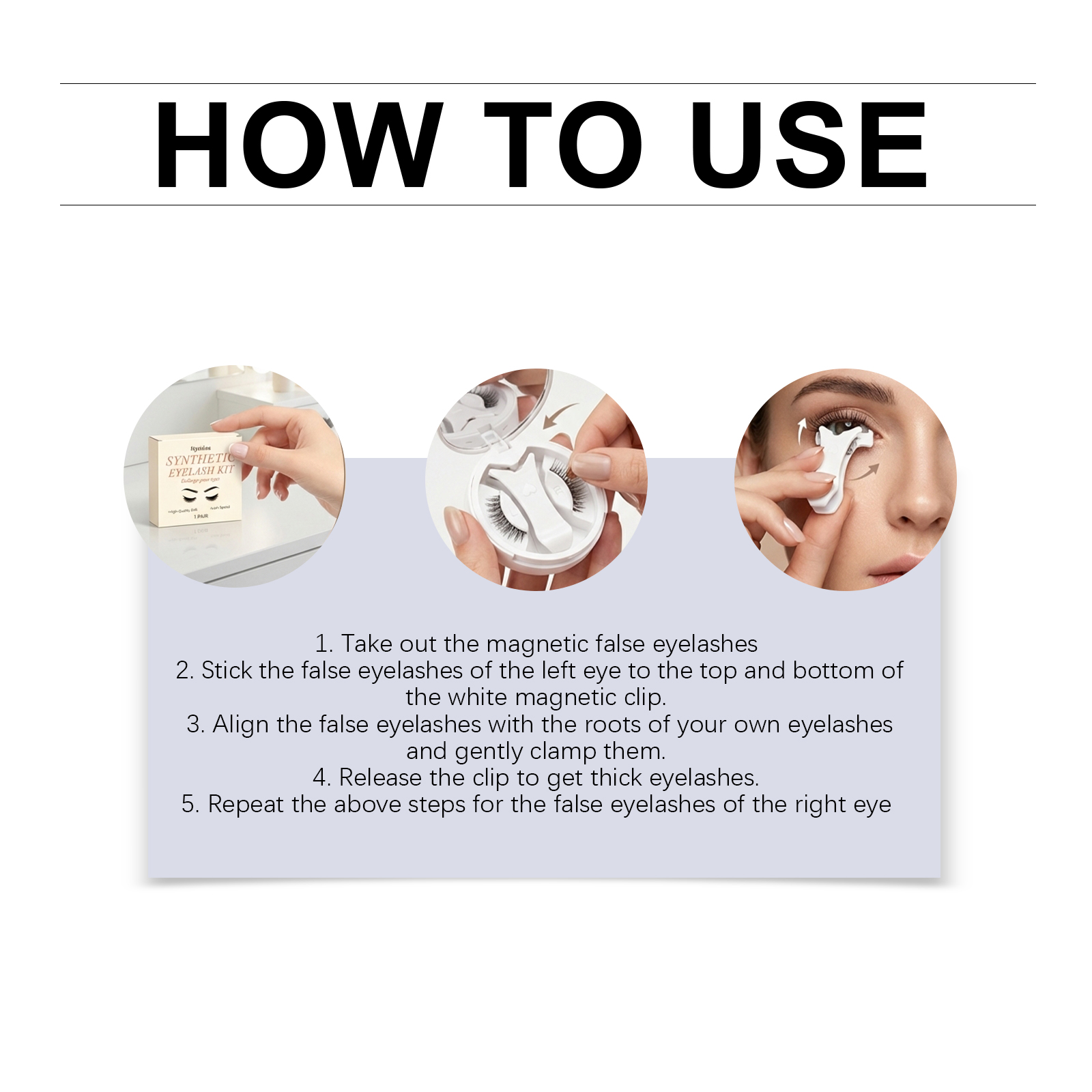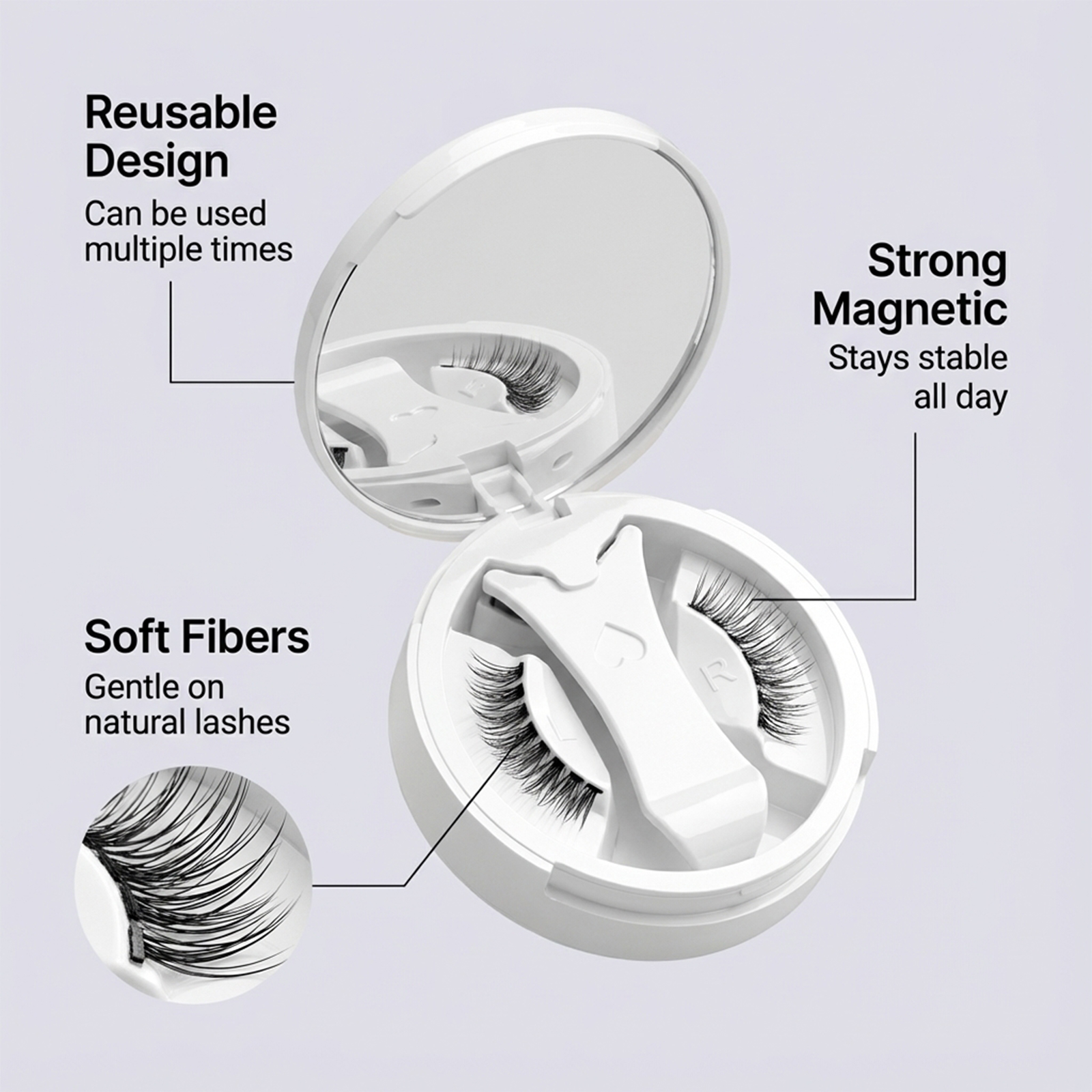 我们的卷翘款磁吸假睫毛套装,由化纤精心制作而成。专为强磁铁牢固吸附,可重复使用设计保持形状设计。使用方法极为便捷:1.取出磁性假睫毛。2.将左眼的假睫毛粘贴到白色磁性夹子的顶部和底部。3.将假睫毛与你自己的睫毛根部对齐并轻轻夹紧。4.松开夹子以获得浓密的假睫毛。5.对右眼的假睫毛重复上述步骤。并且它具有柔性磁性条带,便于对齐,柔软纤维确保舒适佩戴。