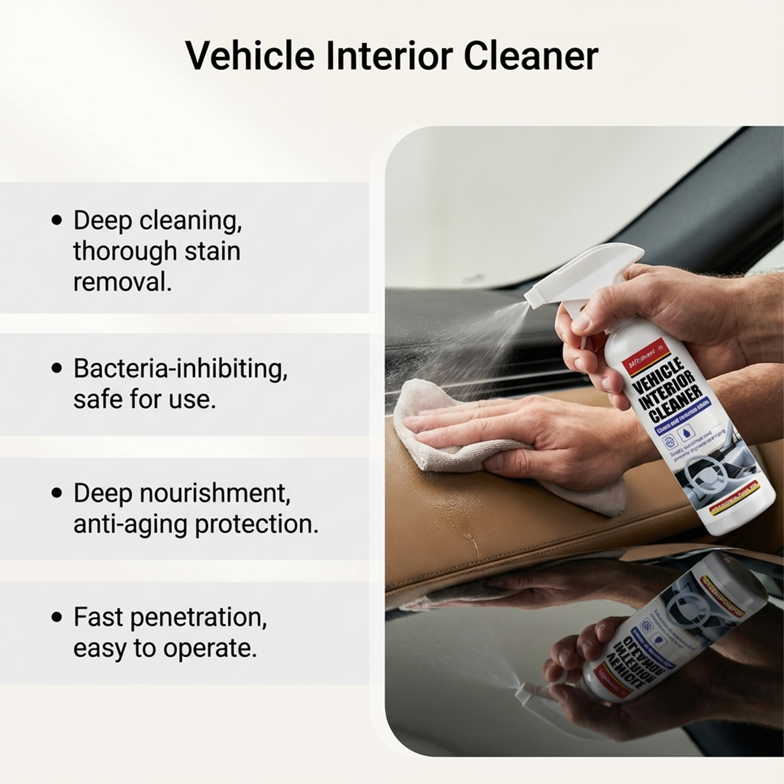 我们的汽车内饰清洁剂,由癸基葡糖苷、1,2-己二醇精心调配而成。专为有效渗透,以消除隐藏污渍设计。使用方法极为便捷:1.均匀喷洒在目标汽车内饰区域。2.用干净的布或海绵轻轻擦拭。3.用干毛巾擦干,以获得最佳效果。4.在内饰表面冷却干燥时使用。并且可以抑制细菌,使汽车内部更清洁。