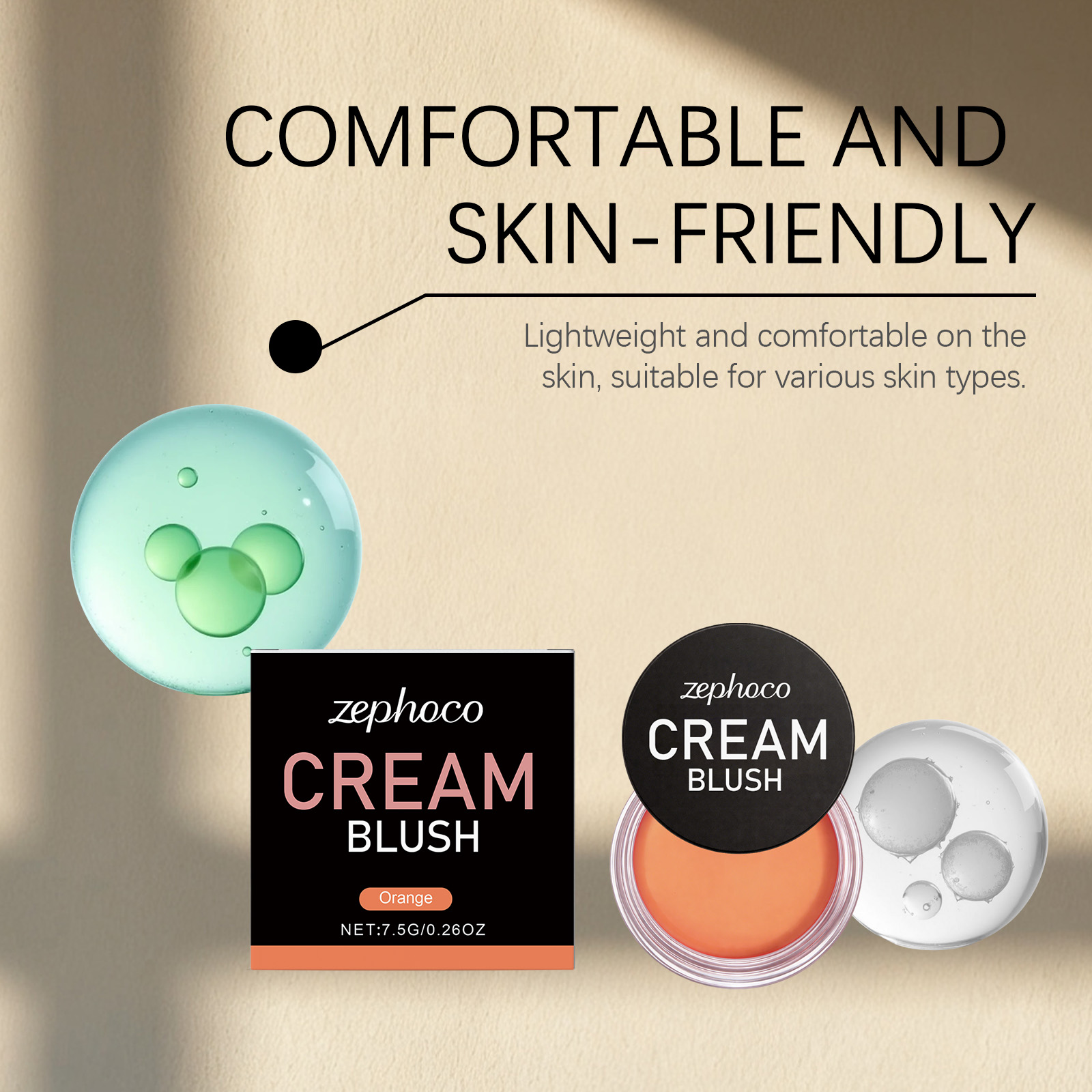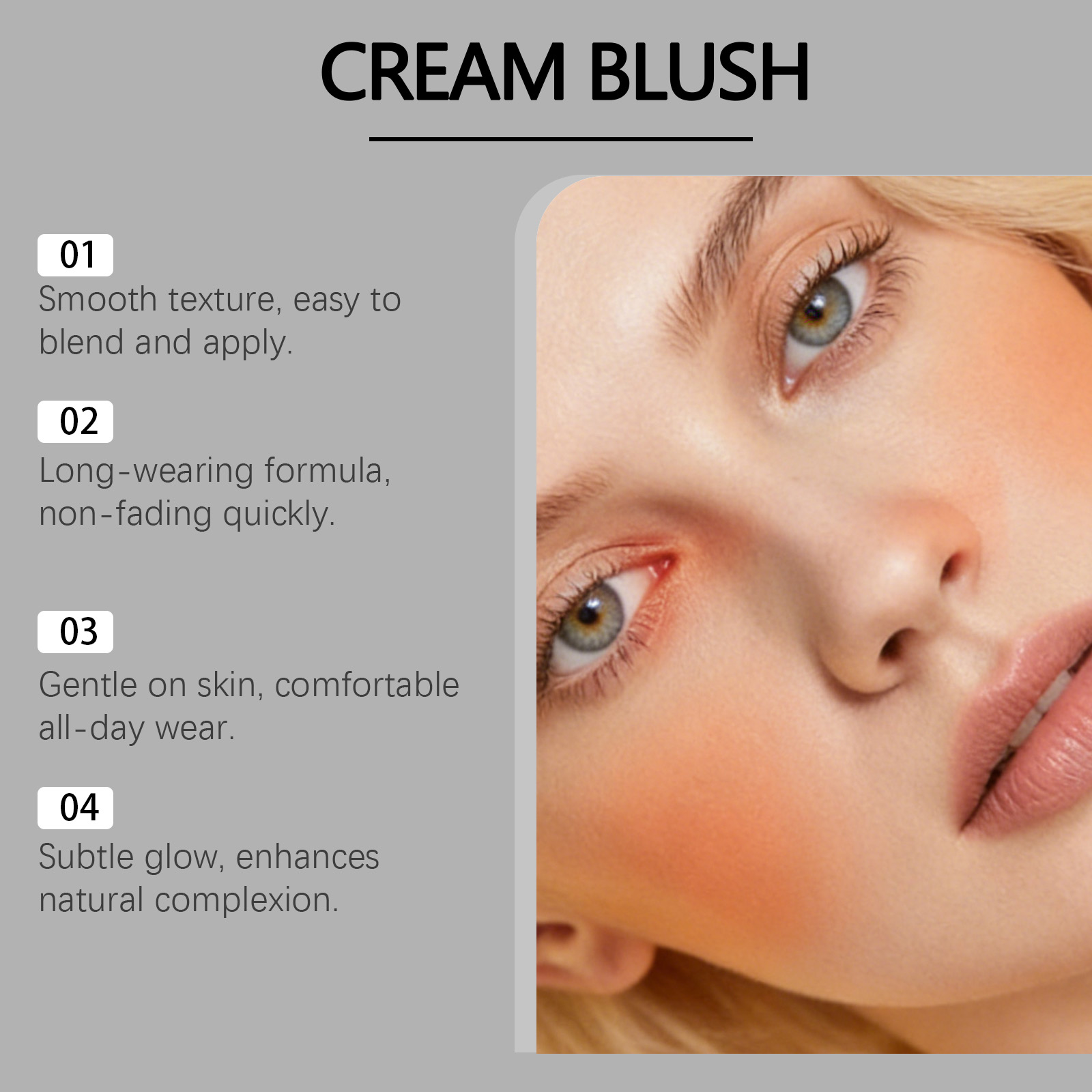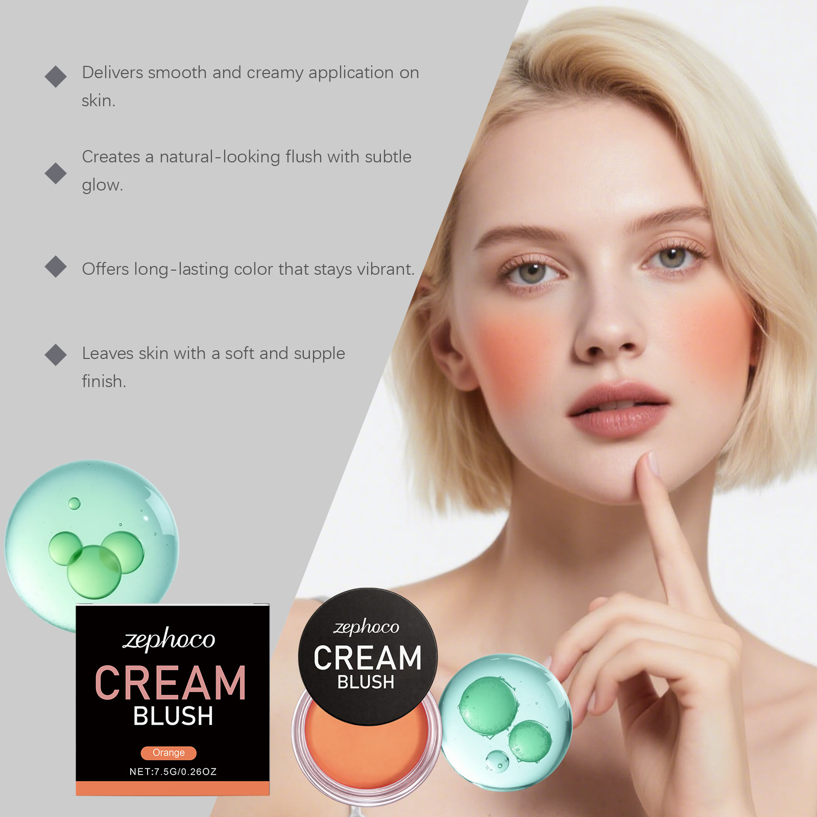 我们的橘色丝滑润肤腮红,由矿油、云母精心调配而成。专为自然提亮肤色,打造光彩照人的光泽设计。使用方法极为便捷:清洁面部后打开盖子,取适量膏体涂抹于面部颧骨处,用指腹晕染涂抹均匀。并且它涂抹顺滑且轻松,附着力强,不易结块,锁住色彩,实现持久鲜艳的妆效。