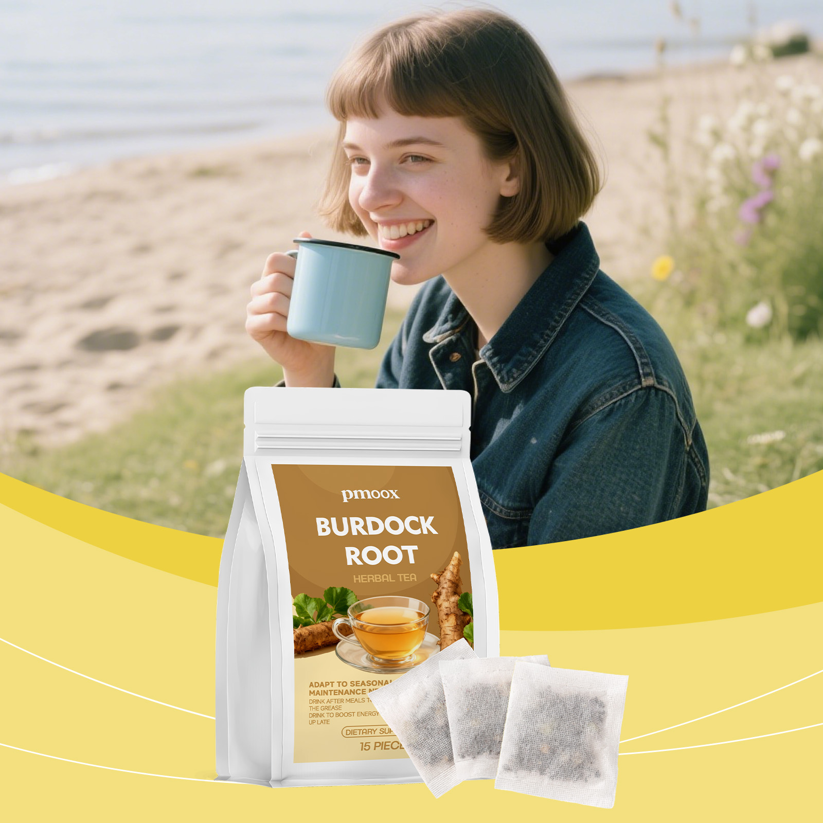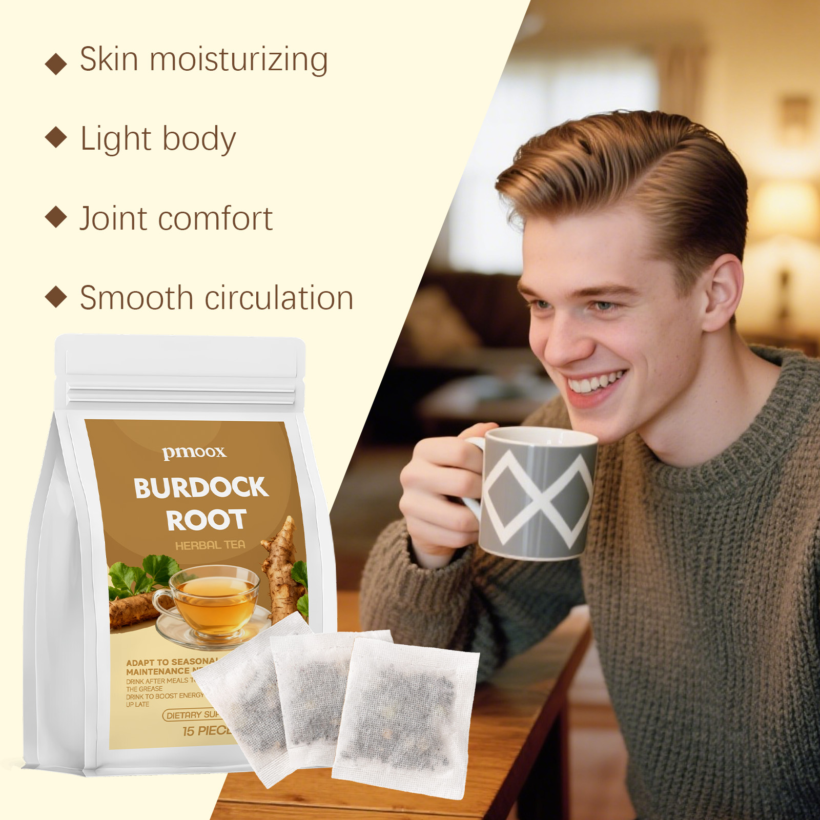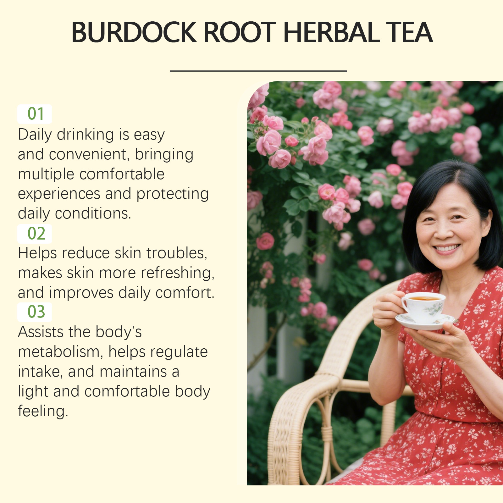 我们的牛蒡根,由牛蒡根精心调配而成。专为有助于改善皮肤状况,减少常见问题,并带来清爽的感觉,有助于调节日常摄入,促进身体代谢,并维持轻盈的身体感觉设计。使用方法极为便捷:1.打开茶包,将茶包放入杯中。2.将水煮至约90°℃,倒入杯中浸泡茶包。3.让其浸泡3-5分钟,然后享用芳香的茶。并且它可以保护皮肤并减少问题。
