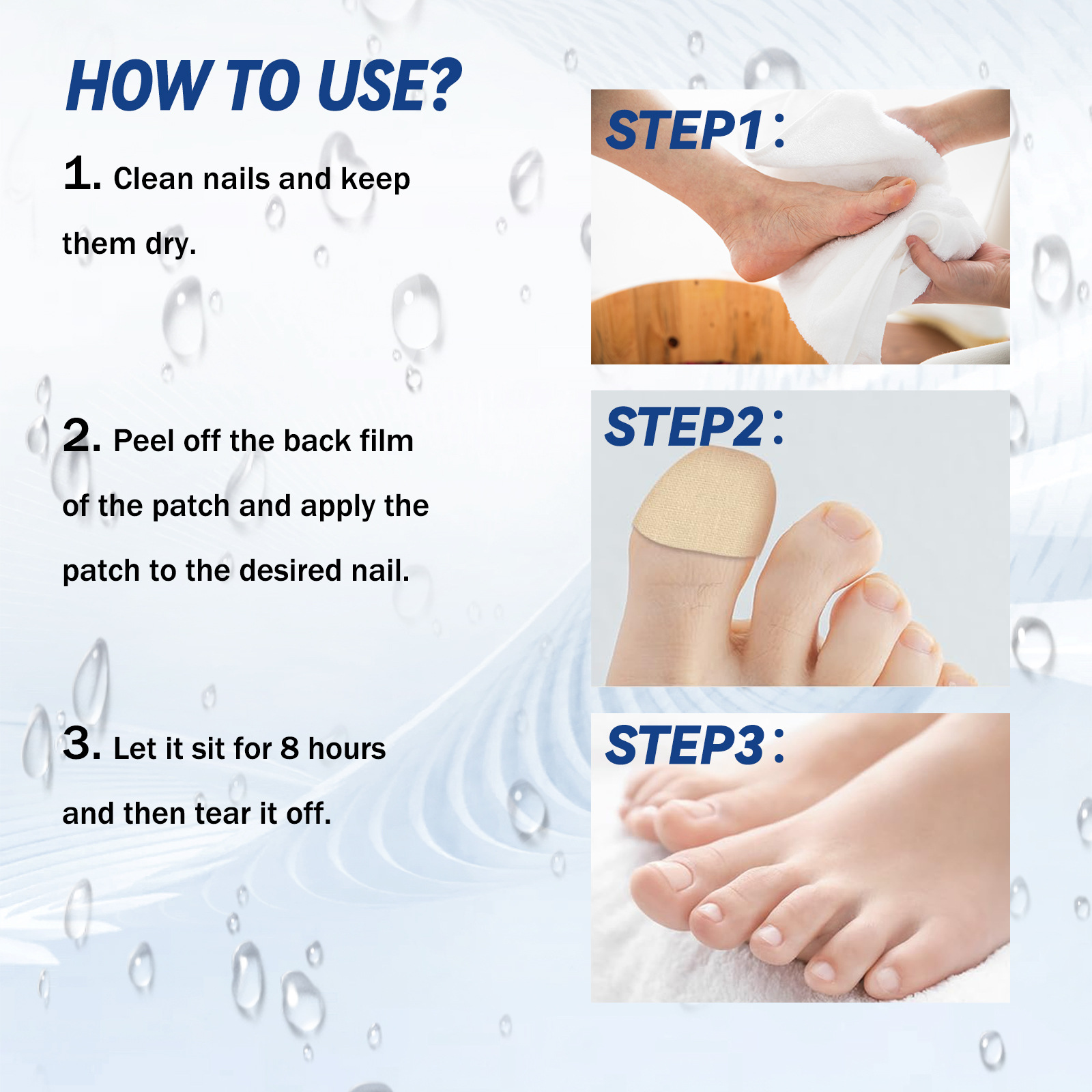 我们的脚趾修护贴含有无纺布。它可以改善受损指甲,减少变色,帮助正常化厚度,改善指甲外观,使脆弱的指甲恢复活力。它的使用方法很简单:清洁指甲并擦干,撕下贴片的背膜,将贴片贴在所需的指甲上,让它静置8小时然后撕下来即可。可以减少指甲变黄、变形、变黑,有效恢复脆弱指甲,促进新指甲生长。