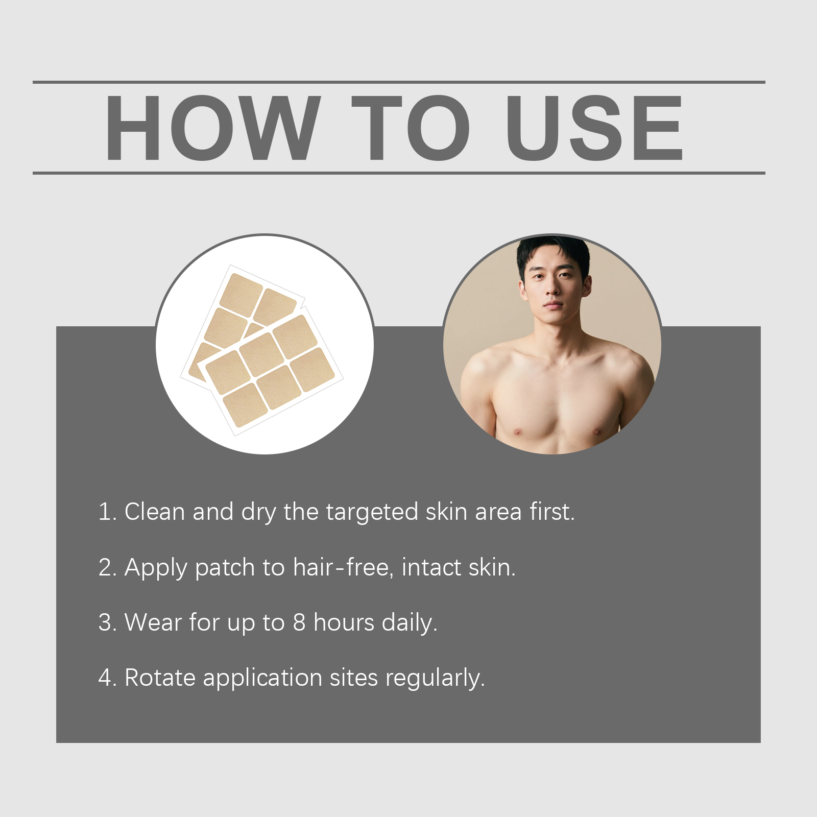 我们的男性护理贴,由锯叶棕果提取物、生育酚(维生素E)精心调配而成,专为维持前列腺舒适水平设计。使用方法极为便捷:1.首先,清洁并擦干目标皮肤区域。2.将贴片贴在无毛、完整的皮肤上。3.每日佩戴时间最长可达8小时。4.定期轮换使用部位。并且可以减轻疲劳和低能量感。
