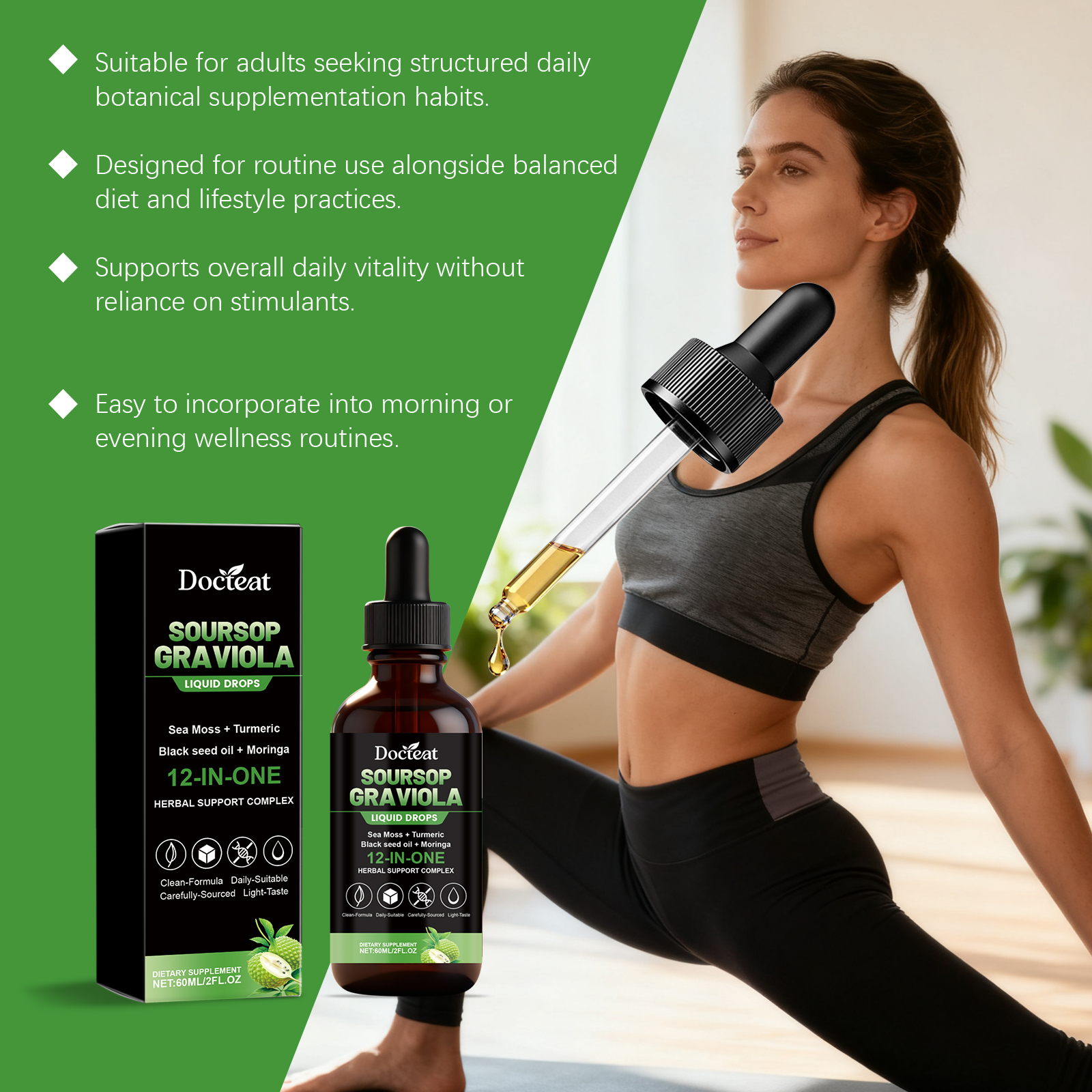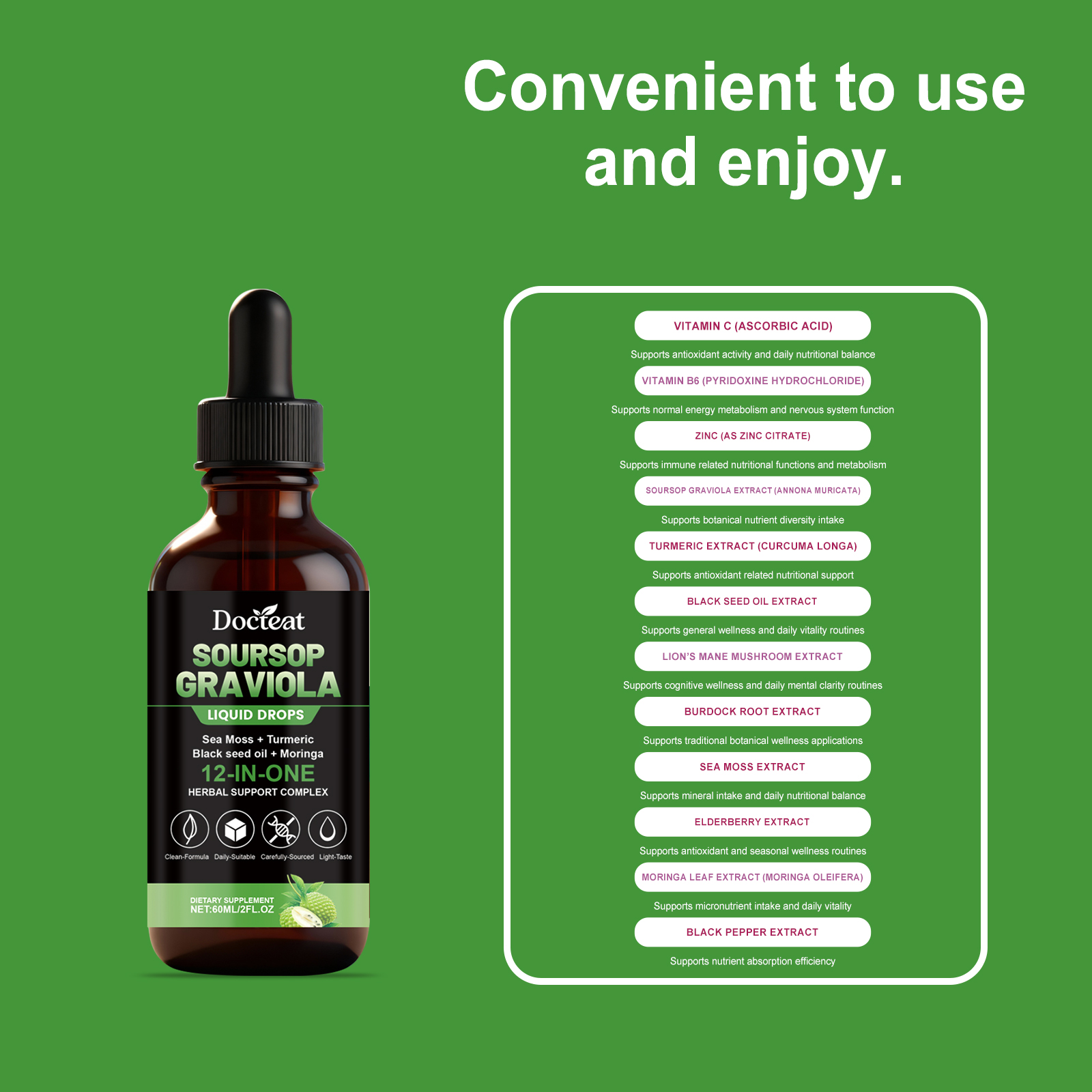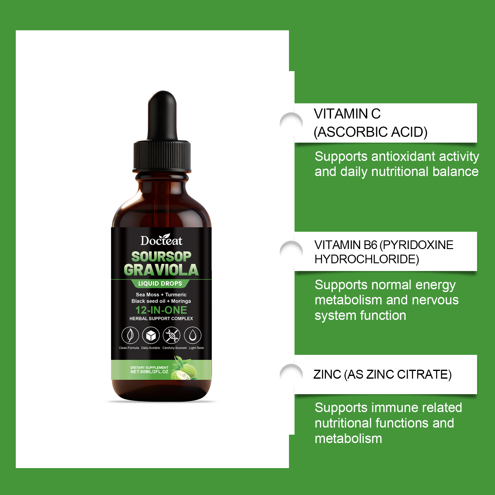 我们的12合1刺果番荔枝苦味滴剂,由维生素C(抗坏血酸)、维生素B6(盐酸哆醇)精心调配而成。专为通过将多种植物和营养来源组合成一种易于服用的液体形式,来补充日常健康习惯设计。使用方法极为便捷:每天服用 2 毫升,可直接服用,也可与食物混合服用。并且它可以支持抗氧化活性和日常营养平衡。