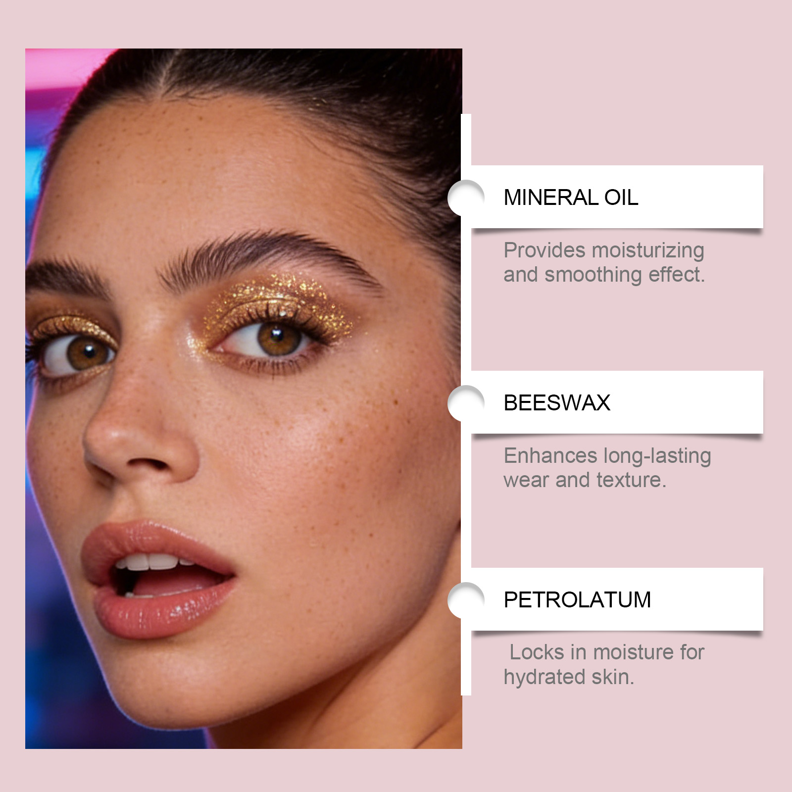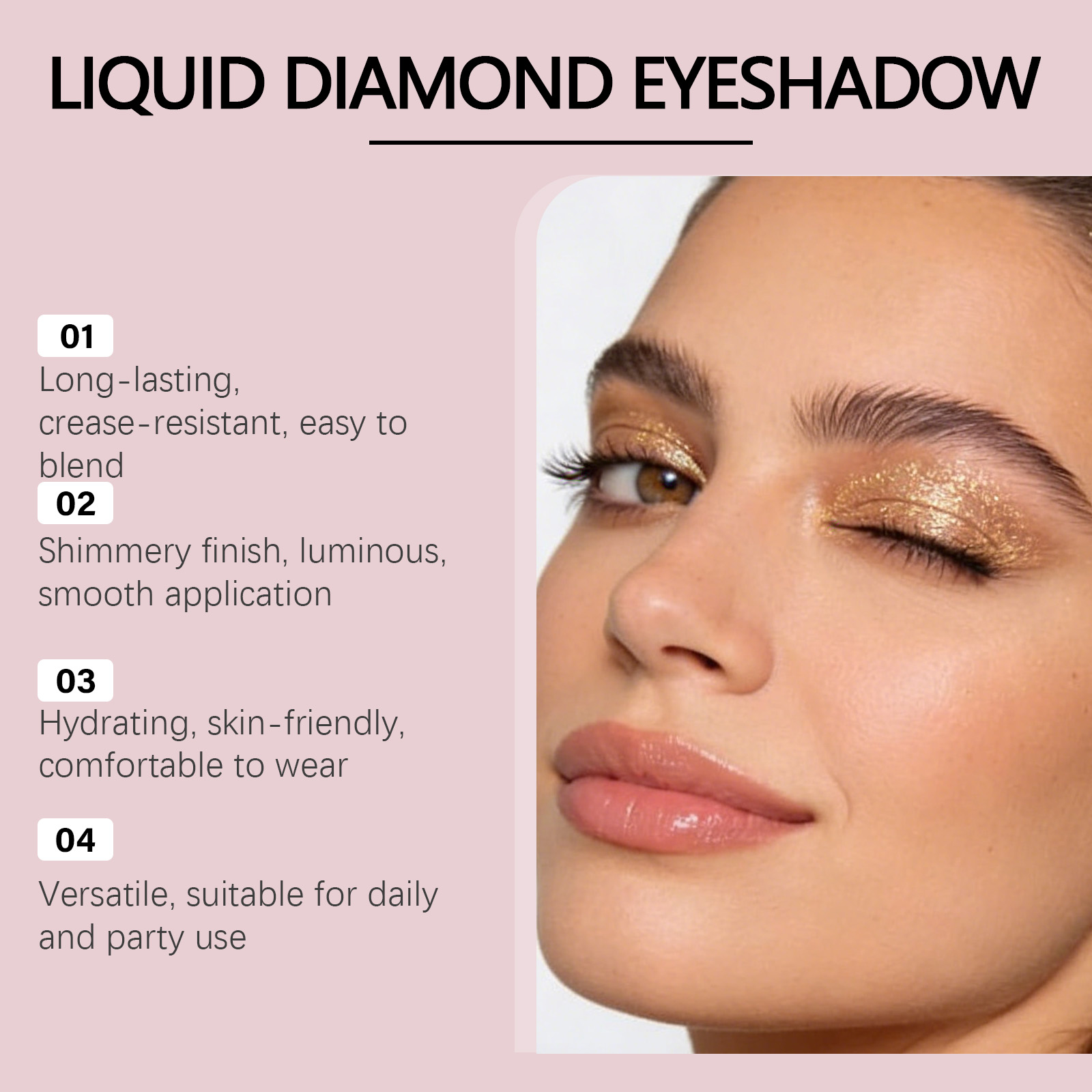 我们的钻石闪光眼影(金色),由矿油、蜂蜡精心调配而成。专为提供保湿和柔滑效果设计。使用方法极为便捷:1. 完成底妆后。2. 取适量本品涂抹于眼睑或上眼皮肌肤。3. 用手指或晕染刷轻轻晕染开。并且它可以带来令人惊叹的3D闪耀效果。