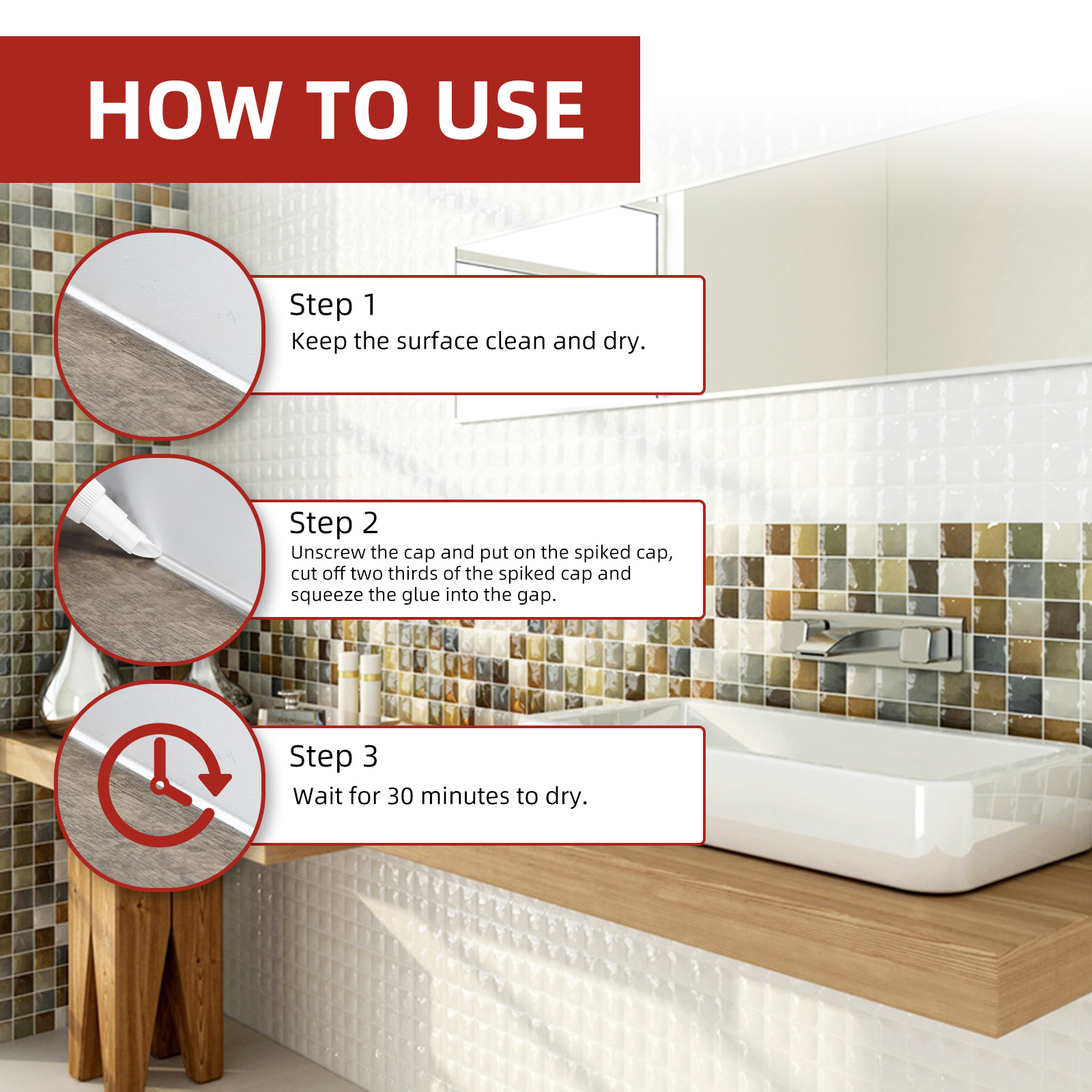 我们的家用防水密封胶含有聚二甲基硅氧烷、聚氨酯、甲基丙烯酸甲酯。它可以有效阻止水分渗透,保护家居结构不受潮,保持环境干爽清洁。它的使用方法很简单:保持表面清洁和干燥,拧下瓶盖,戴上尖嘴,把尖嘴切掉三分之二,把胶水挤到缝隙里,等待30分钟晾干即可。具有持久的密封效果,且不易受时间和环境的影响,不会变黄、开裂或剥落,长期保持稳定。适用于各种家居表面和场景,包括浴室、厨房、厕所、墙壁地板、台面等,具有广泛的应用范围。