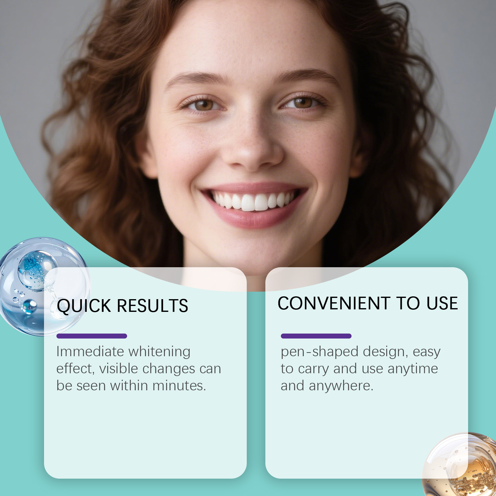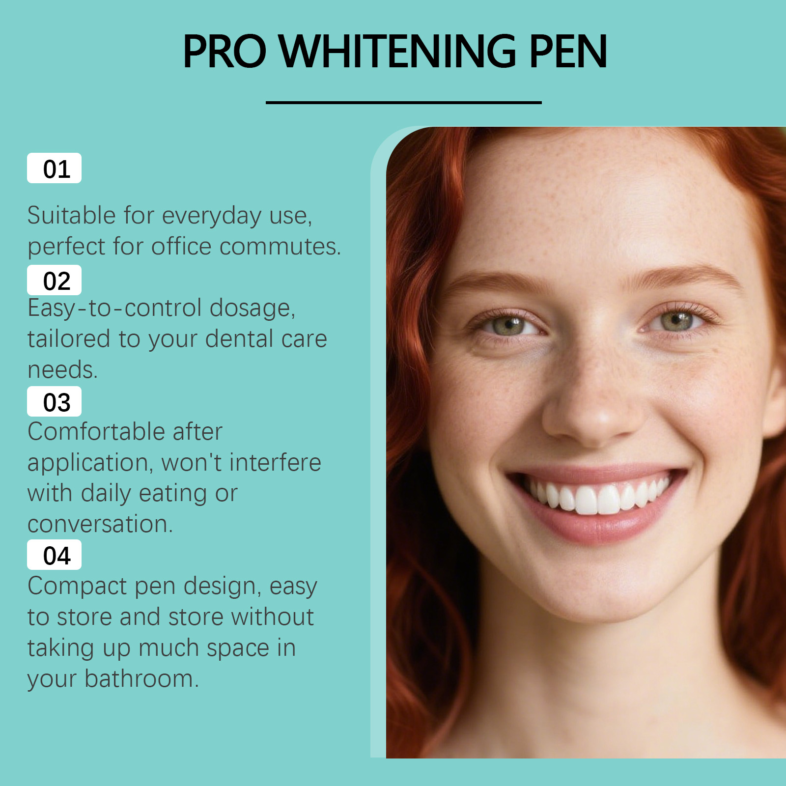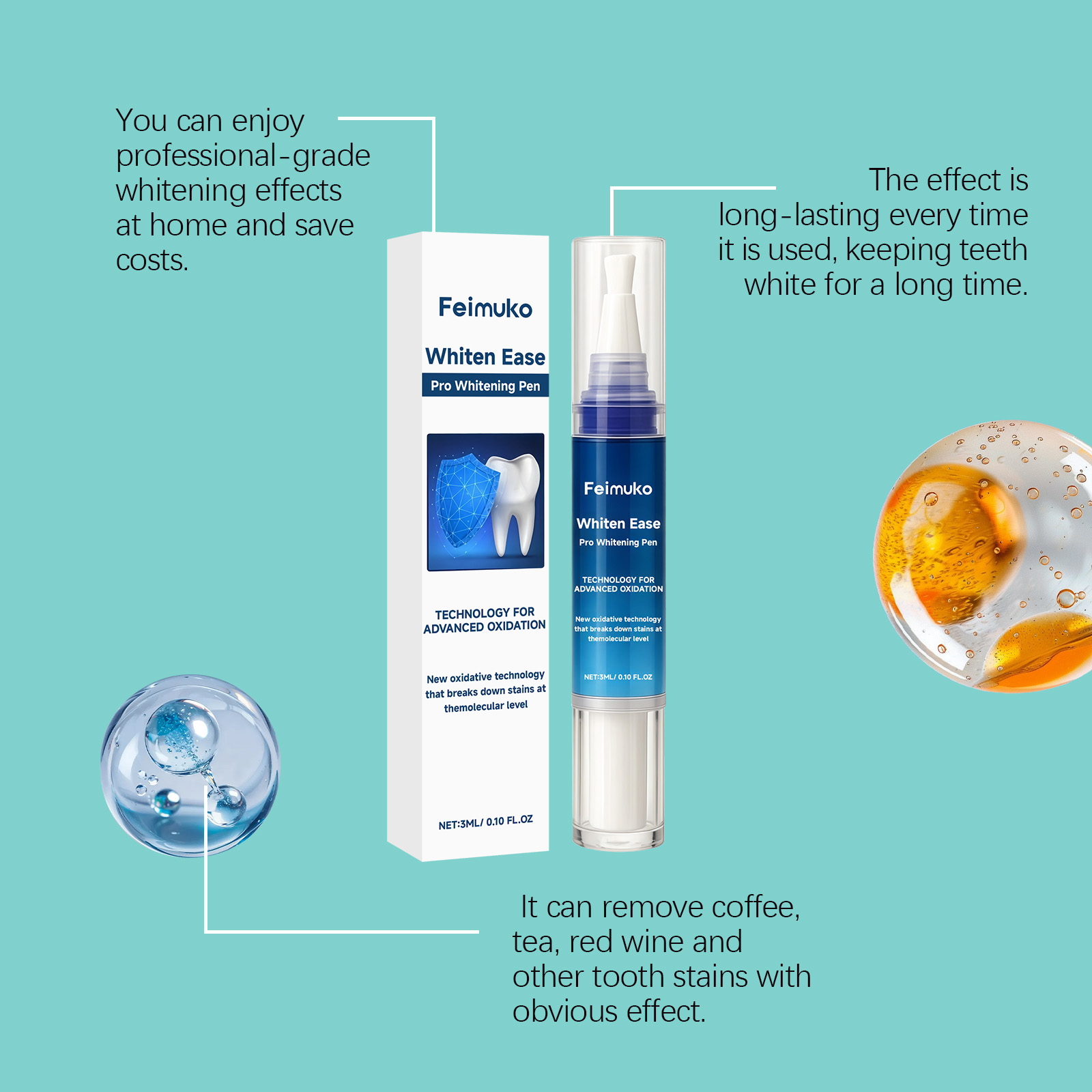我们的牙齿护理笔,由库拉索芦荟提取物、抗坏血酸(维生素C)精心调配而成。专为即时美白效果设计。使用方法极为便捷:首先,确保你的牙齿清洁且干燥。2.打开笔帽,顺时针旋转底部以挤出适量产品,然后轻轻将薄层涂抹于每颗牙齿上,确保均匀覆盖。并且采用笔形设计,便于携带,随时随地使用。
