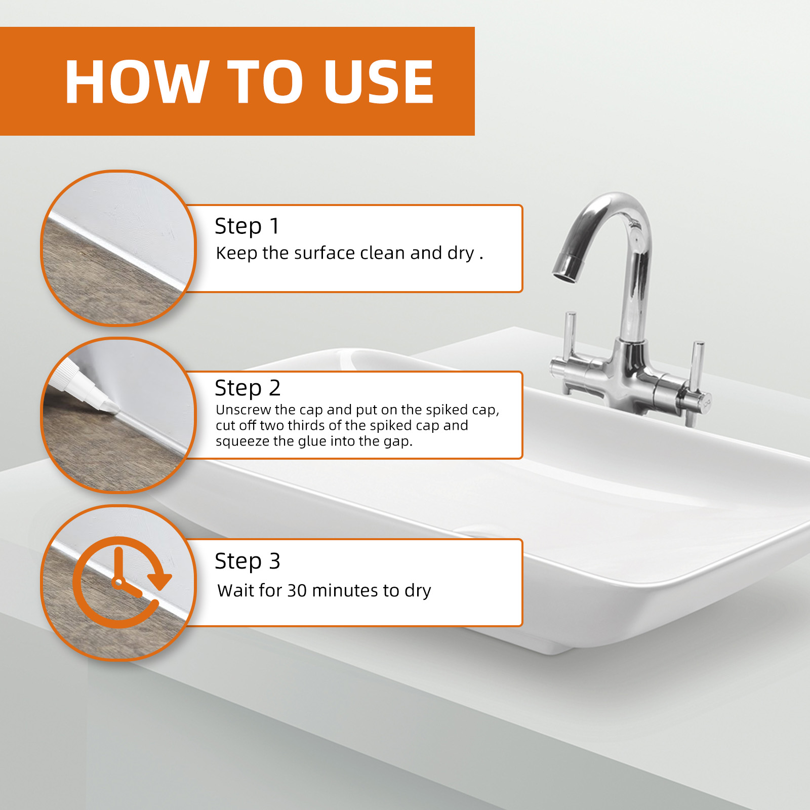 我们的透明防水密封胶含有聚二甲基硅氧烷,聚氨酯,甲基丙烯酸甲酯。它可以能有效阻止水分渗透,防止墙面、地面等结构受潮,保持环境干爽清洁。它的使用方法很简单:保持表面清洁和干燥,拧下产品瓶盖,戴上尖嘴,把尖嘴切掉三分之二,把胶水挤到缝隙里,等待30分钟晾干即可。持久耐用,不会因时间的推移而发生泛黄、收缩或开裂等现象,保持长久可靠的密封效果。适用范围广,适用于搪瓷、金属、乙烯基、层压板、石材、陶瓷、不锈钢、花岗岩、木材、玻璃。