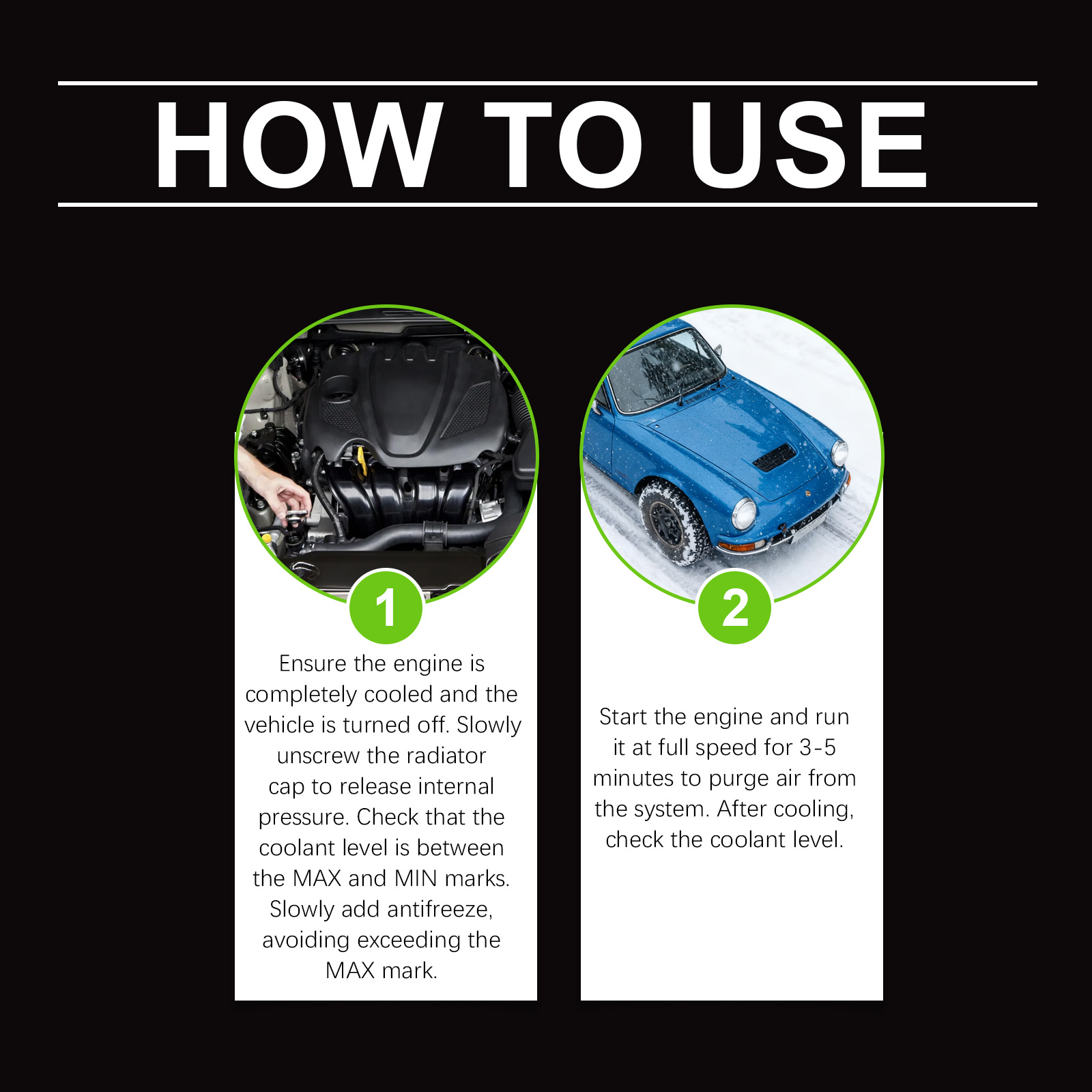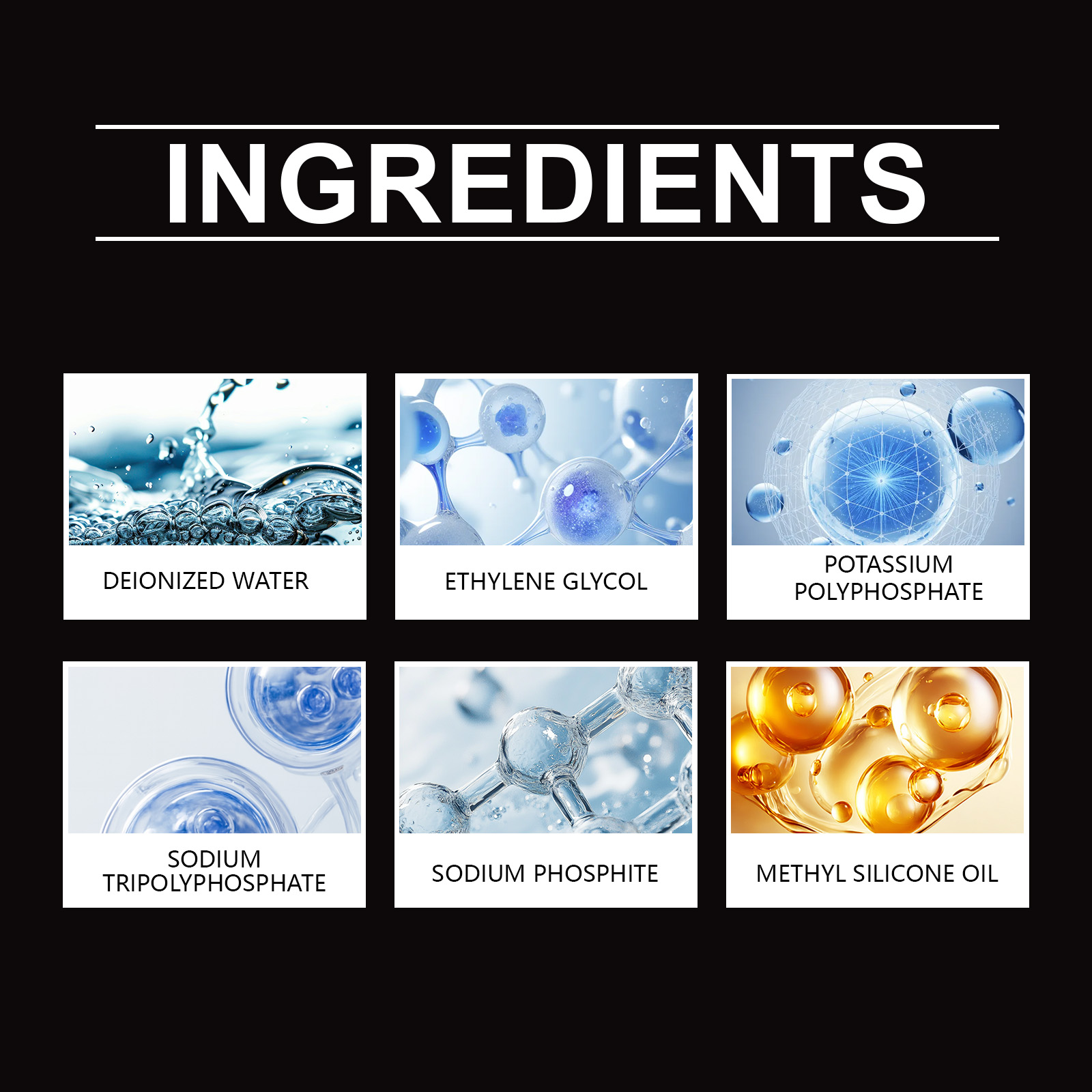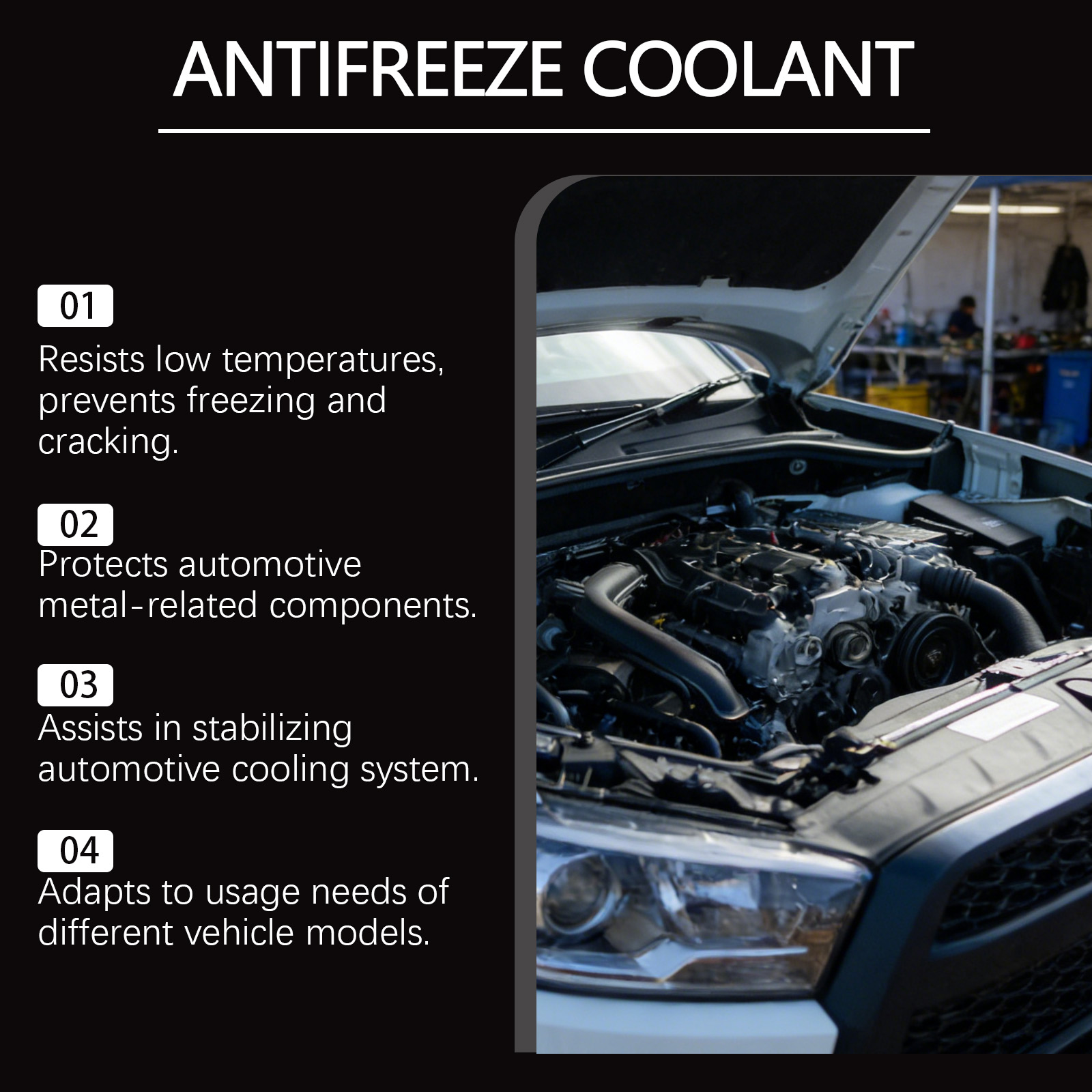 我们的防冻液,由乙二醇、去离子水精心调配而成。专为防止冻结和开裂,保护汽车金属相关部件设计。使用方法极为便捷:确保发动机已完全冷却且车辆已关闭。缓慢旋开散热器盖以释放内部压力。检查冷却液液位是否处于“MAX”和MIN”标记之间。缓慢添加防冻液,避免超过“MAX”标记。启动发动机并以全速运行3至5分钟,以排出系统中的空气。冷却后检查冷却液位。并且它可以保护金属部件并减少磨损。